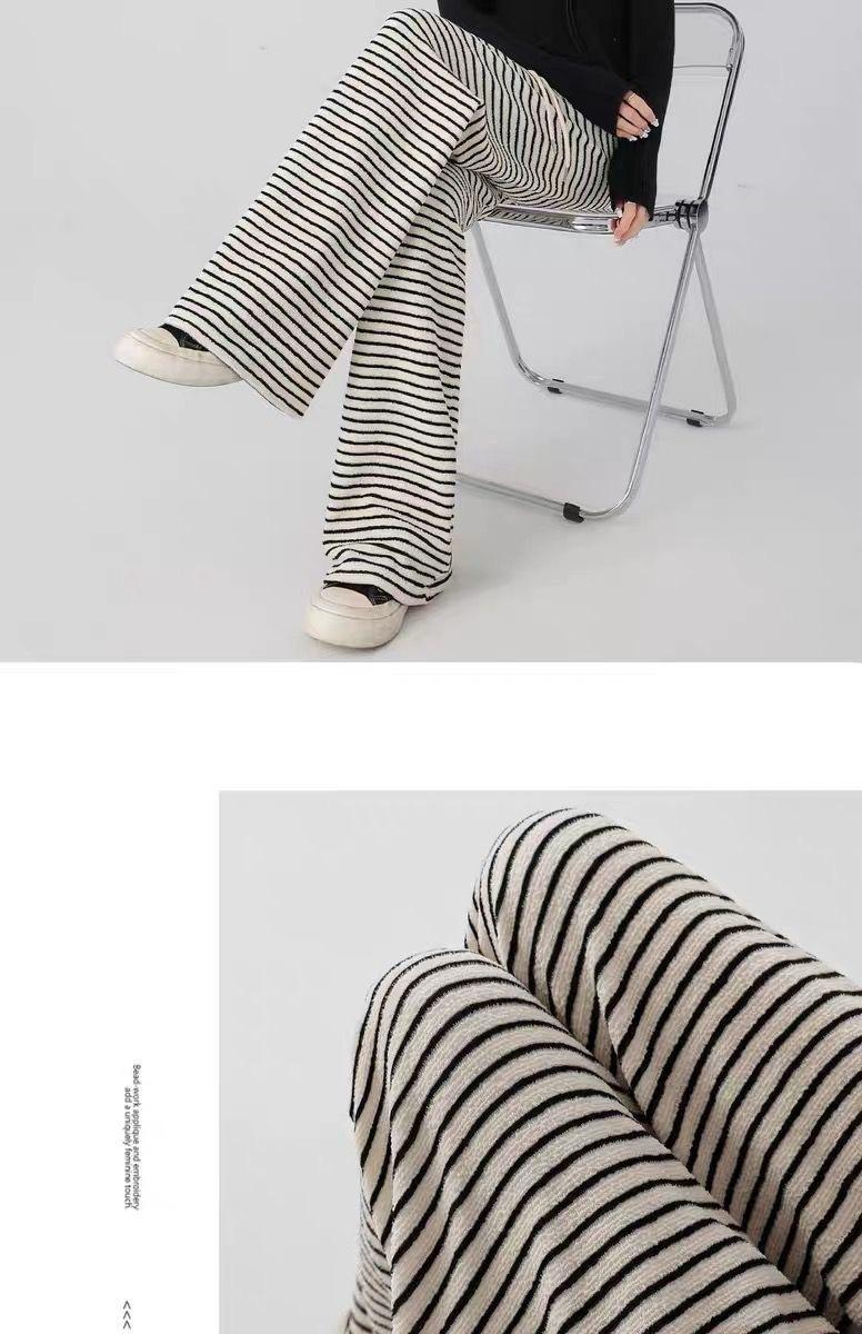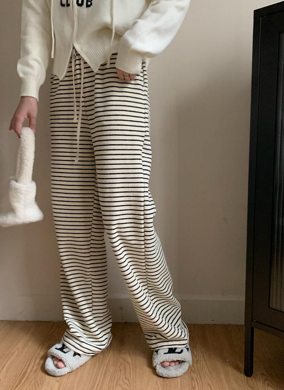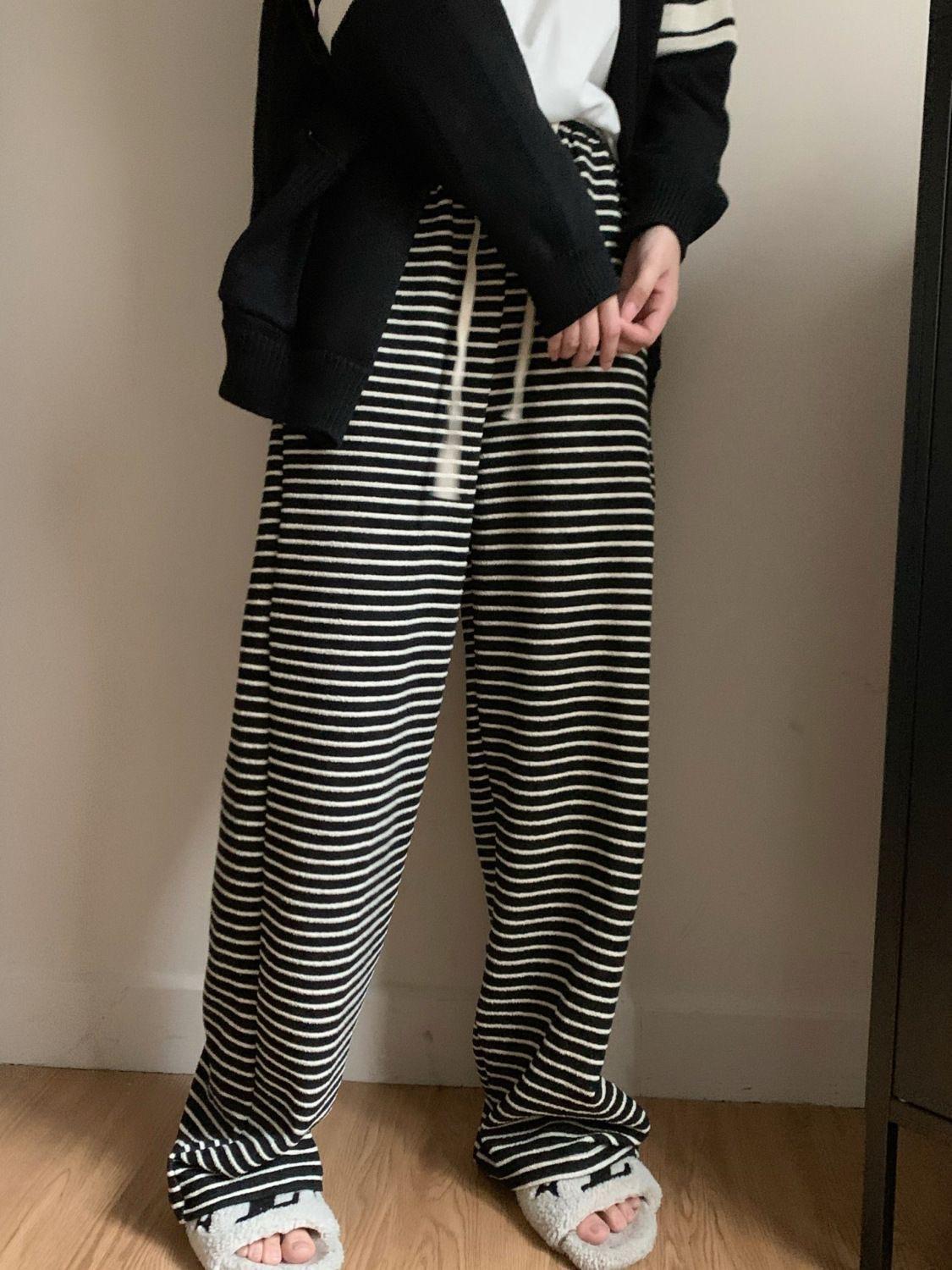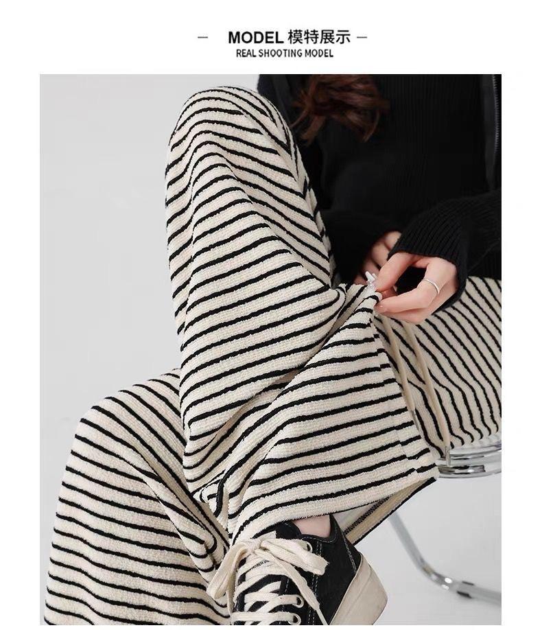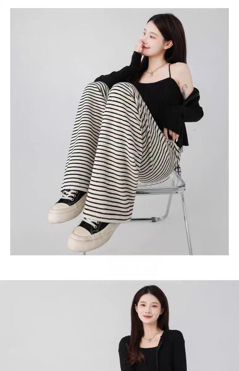 Pantalones de Pierna Ancha de Toalla para Mujer Otoño e Invierno Cintura Alta Caídos Sueltos Adelgazantes Rectos Casuales a Rayas Tejidos