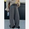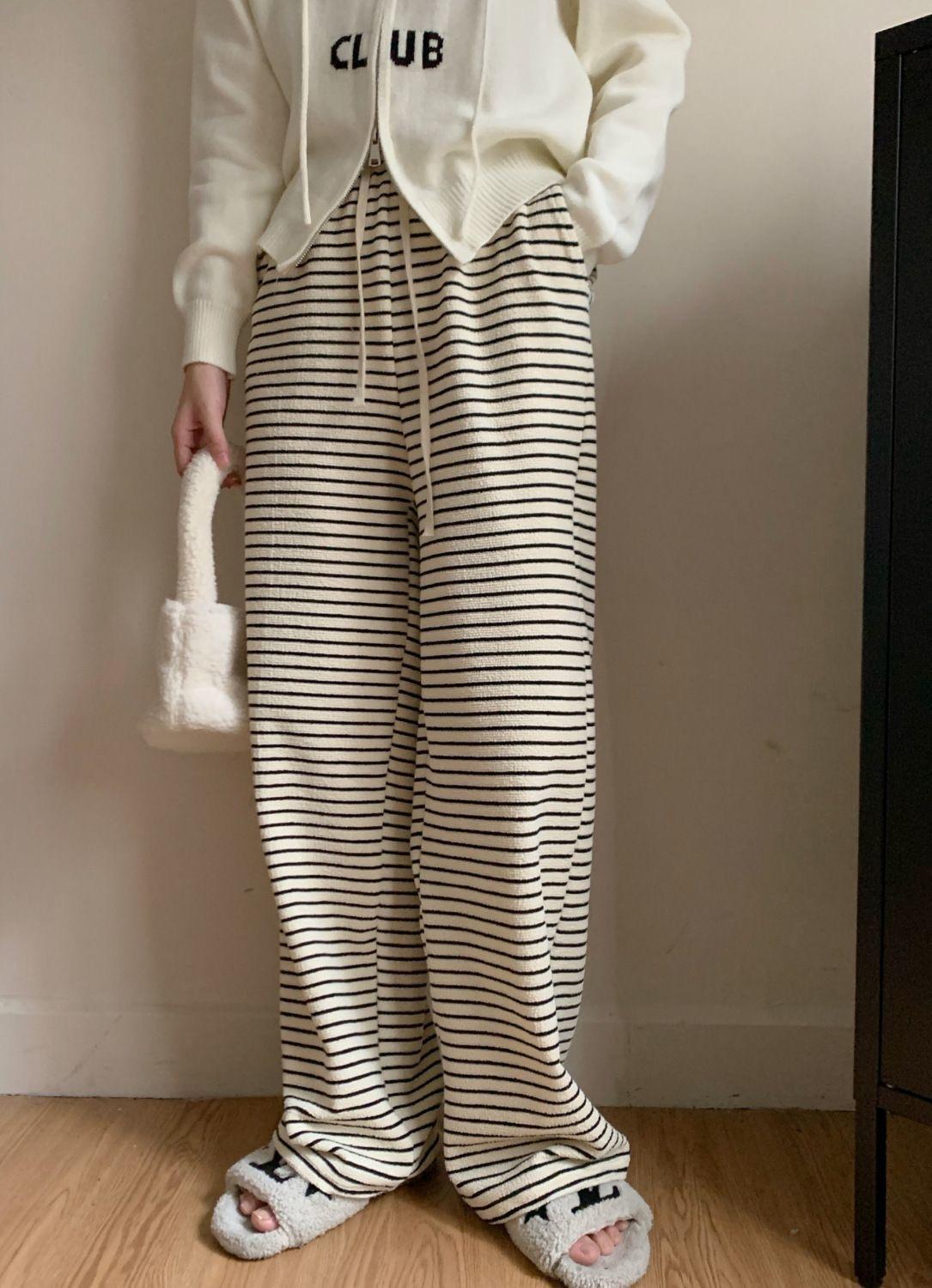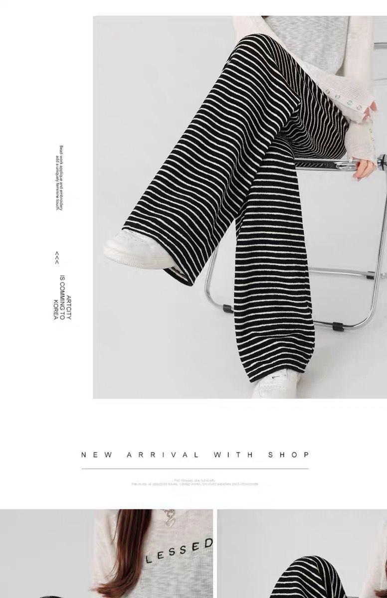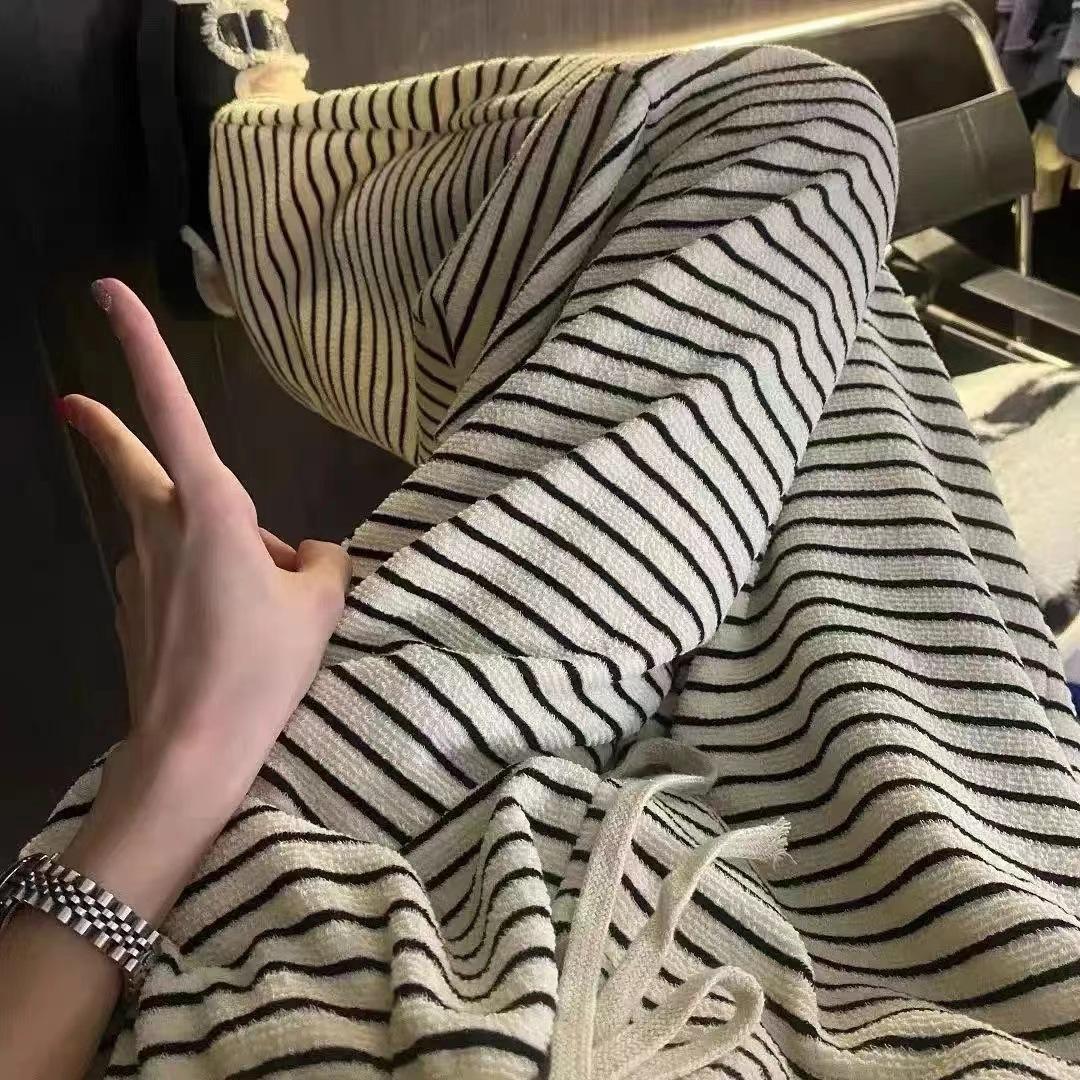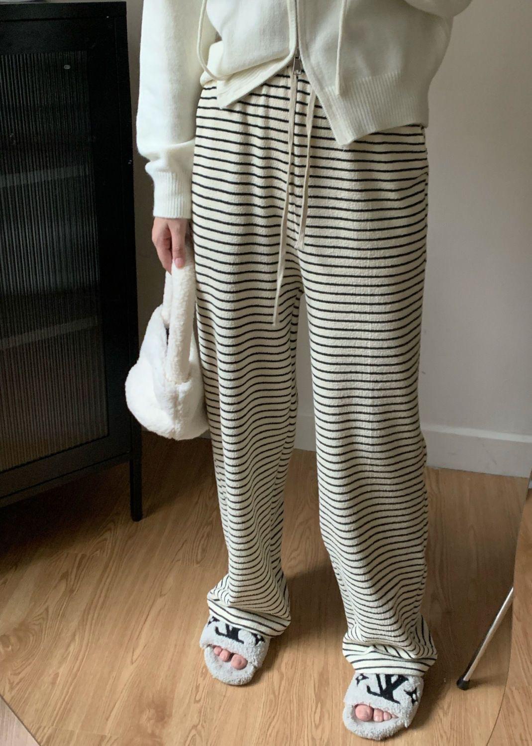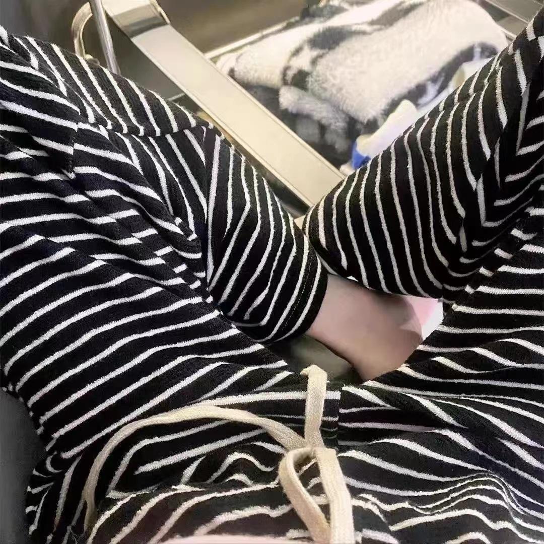 Pantalones de Pierna Ancha de Toalla para Mujer Otoño e Invierno Cintura Alta Caídos Sueltos Adelgazantes Rectos Casuales a Rayas Tejidos