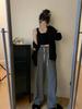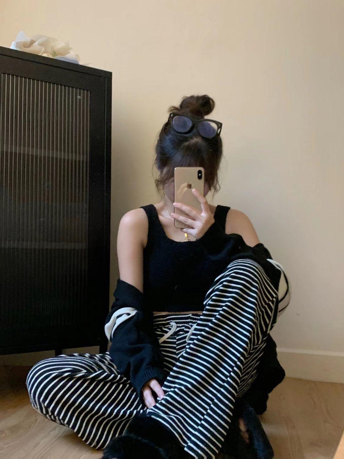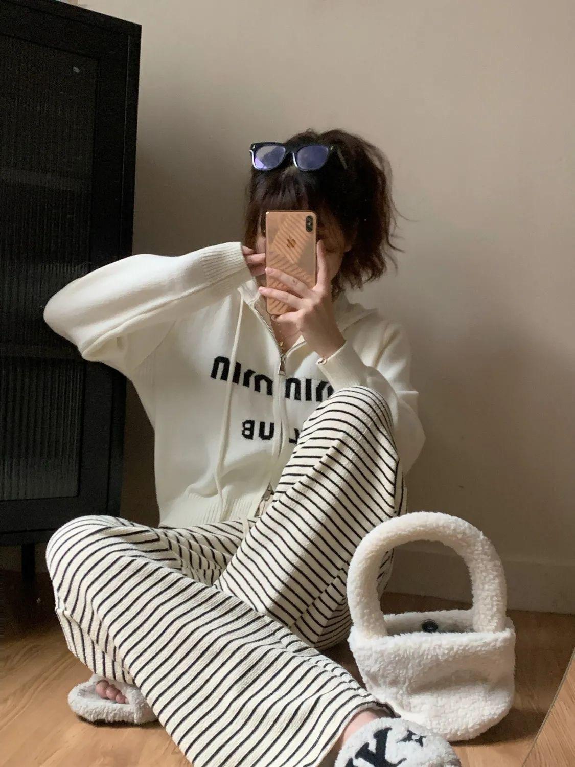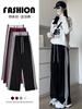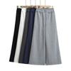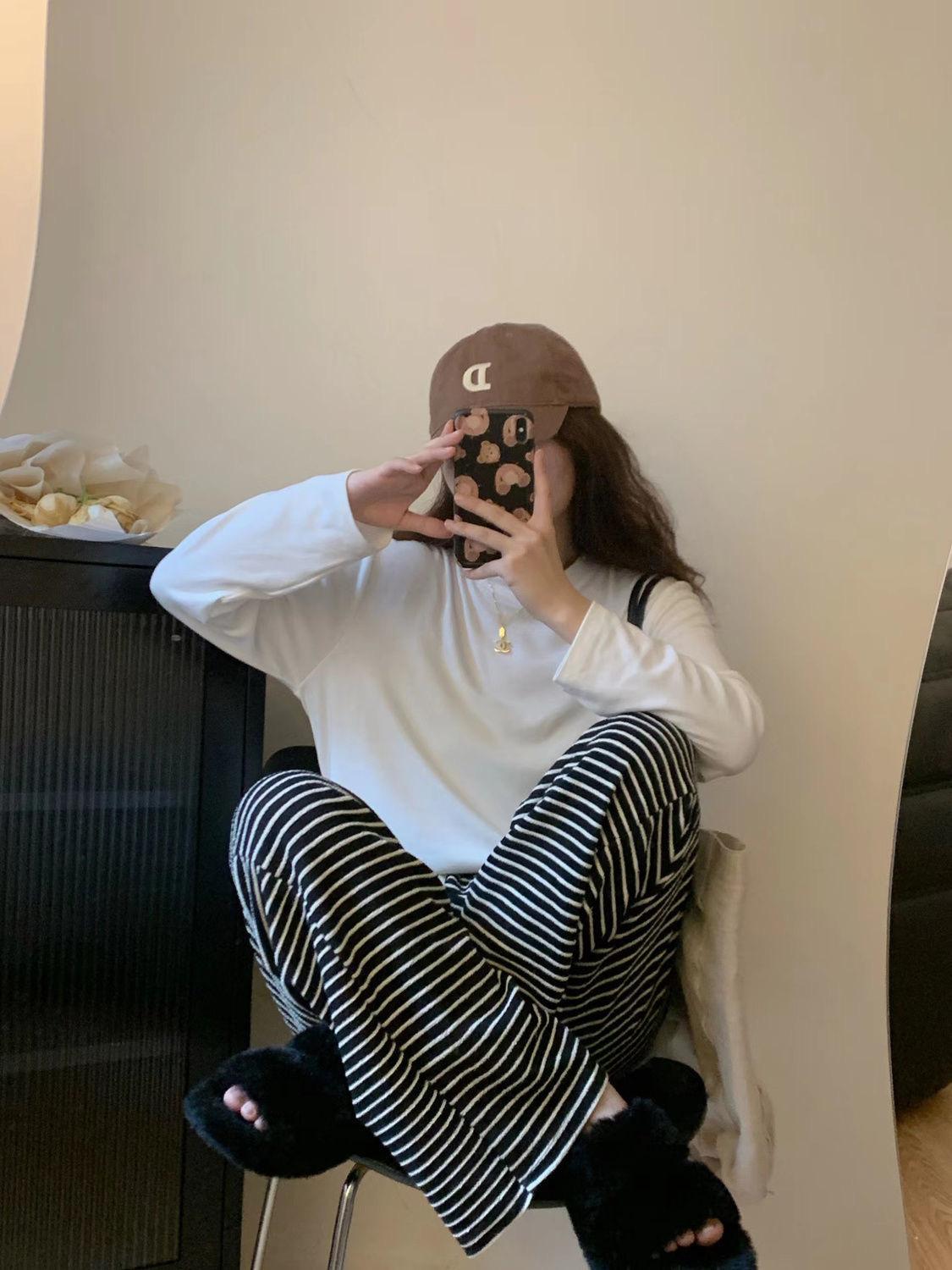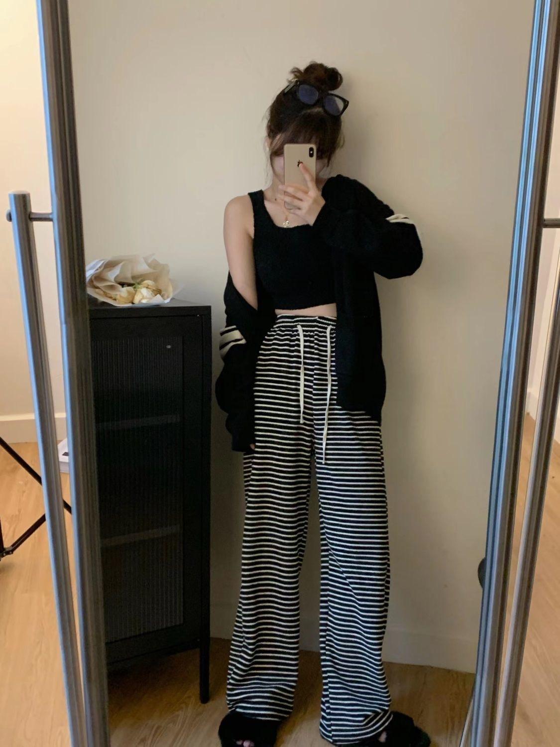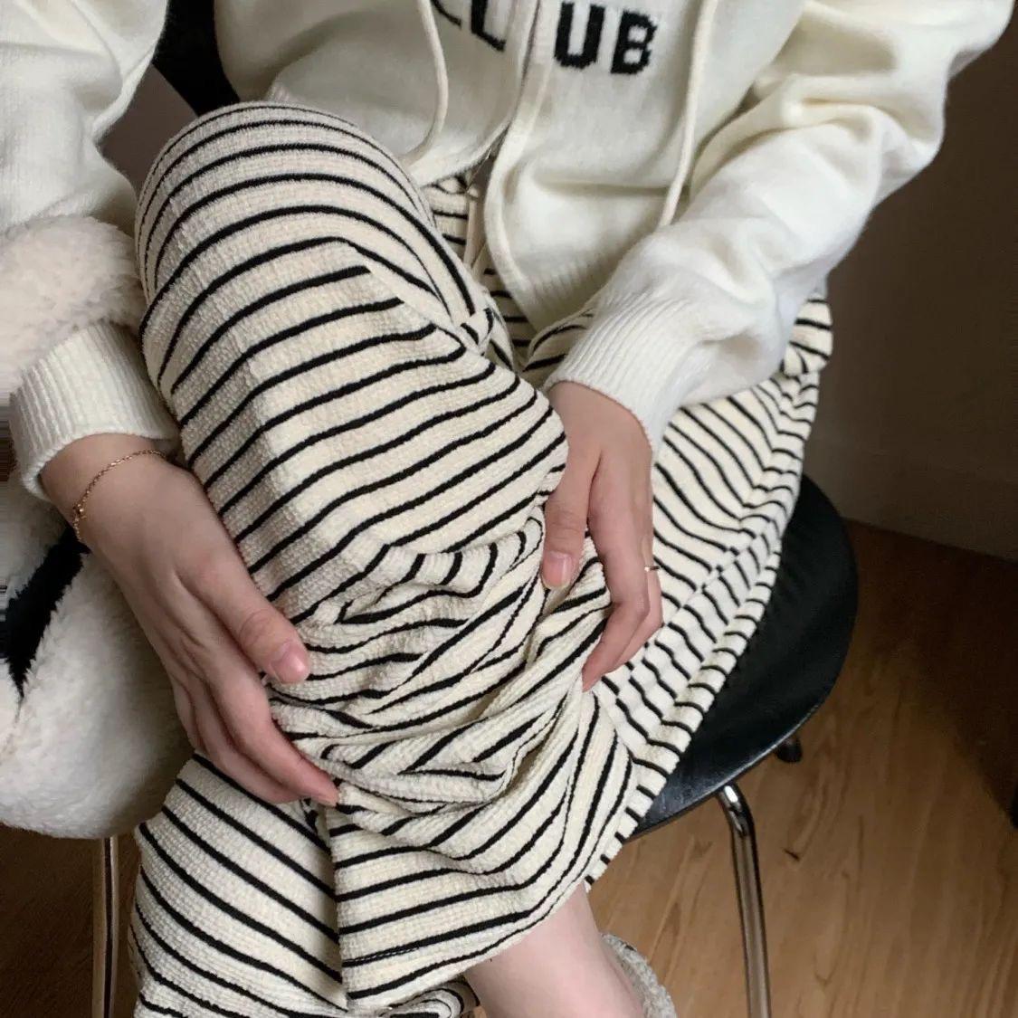 Pantalones de Pierna Ancha de Toalla para Mujer Otoño e Invierno Cintura Alta Caídos Sueltos Adelgazantes Rectos Casuales a Rayas Tejidos
