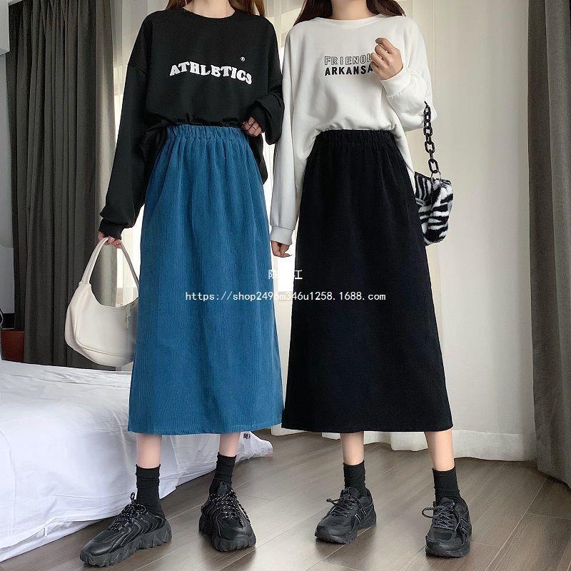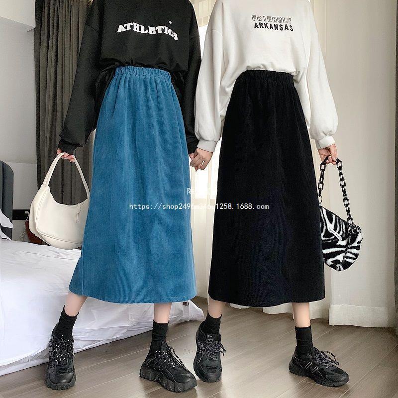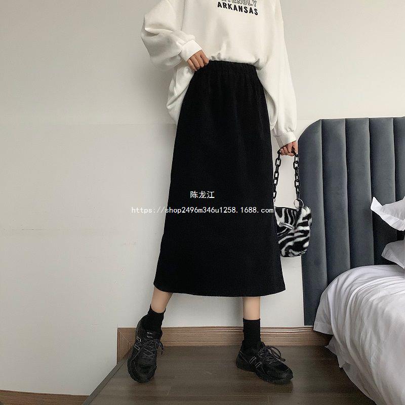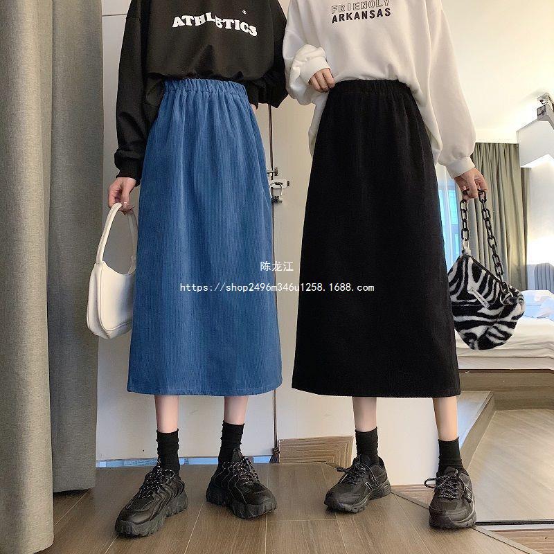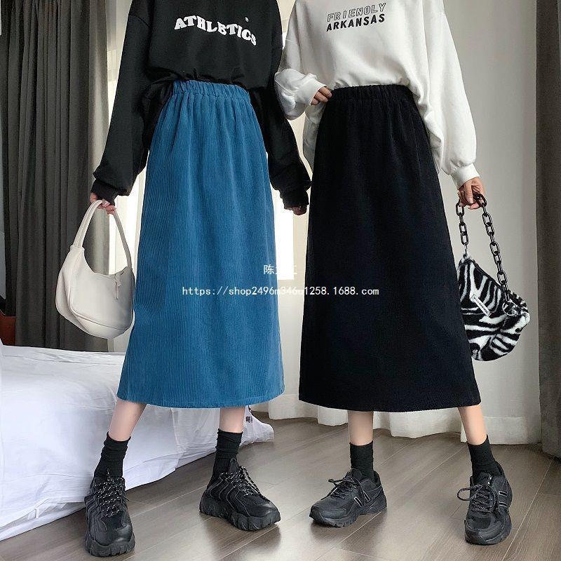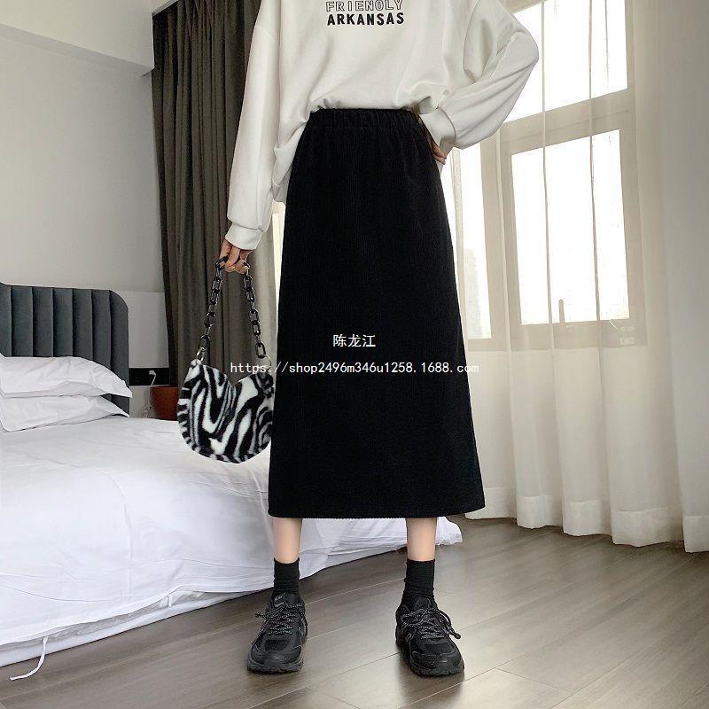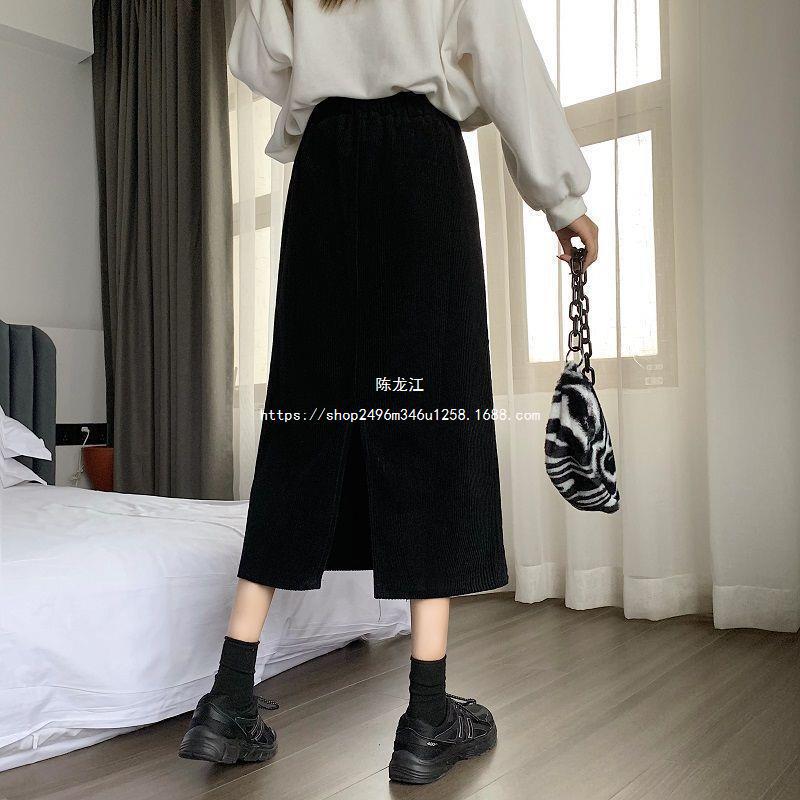 Falda de cintura alta de talla grande con corte A y abertura para mujer, falda negra de cadera para chica gordita, falda de pana de longitud media para otoño e invierno 2023