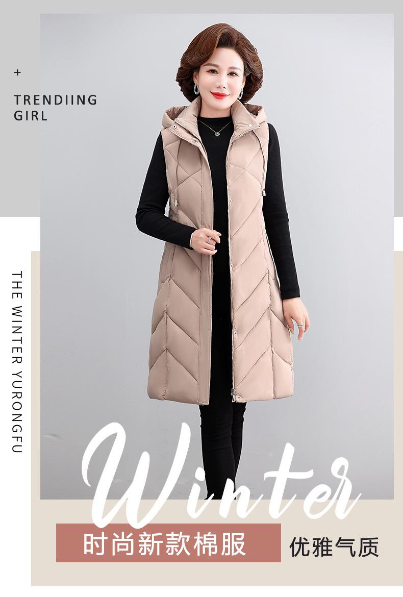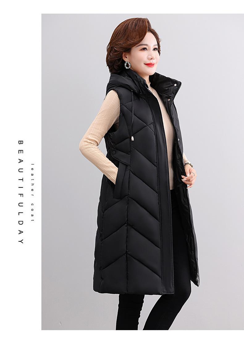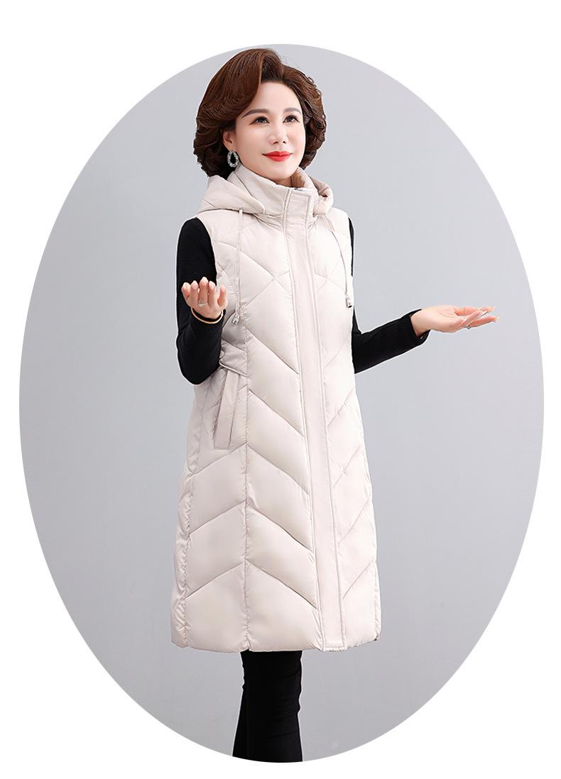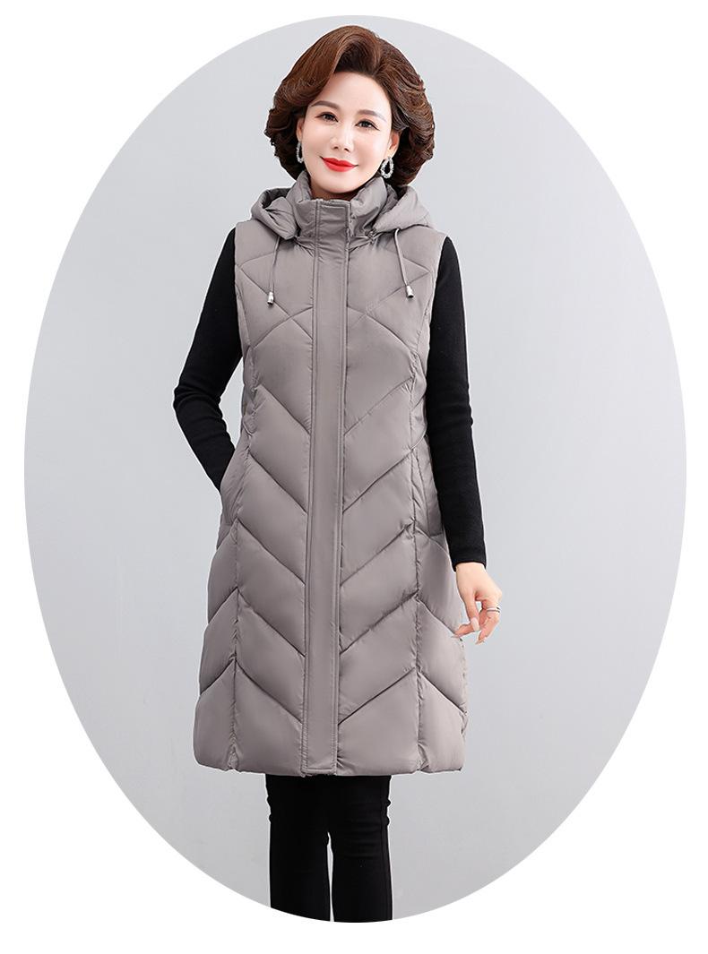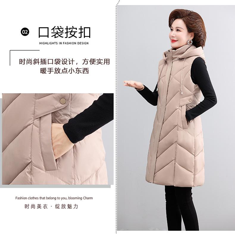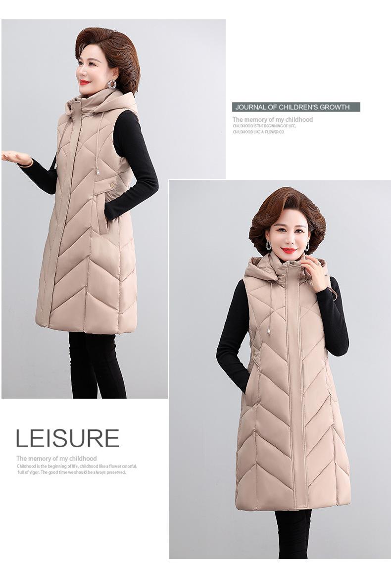2024 otoño e invierno nuevo chaleco de algodón acolchado de plumón para personas de mediana edad y mayores de talla grande para mujer, abrigo chaleco largo con capucha hasta la rodilla