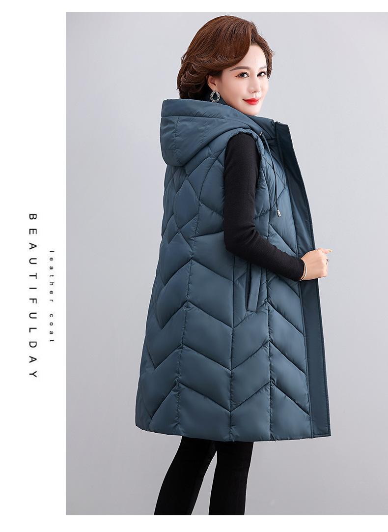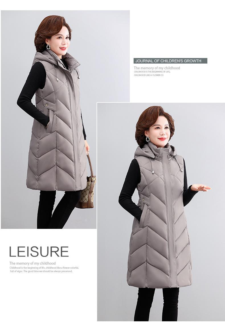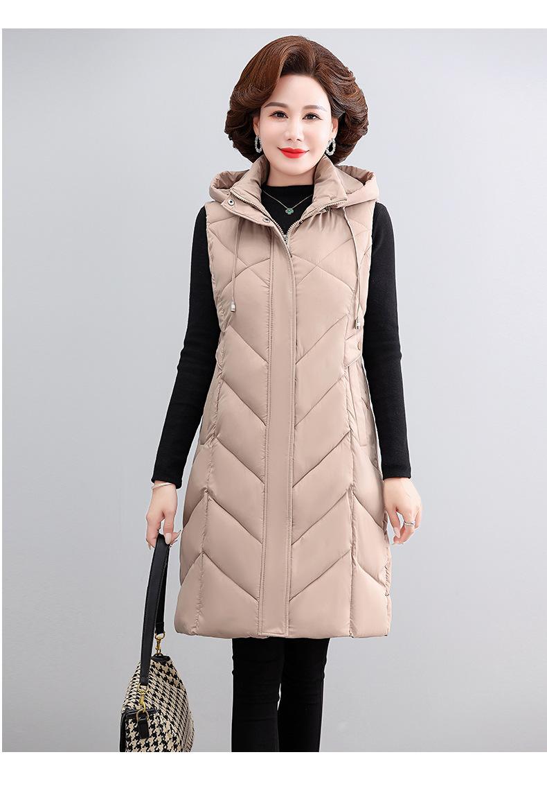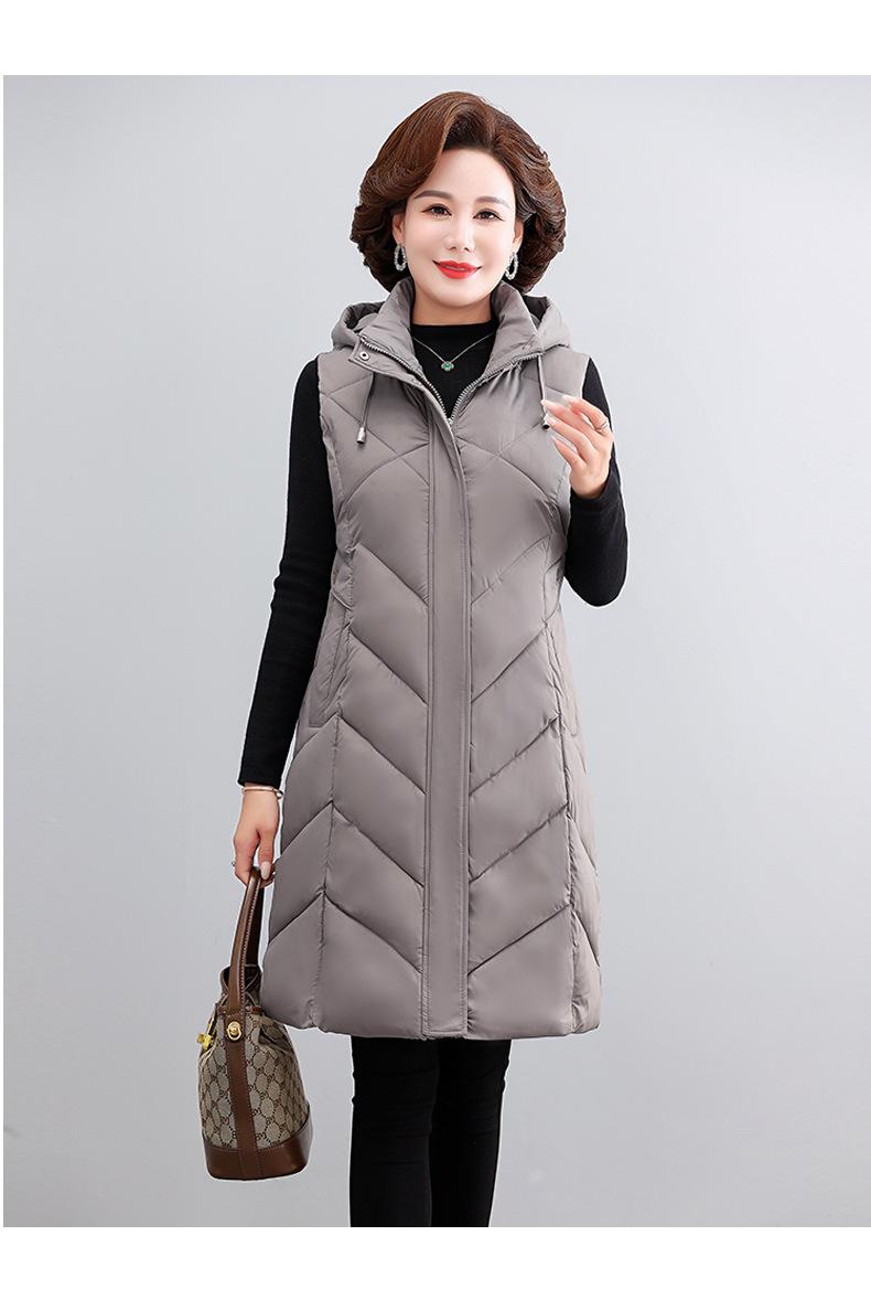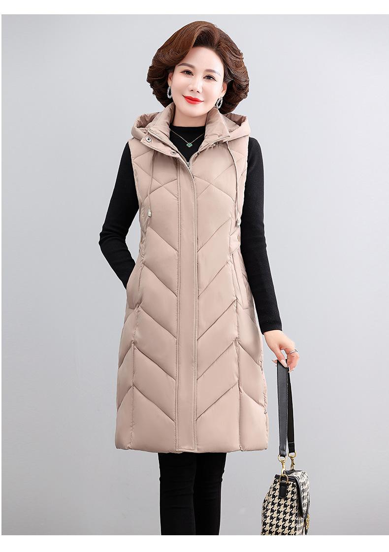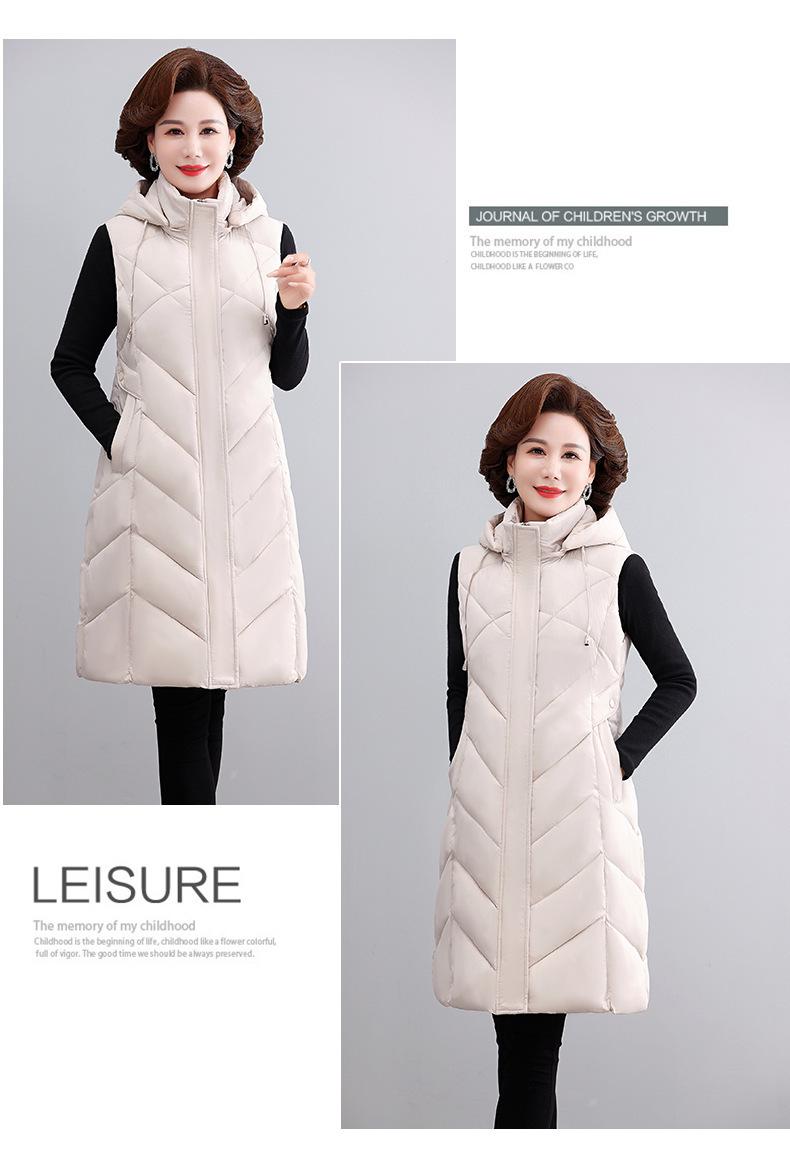 2024 otoño e invierno nuevo chaleco de algodón acolchado de plumón para personas de mediana edad y mayores de talla grande para mujer, abrigo chaleco largo con capucha hasta la rodilla