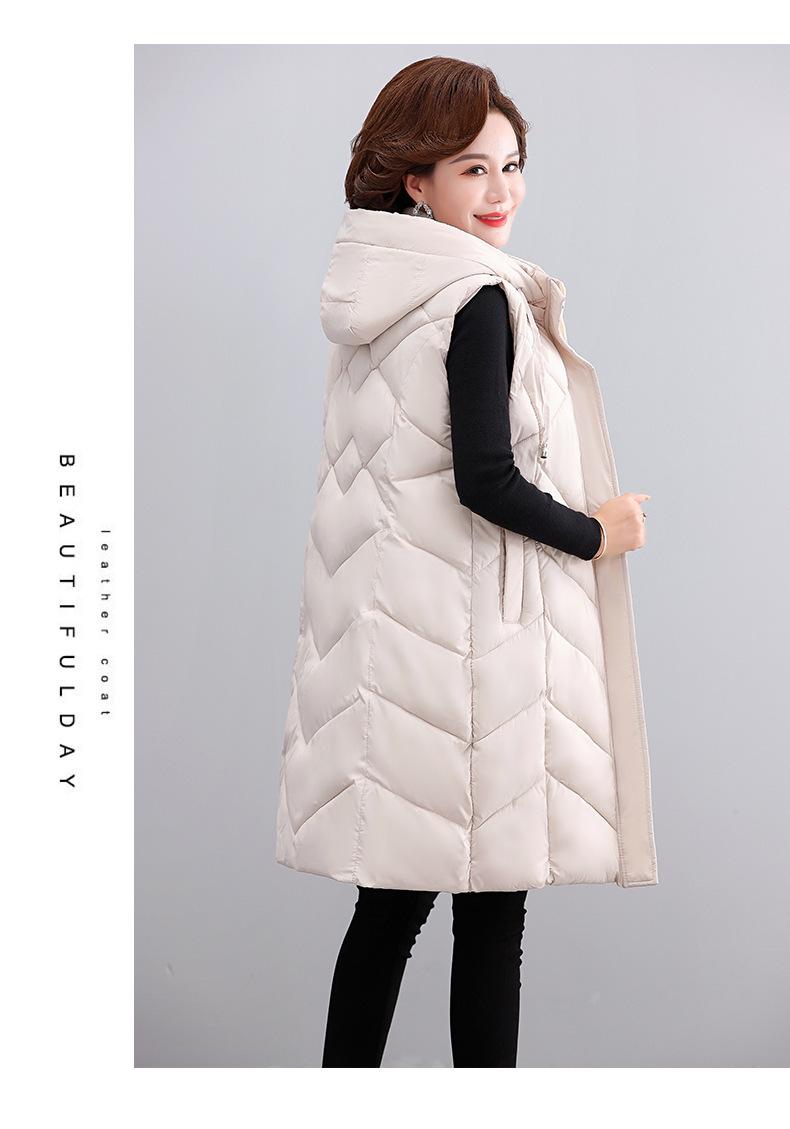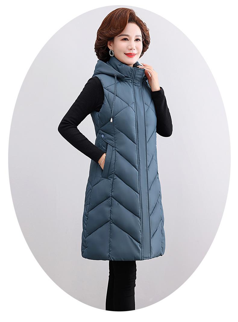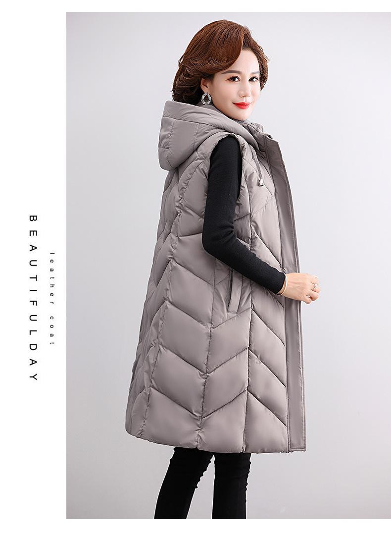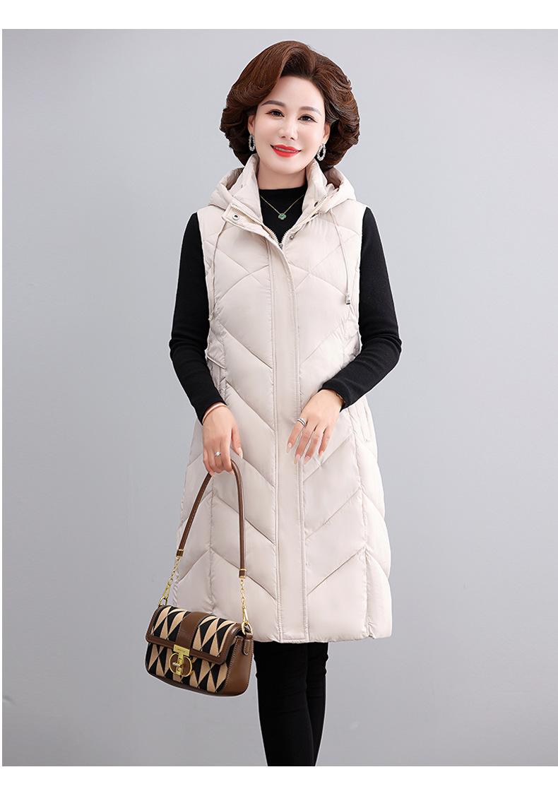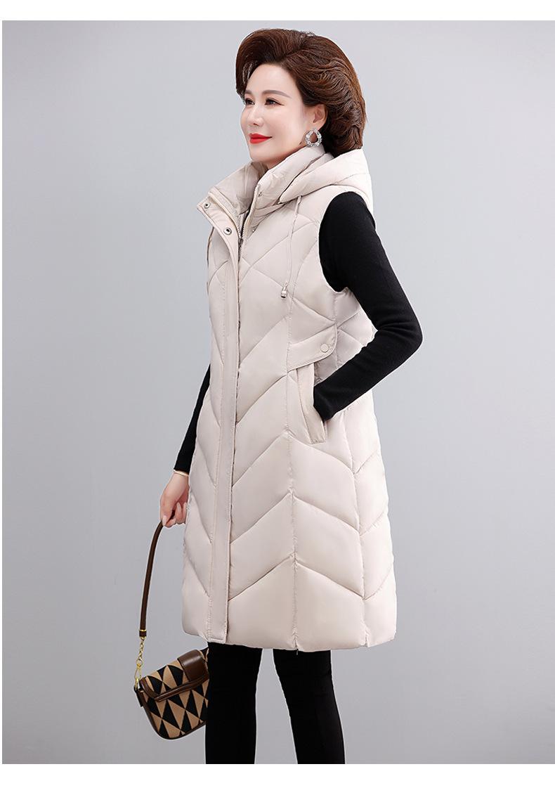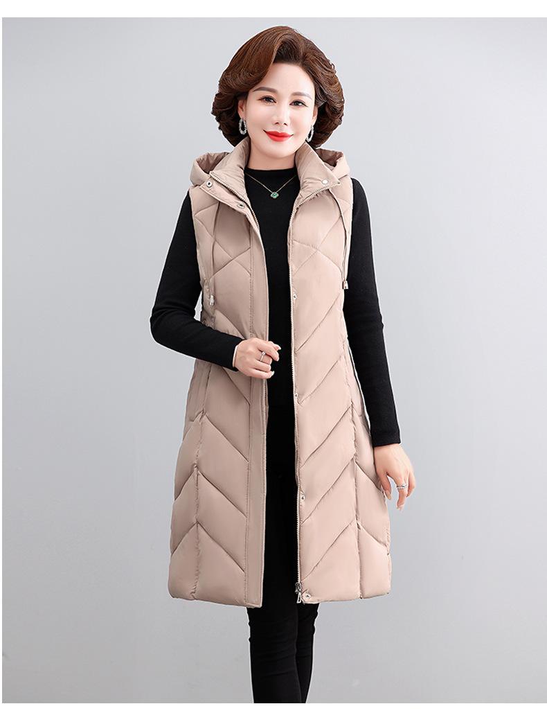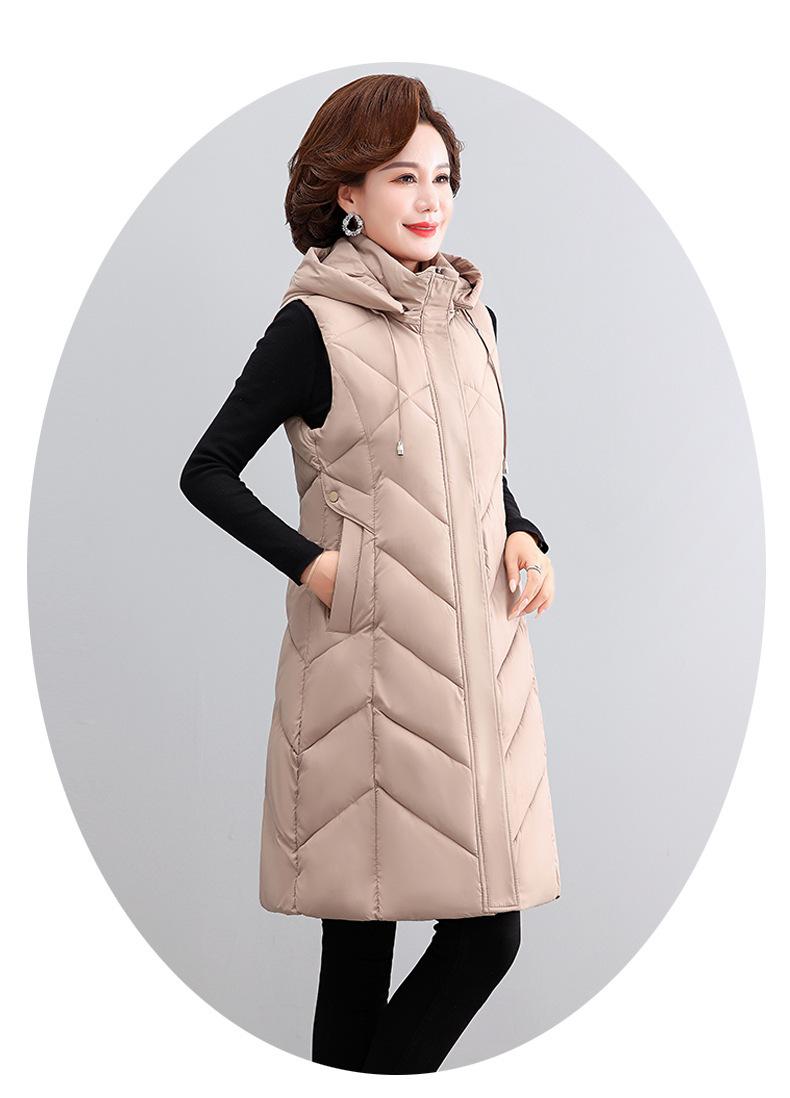 2024 otoño e invierno nuevo chaleco de algodón acolchado de plumón para personas de mediana edad y mayores de talla grande para mujer, abrigo chaleco largo con capucha hasta la rodilla
