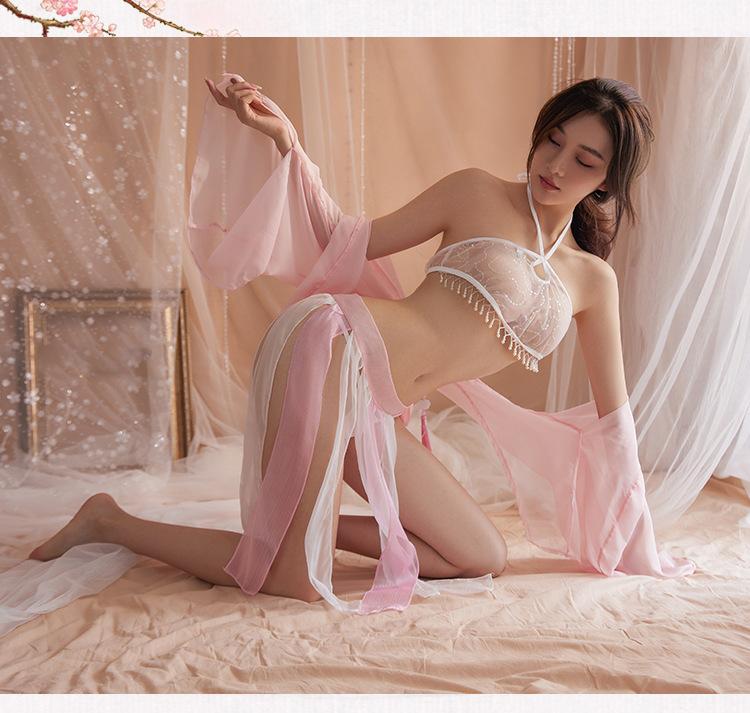 Lencería Sexy con Seductora Malla Transparente Retro, Tentación Transparente, Cinturón de Borlas de Perlas, Conjunto de Estilo Exótico en una Caja