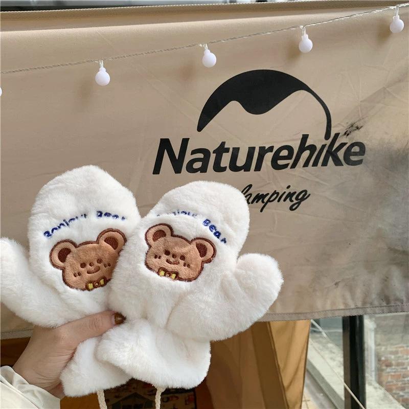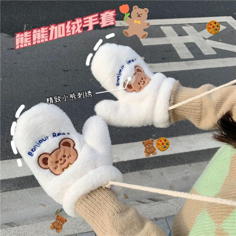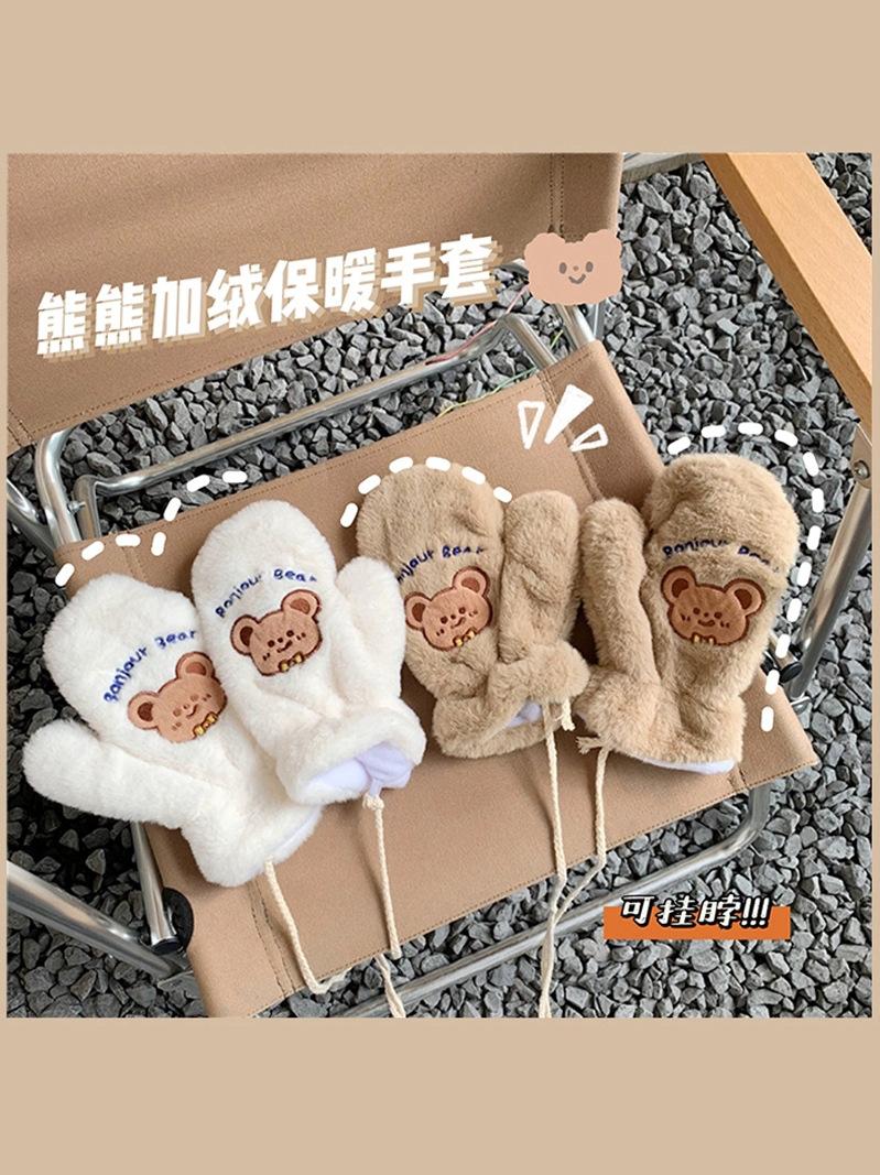 Guantes de invierno gruesos con forro polar cálido y a prueba de viento para ciclismo de estudiante con bonitos dibujos de oso de peluche
