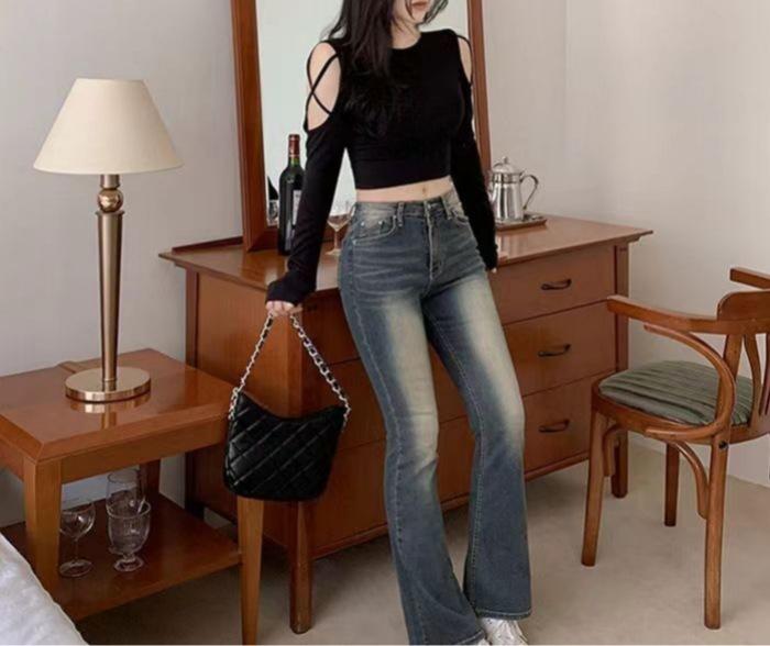 La misma camiseta negra de versión corta para mujer, mangas largas, diseño con hombros descubiertos, nuevo estilo nicho otoño 2023, cintura alta, ombligo expuesto, ajustado