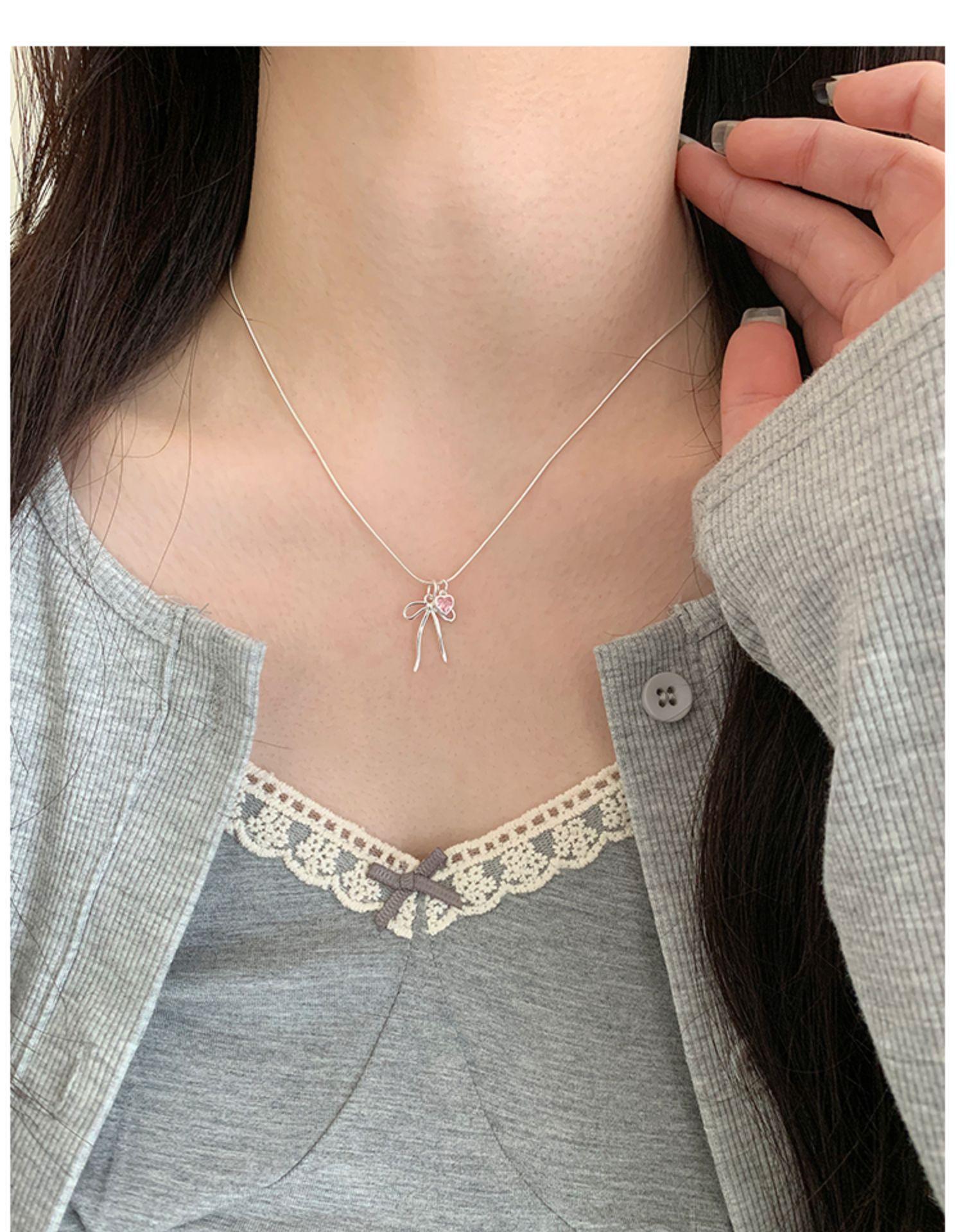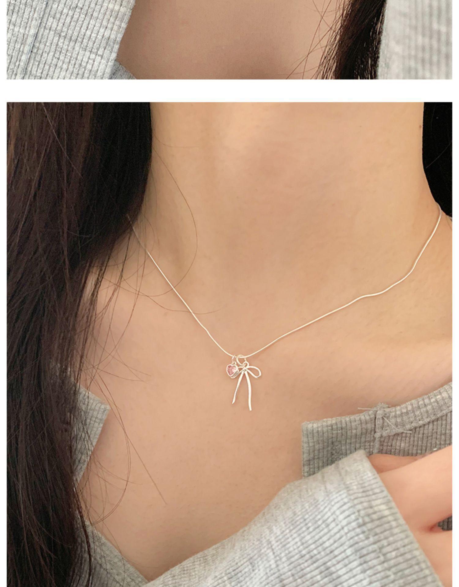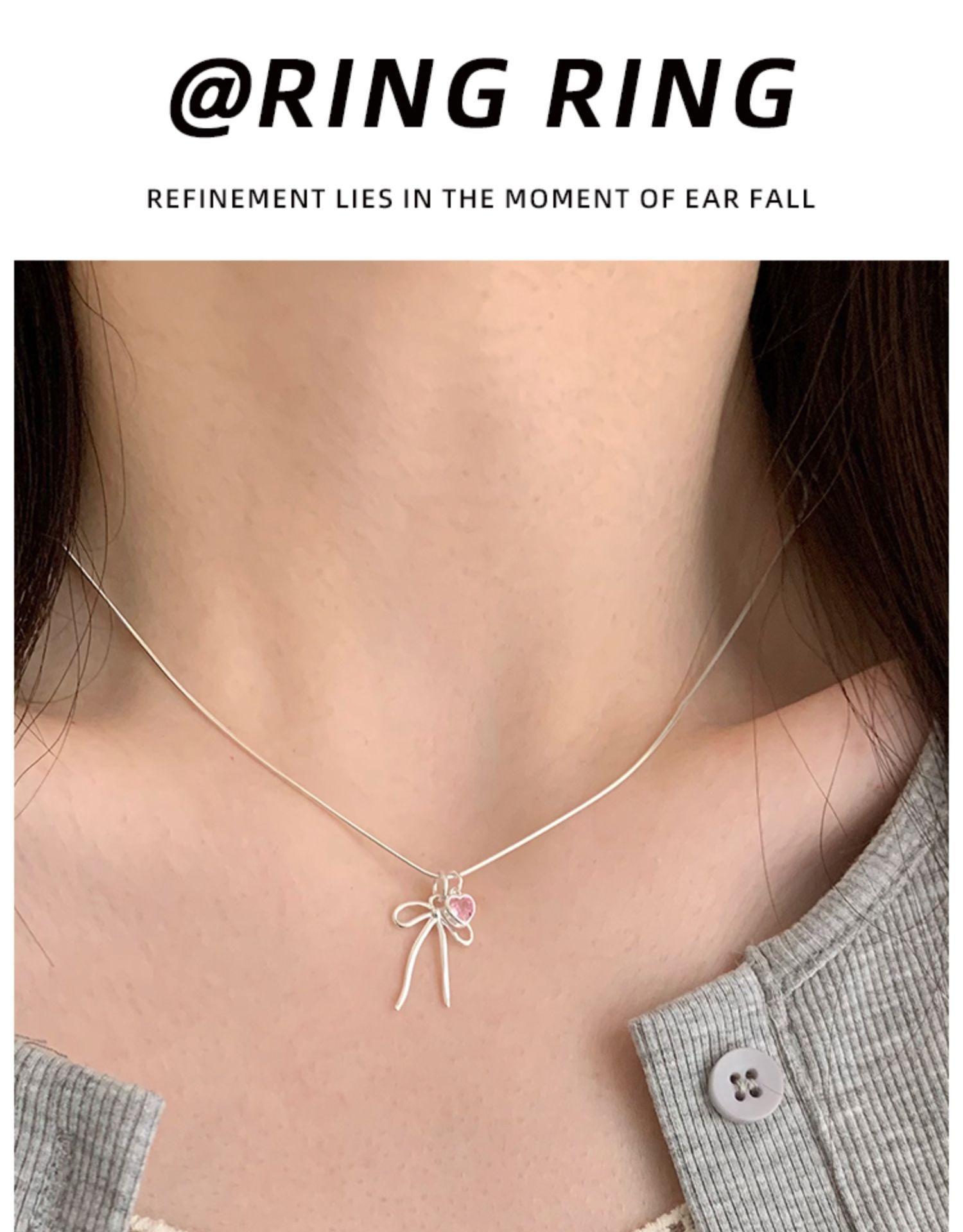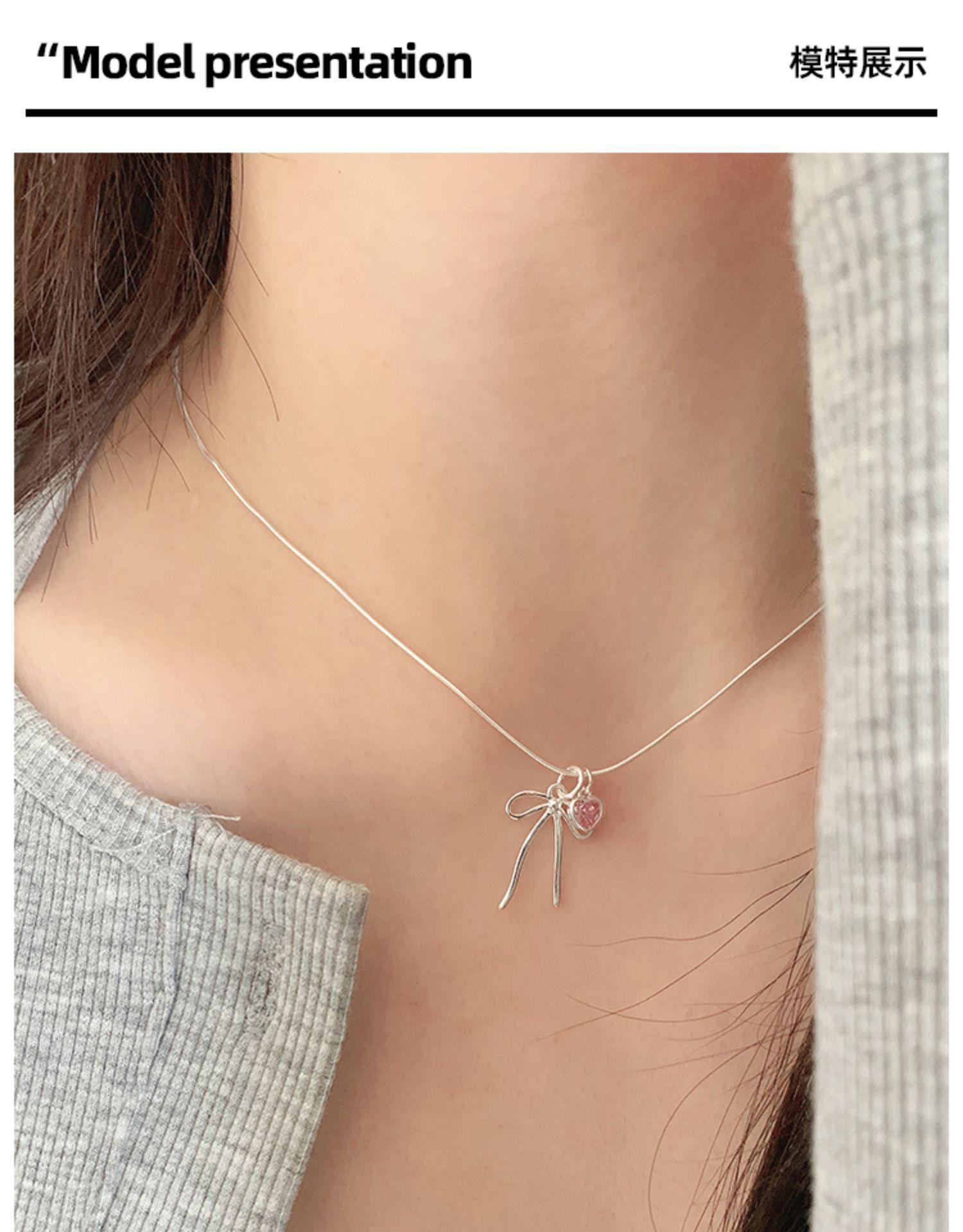 Collar de amor rosa para mujer con lazo geométrico dulce S925, cadena de clavícula chapada en plata, cadena de cuello de moda