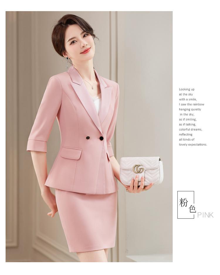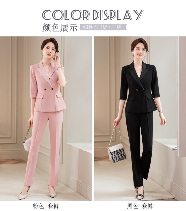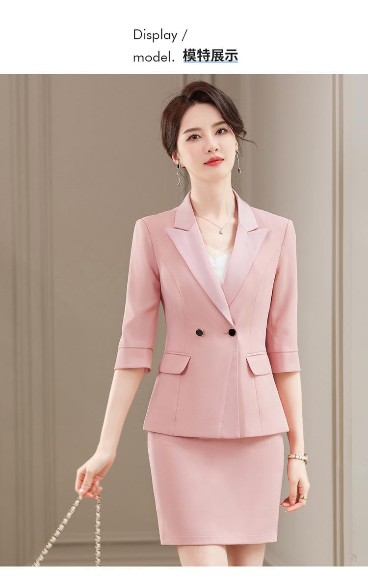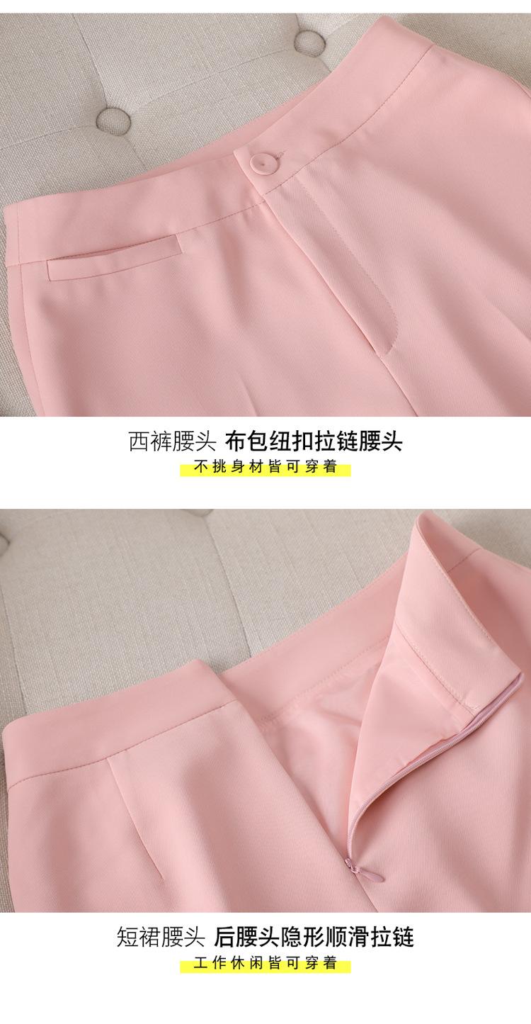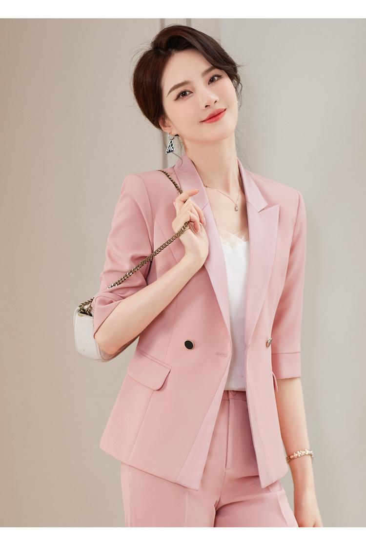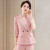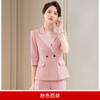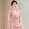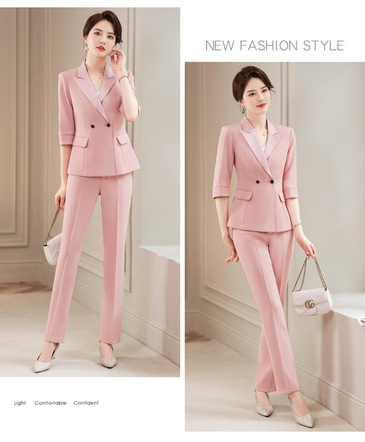 Conjunto de traje rosa de manga media para mujer, primavera y verano 2023, estilo formal, con cuello blanco y cintura ajustada.