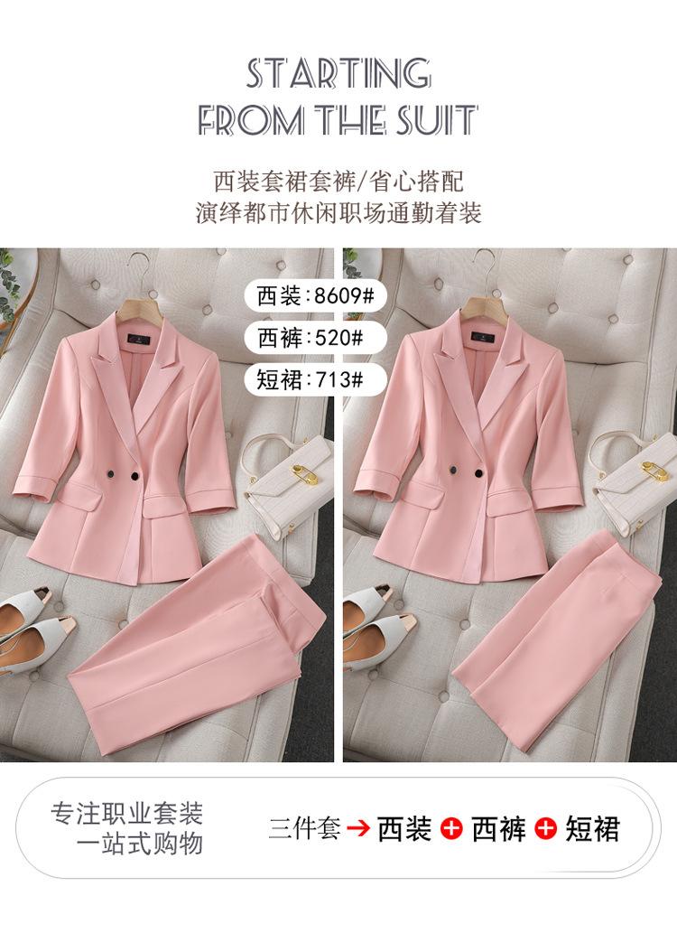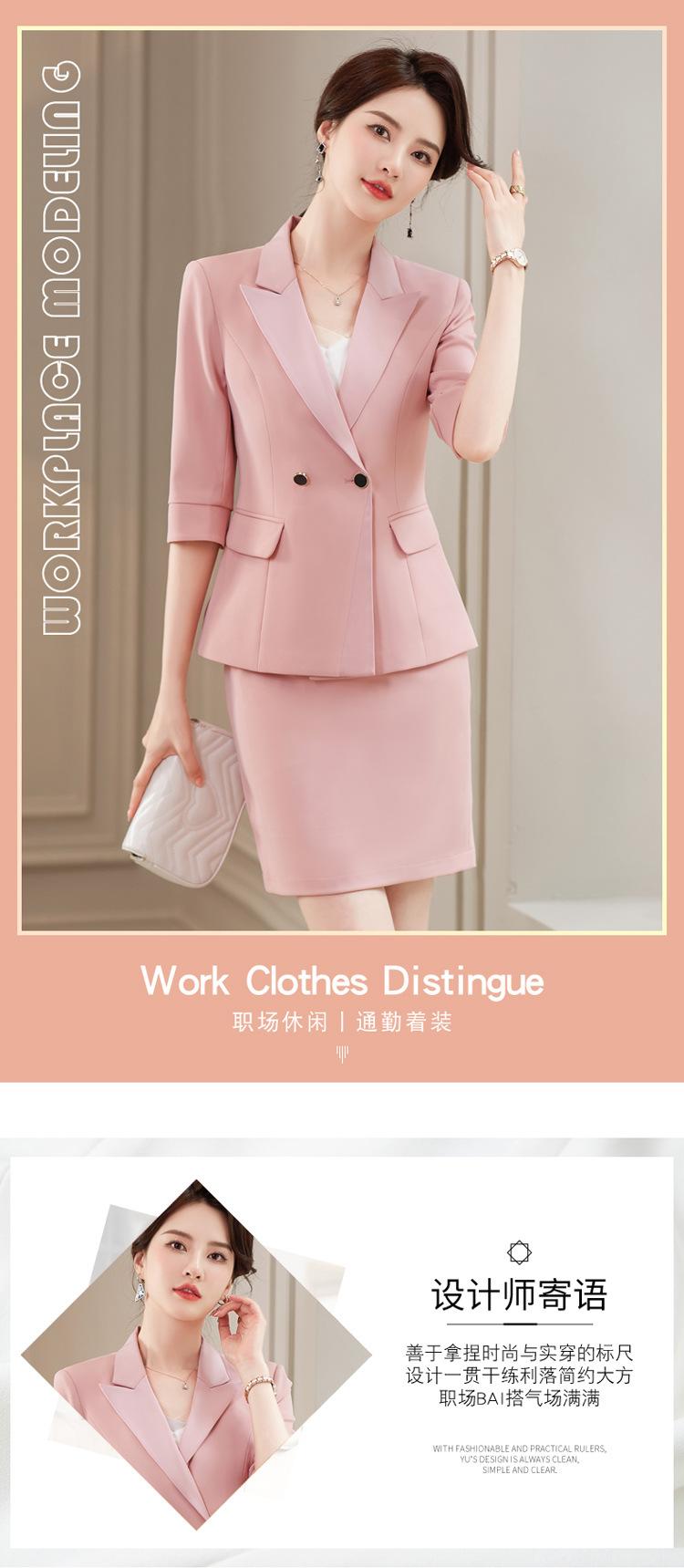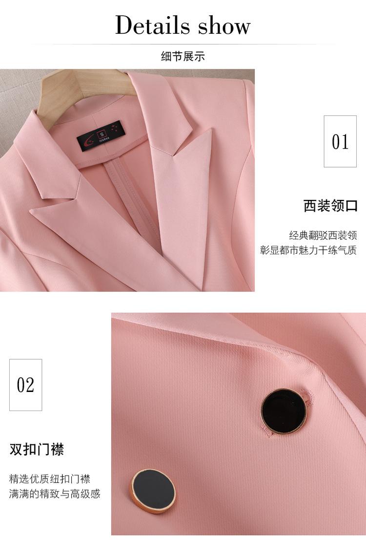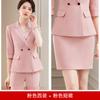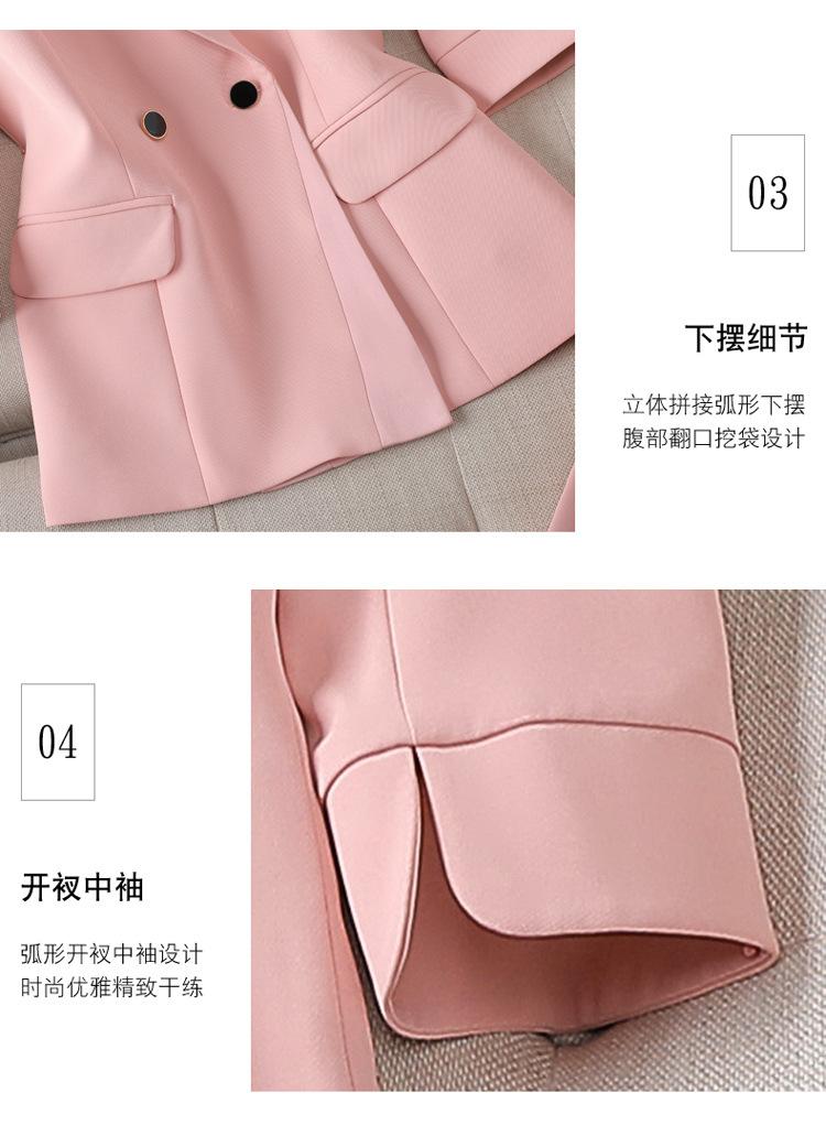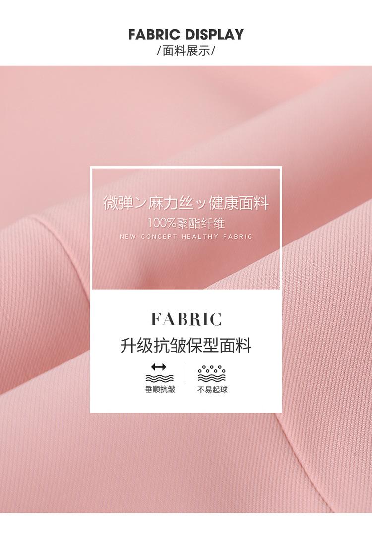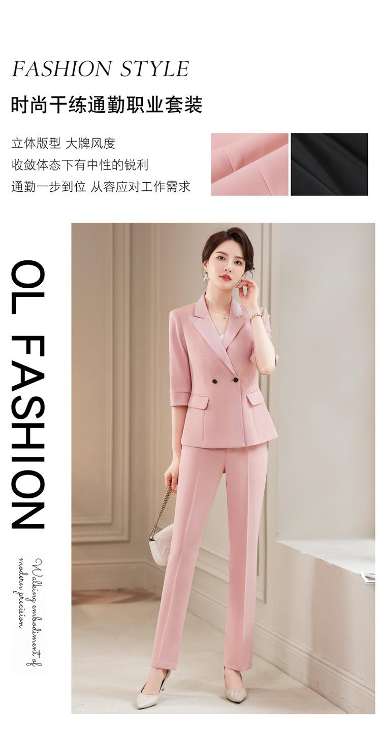 Conjunto de traje rosa de manga media para mujer, primavera y verano 2023, estilo formal, con cuello blanco y cintura ajustada.