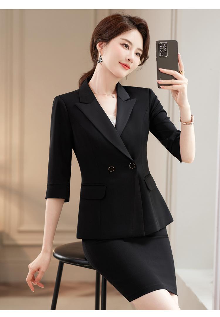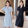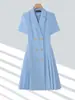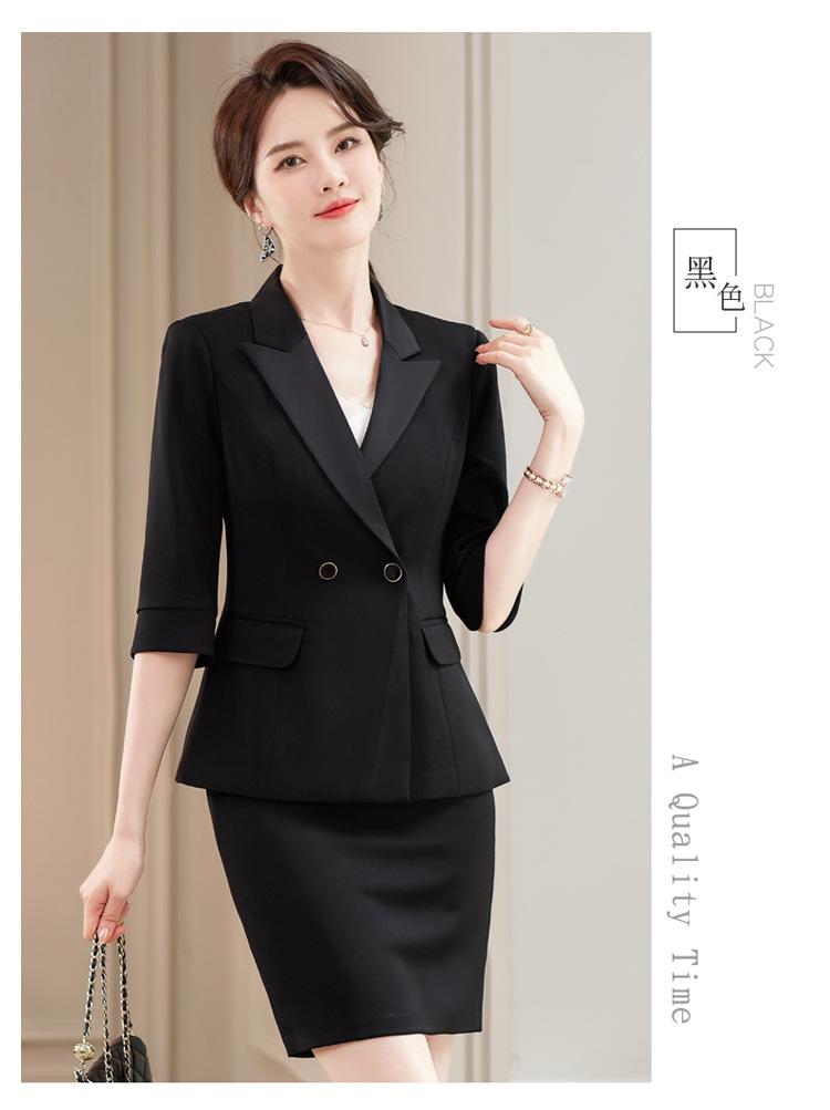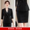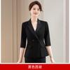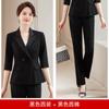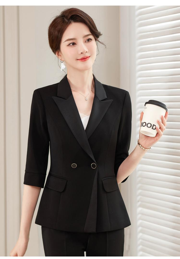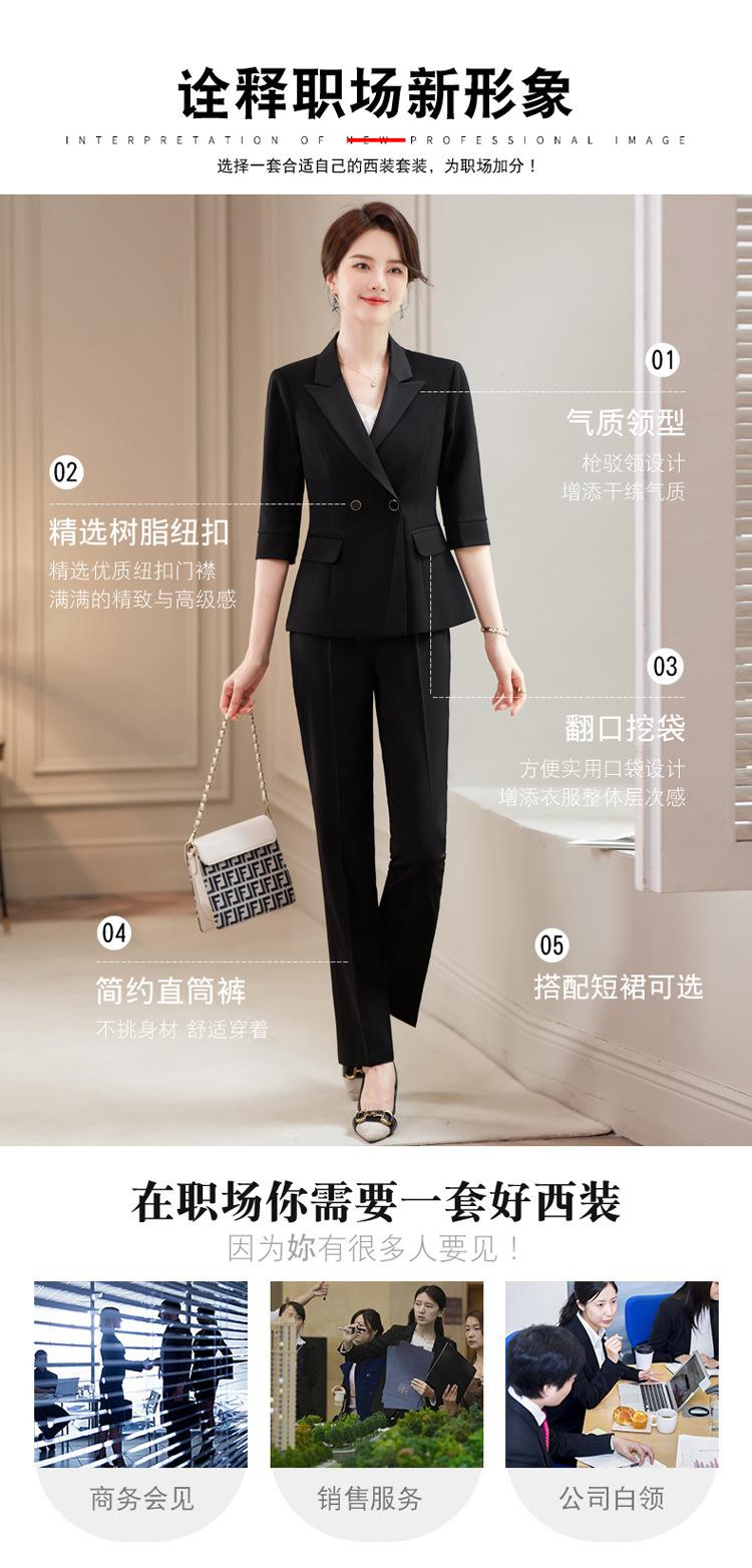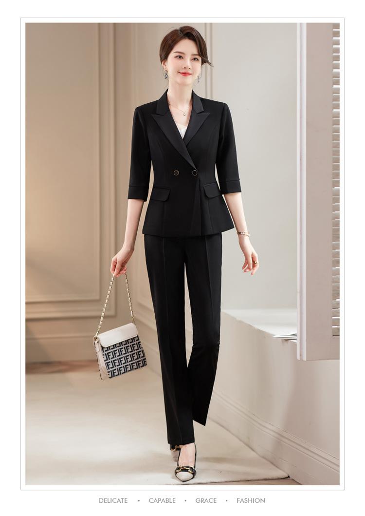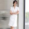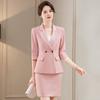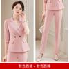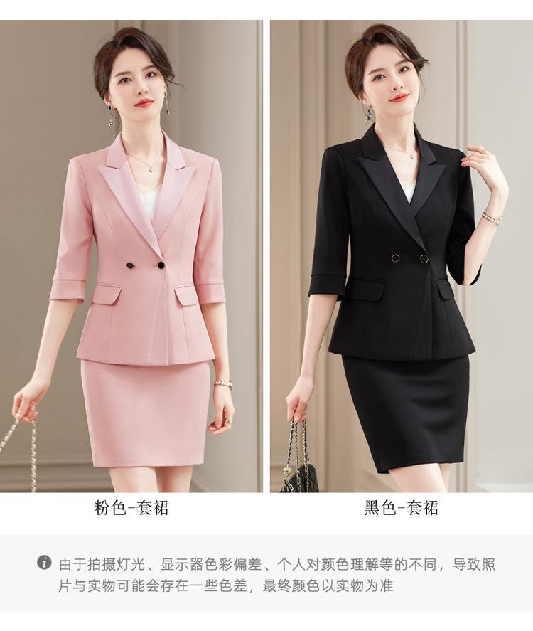 Conjunto de traje rosa de manga media para mujer, primavera y verano 2023, estilo formal, con cuello blanco y cintura ajustada.