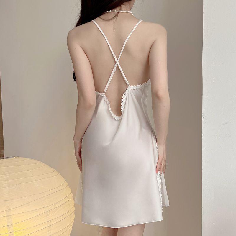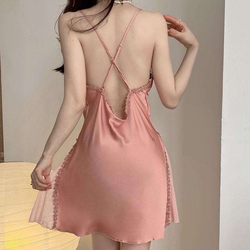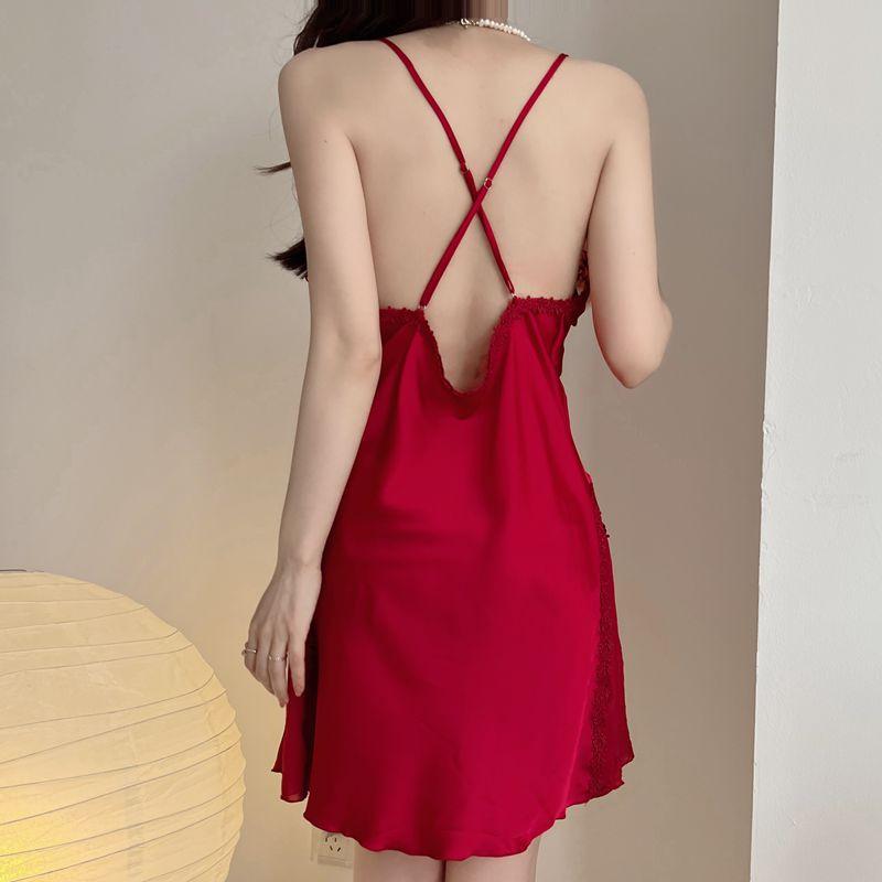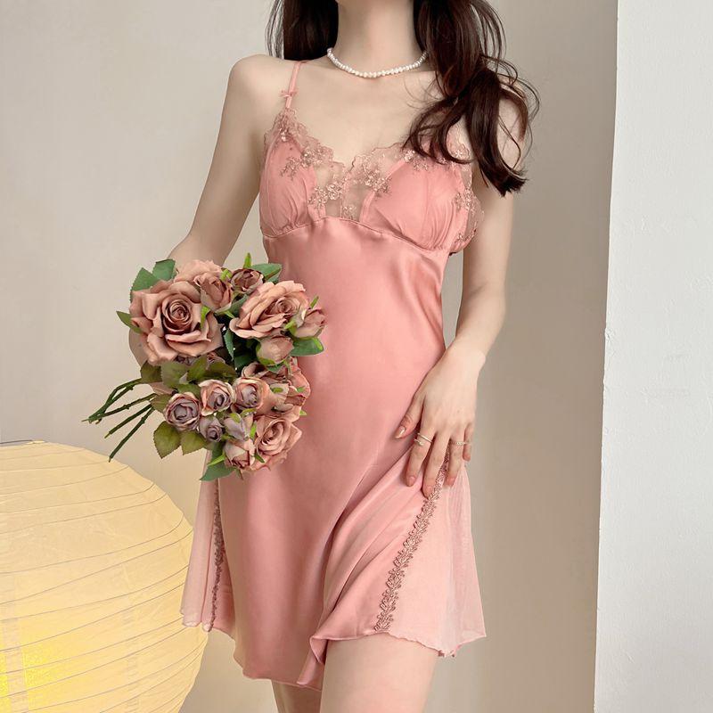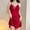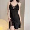 Camisón sexy de verano fino y puro deseo, con cinturón en V profundo y almohadillas para el pecho, de encaje, para mujer, con tirantes de seda helada emocional