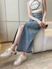 Falda de Mezclilla Retro con Abertura para Mujer Verano 2024 Cintura Alta Efecto Adelgazante Borde Crudo Línea A Largo Medio Estilo Literario