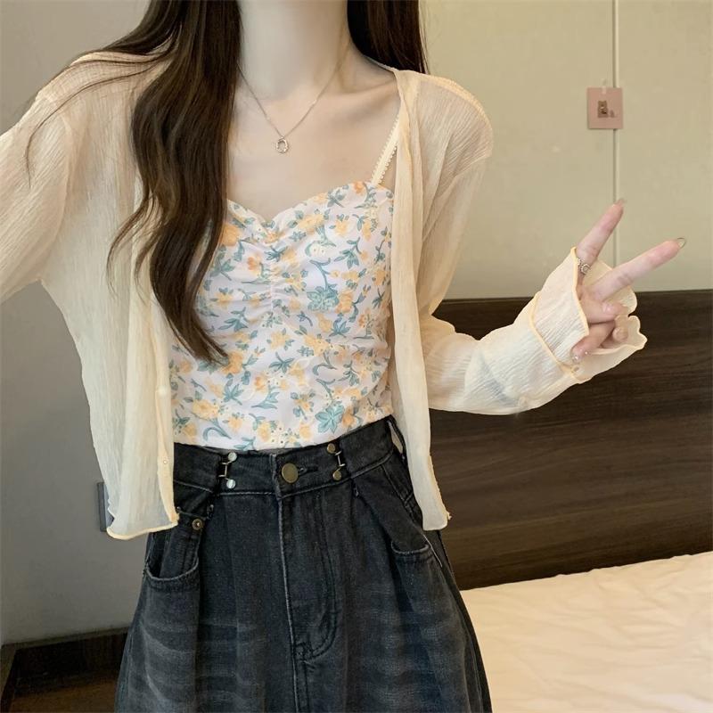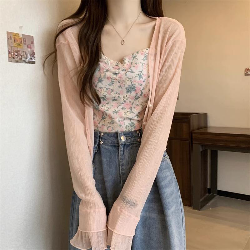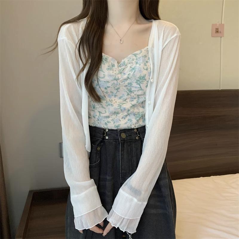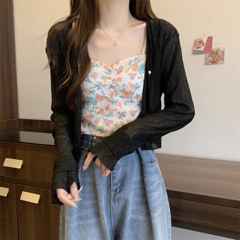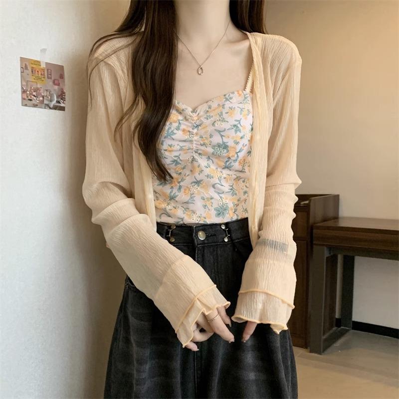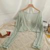 Cárdigan de seda de hielo con protector solar para mujer, abrigo tipo chal fino de verano con falda de tirantes, blusa exterior, blusa corta