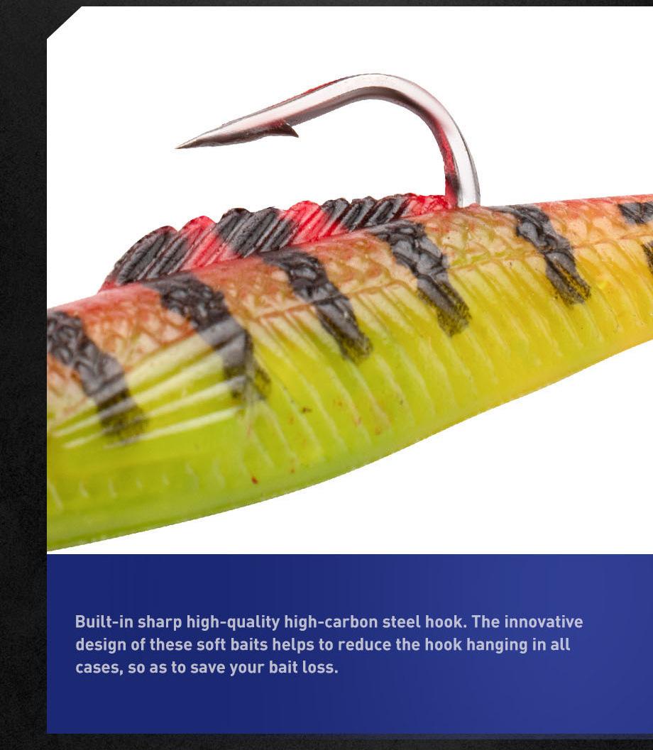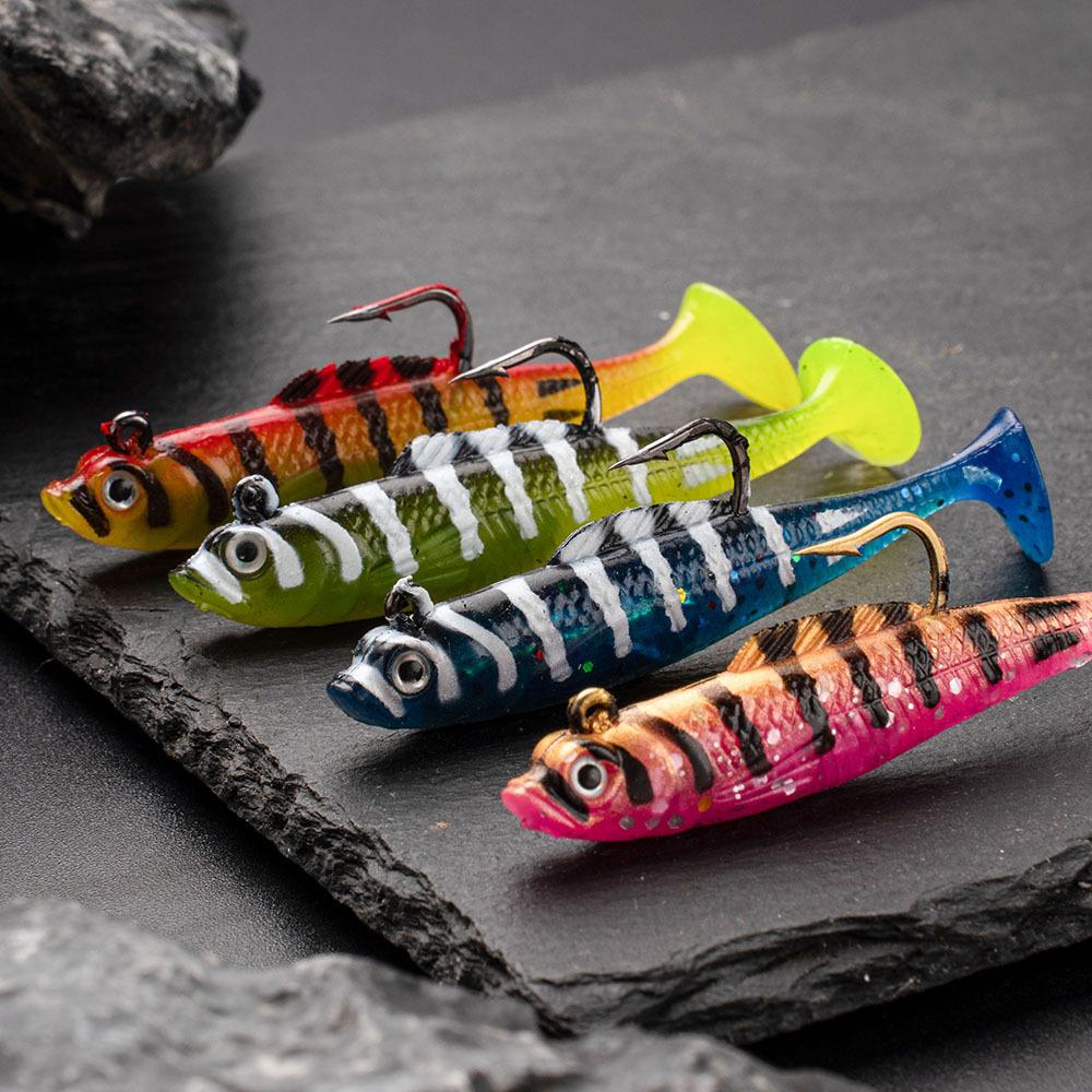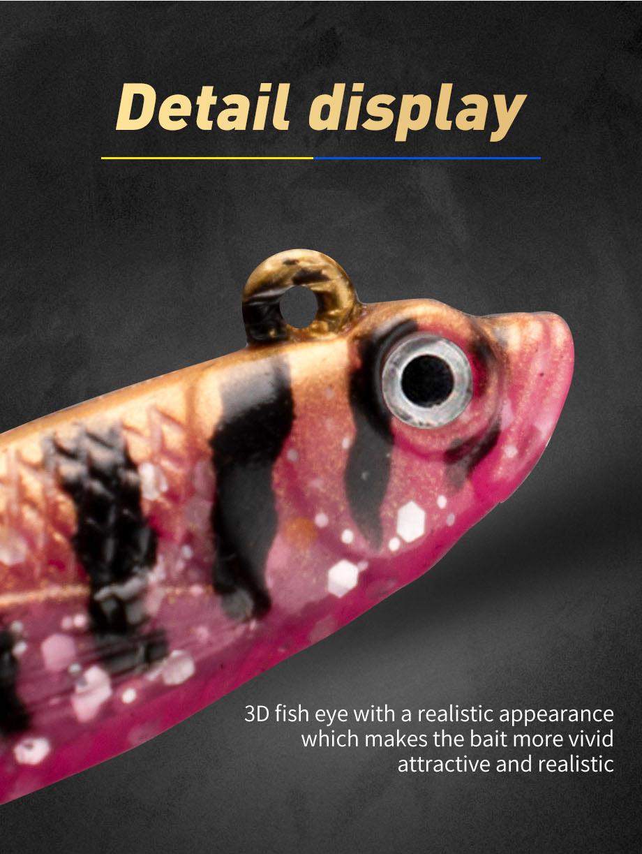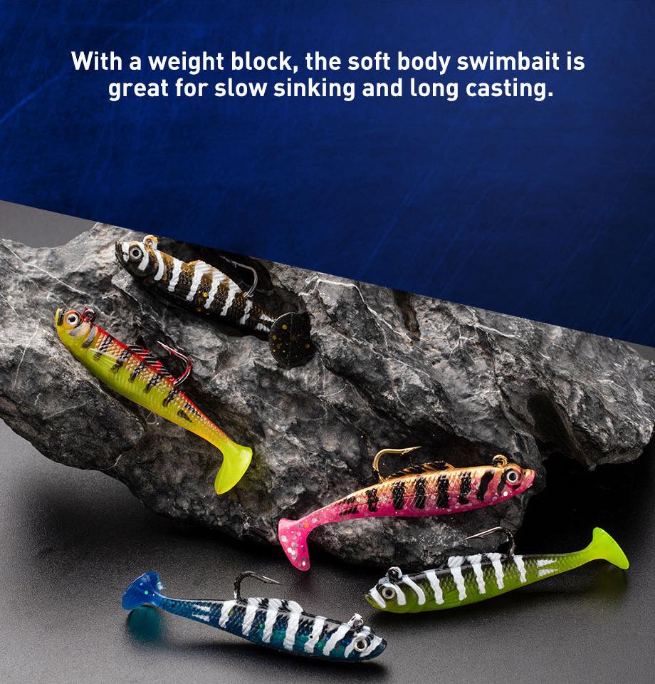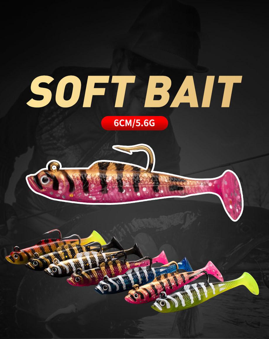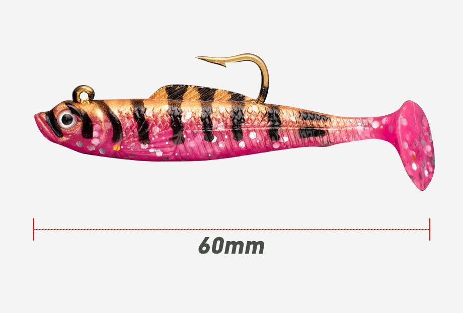 Pez de plomo con cola en T de 6 cm y 5,6 g, cebo secundario de carretera, anzuelo biónico, pez con contrapeso, capa de natación completa, cebo blando con pico amartillado.