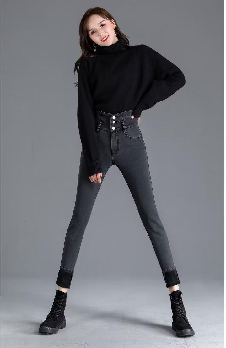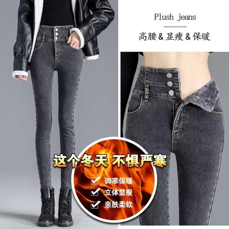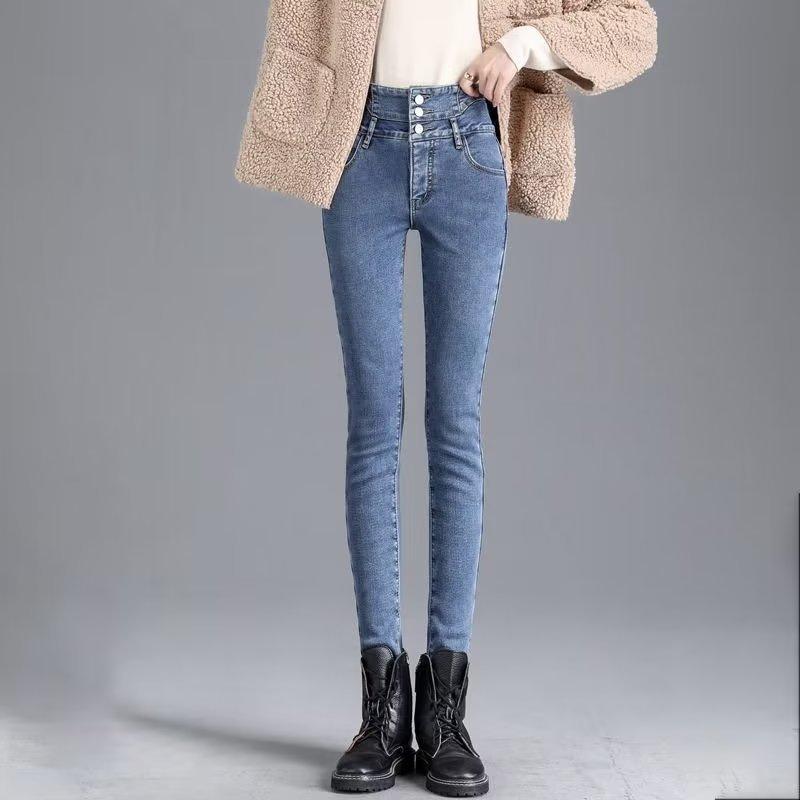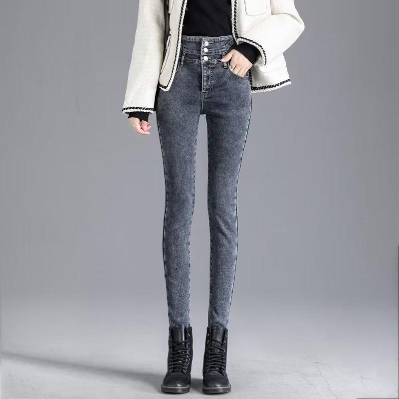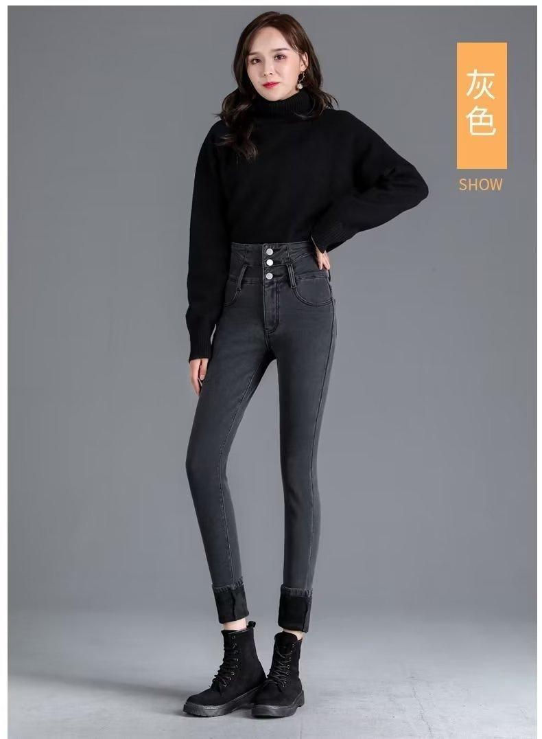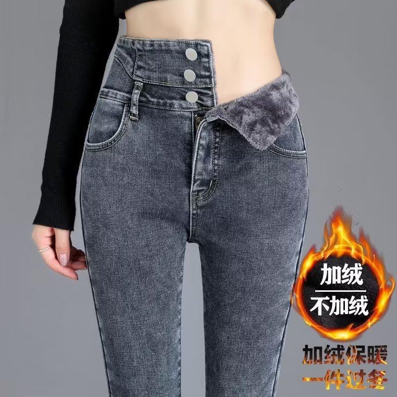Jeans de invierno azul grisáceo de tres botones de cintura alta plus-terciopelo para mujer 2023 otoño e invierno nuevos pantalones ajustados pitillo