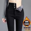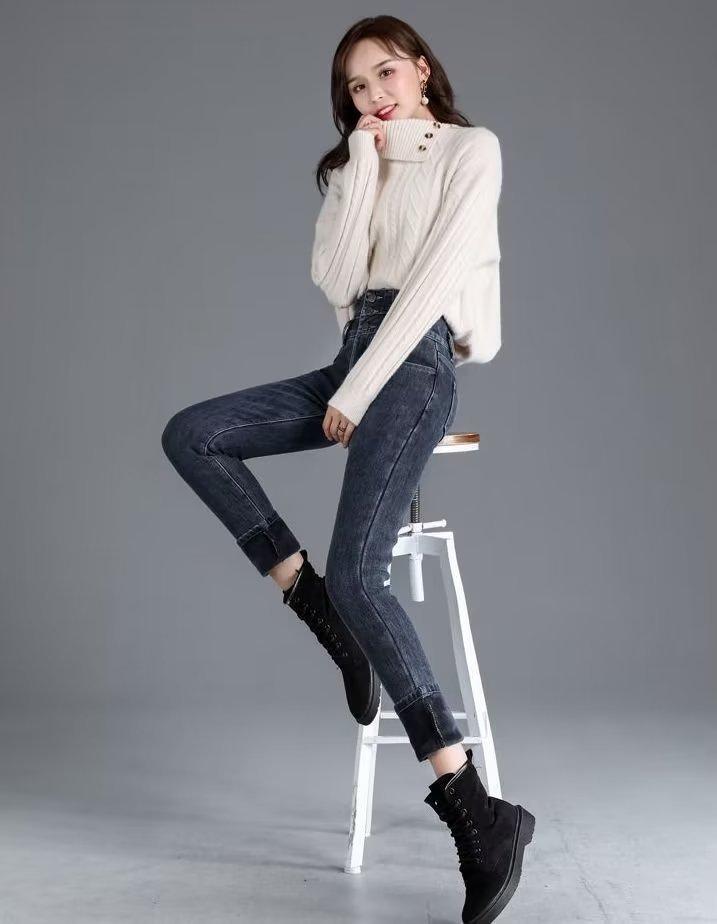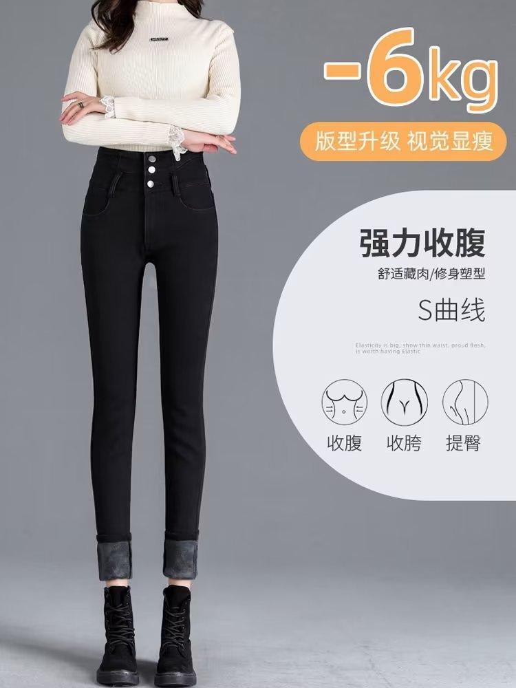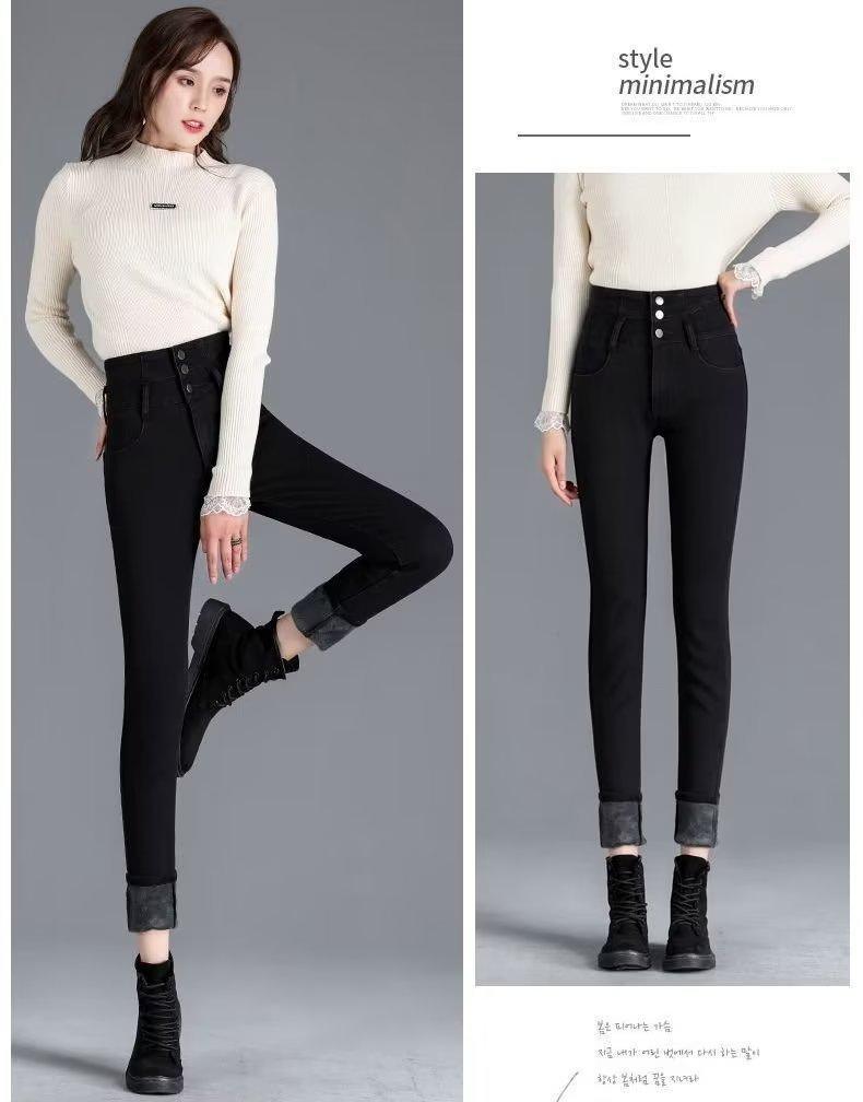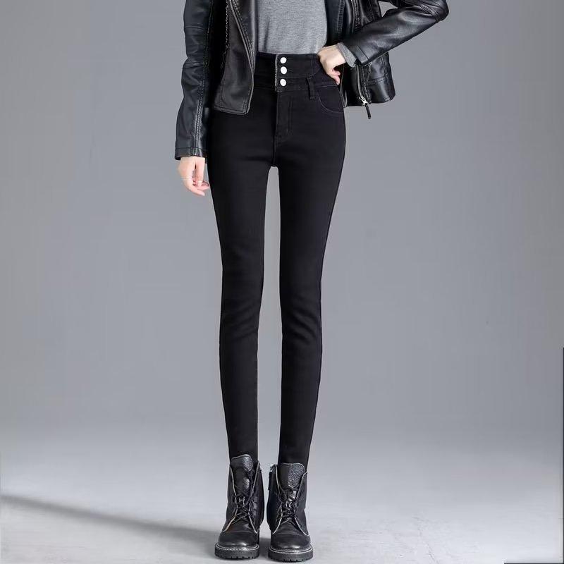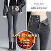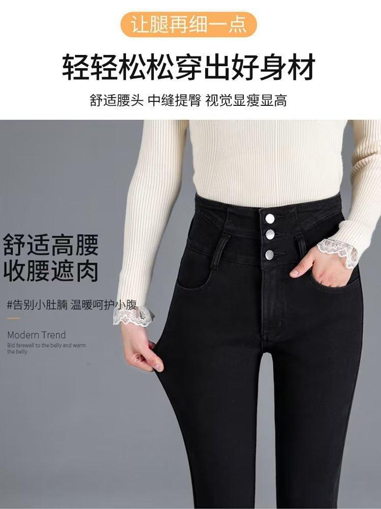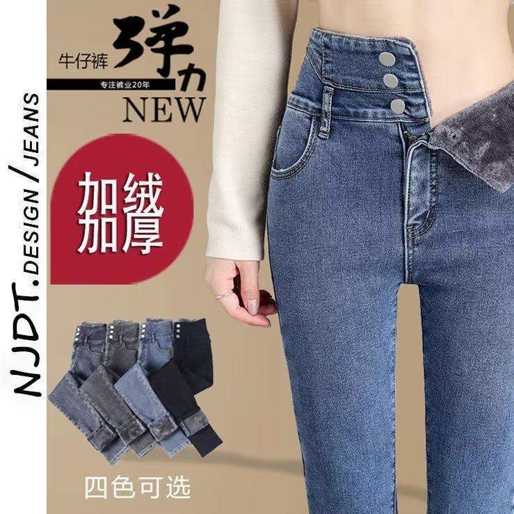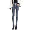 Jeans de invierno azul grisáceo de tres botones de cintura alta plus-terciopelo para mujer 2023 otoño e invierno nuevos pantalones ajustados pitillo