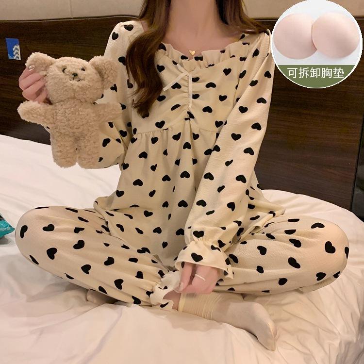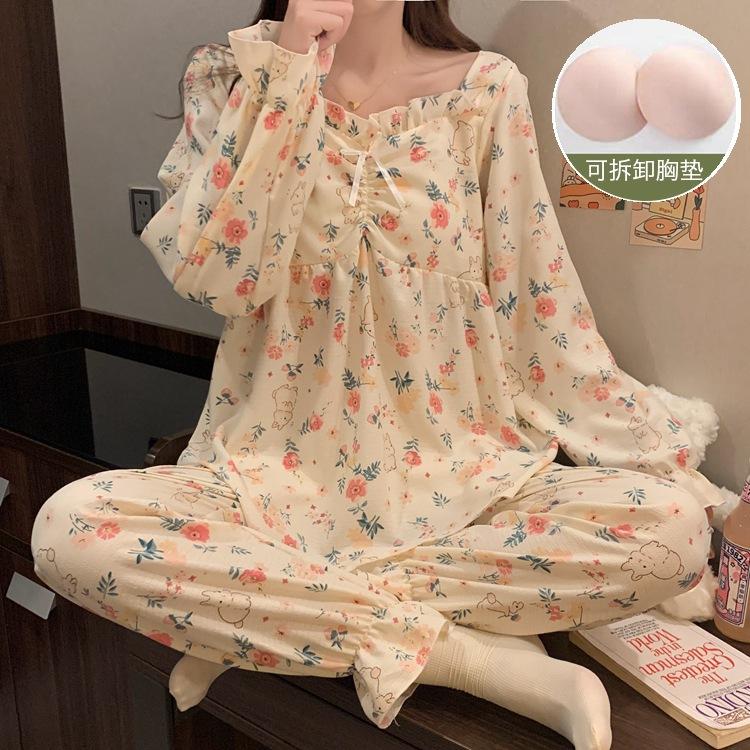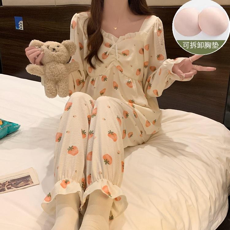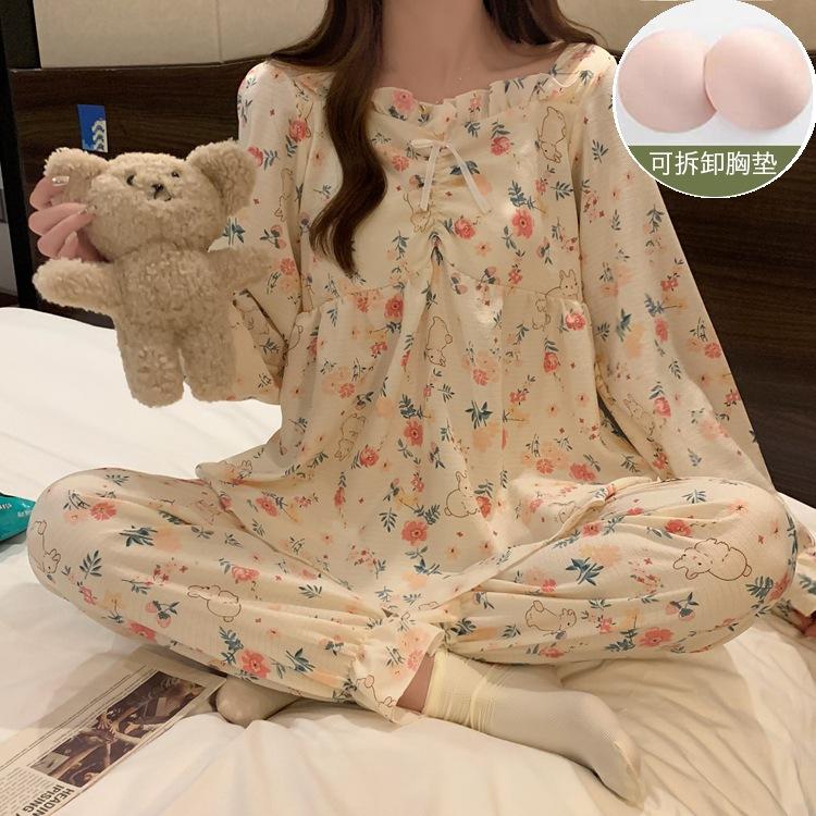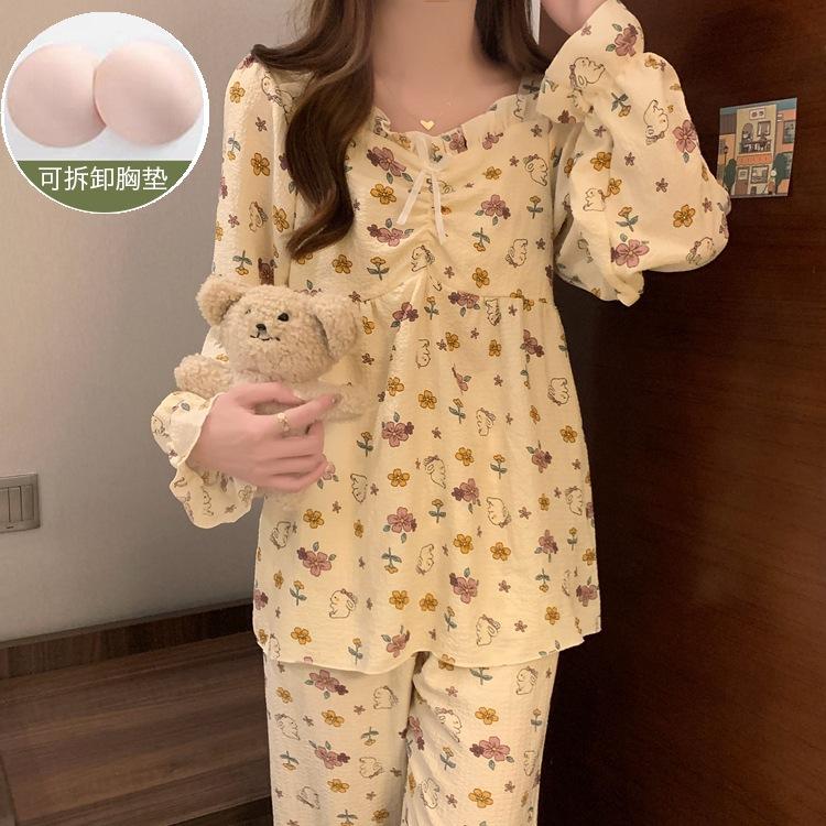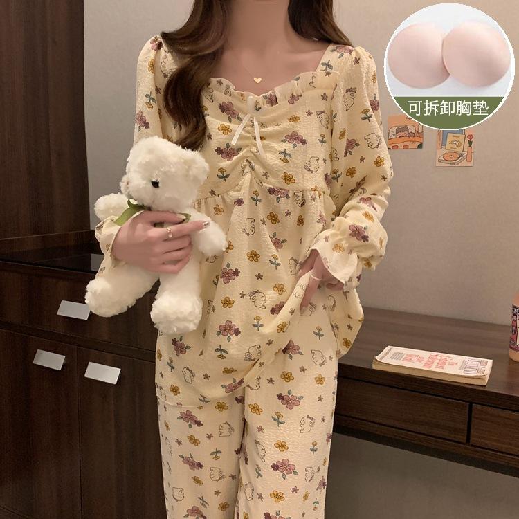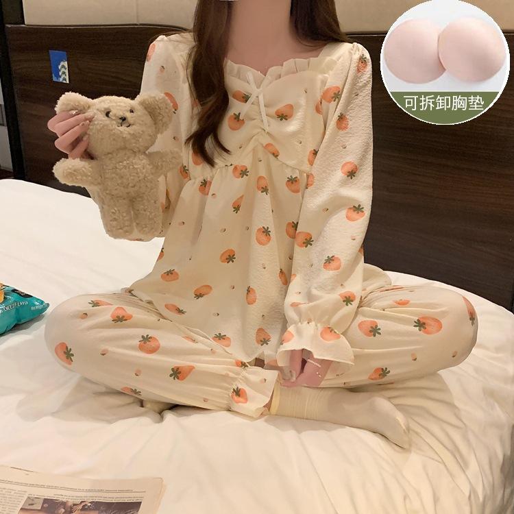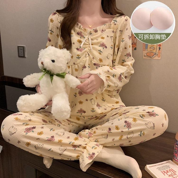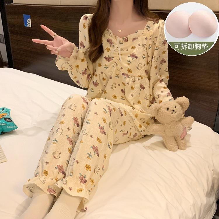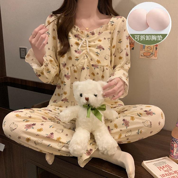 Pijamas de mujer de primavera y otoño de algodón con burbujas, estilo dulce, pantalones de manga larga, traje de casa con almohadilla para el pecho, se puede usar al aire libre