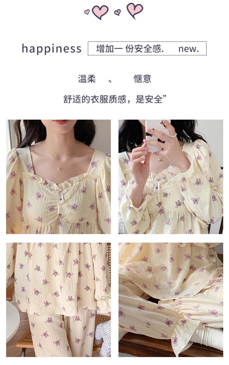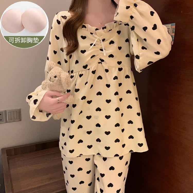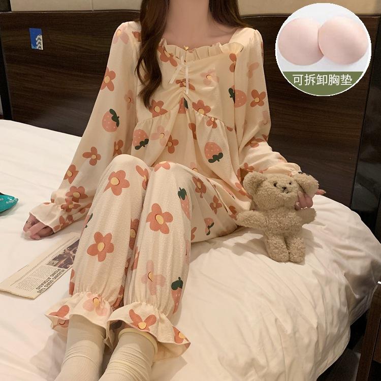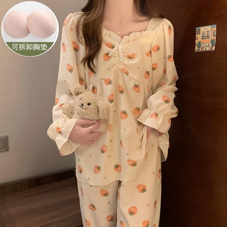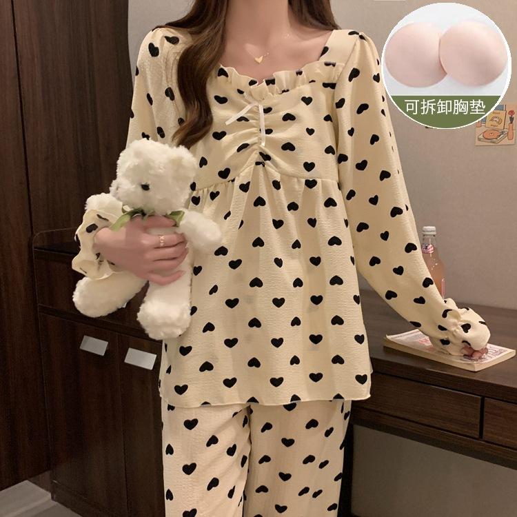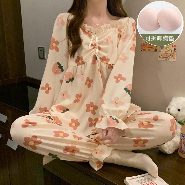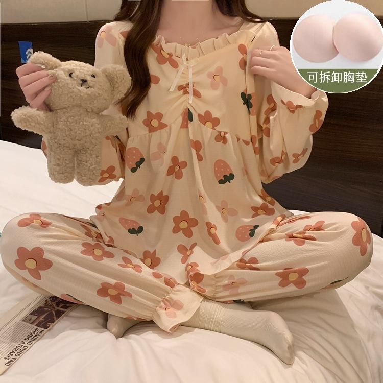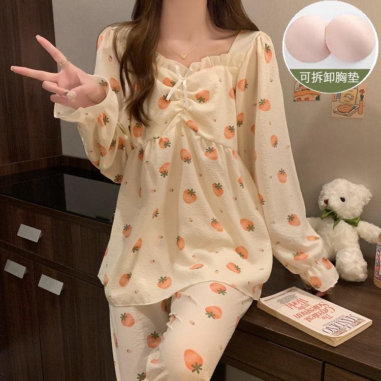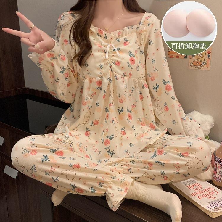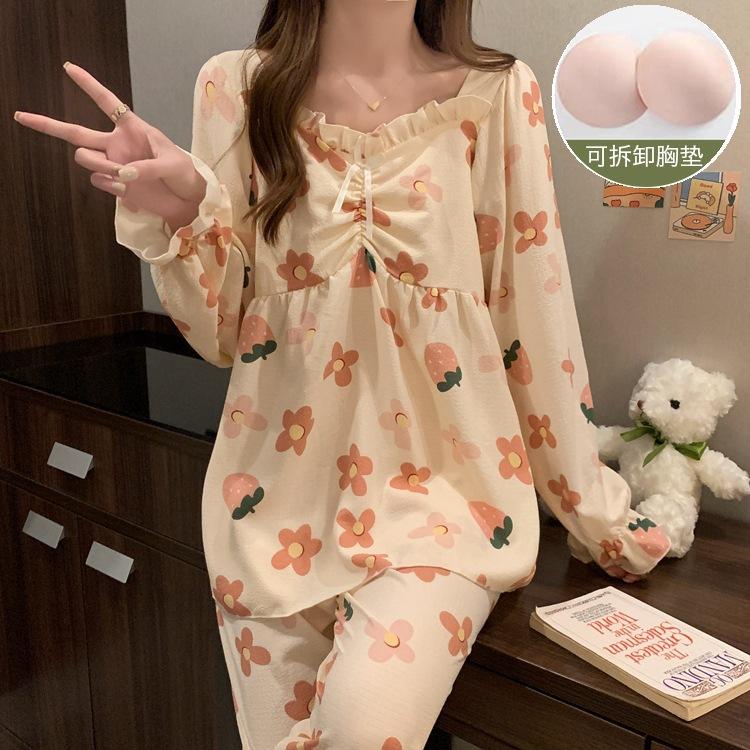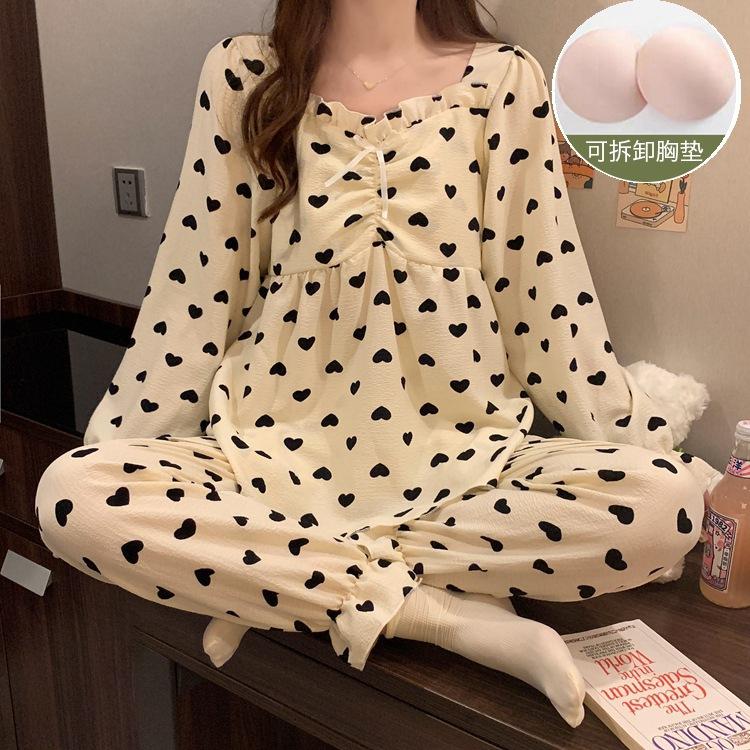 Pijamas de mujer de primavera y otoño de algodón con burbujas, estilo dulce, pantalones de manga larga, traje de casa con almohadilla para el pecho, se puede usar al aire libre