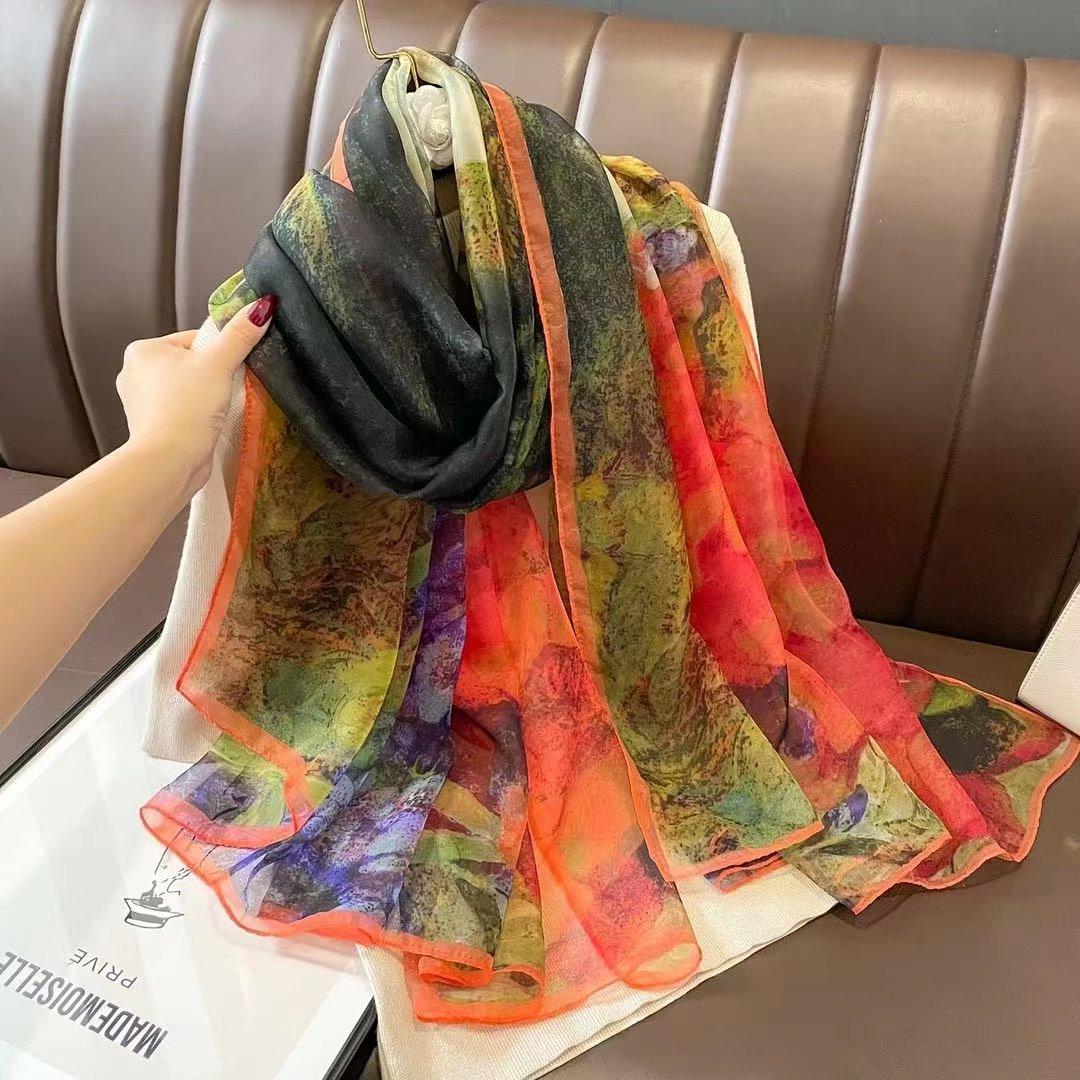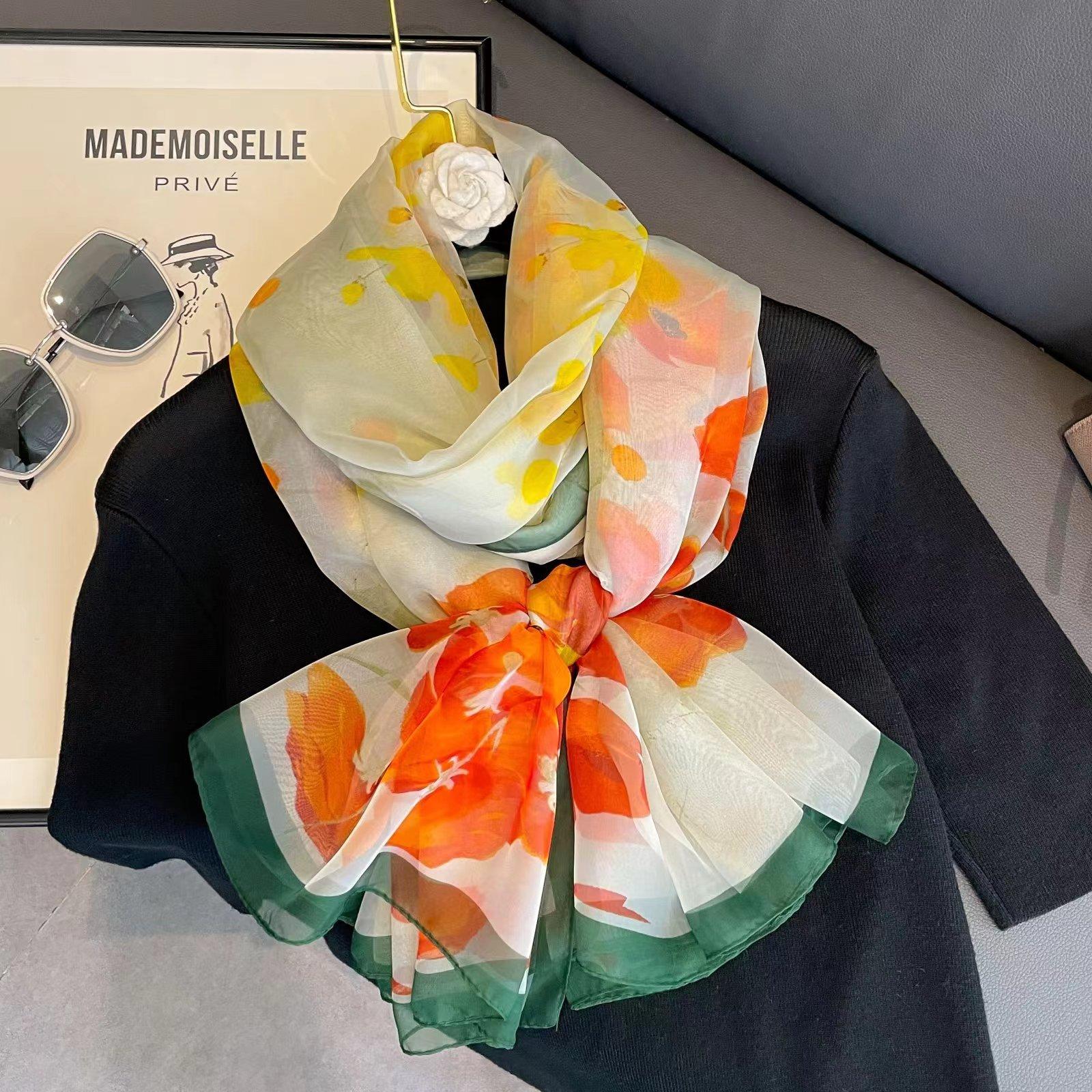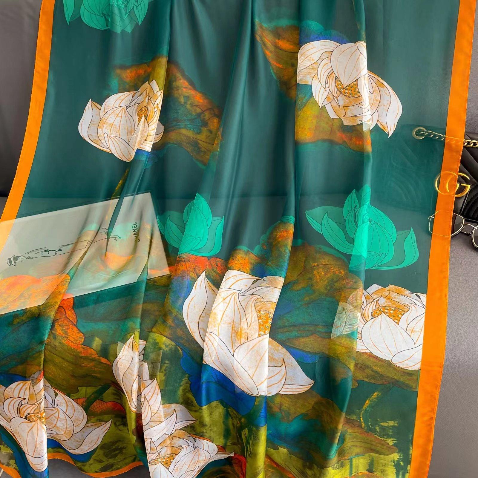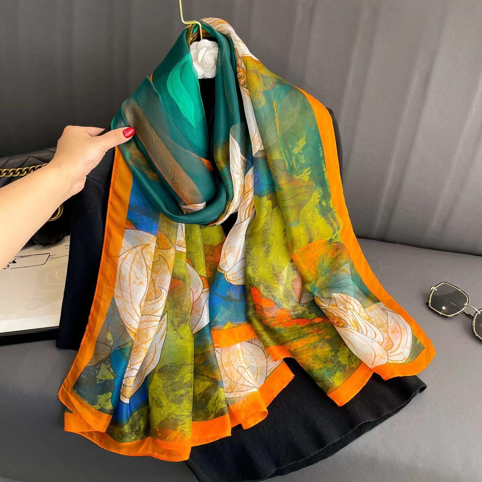 Elegante chal bufanda de estilo chino estampado estilo coreano primavera y otoño versátil bufanda de seda artificial bufanda de moda de lujo ligero para mujer