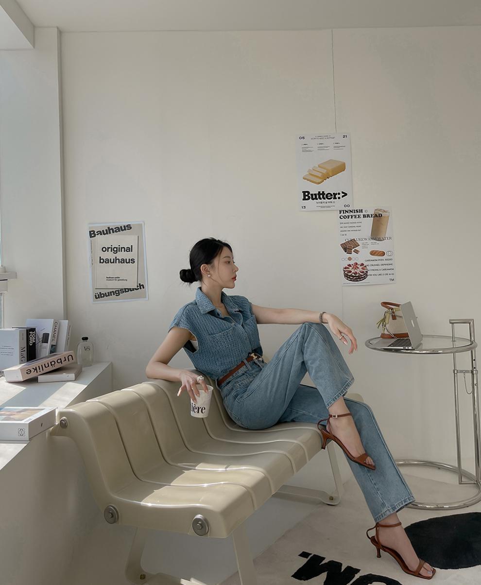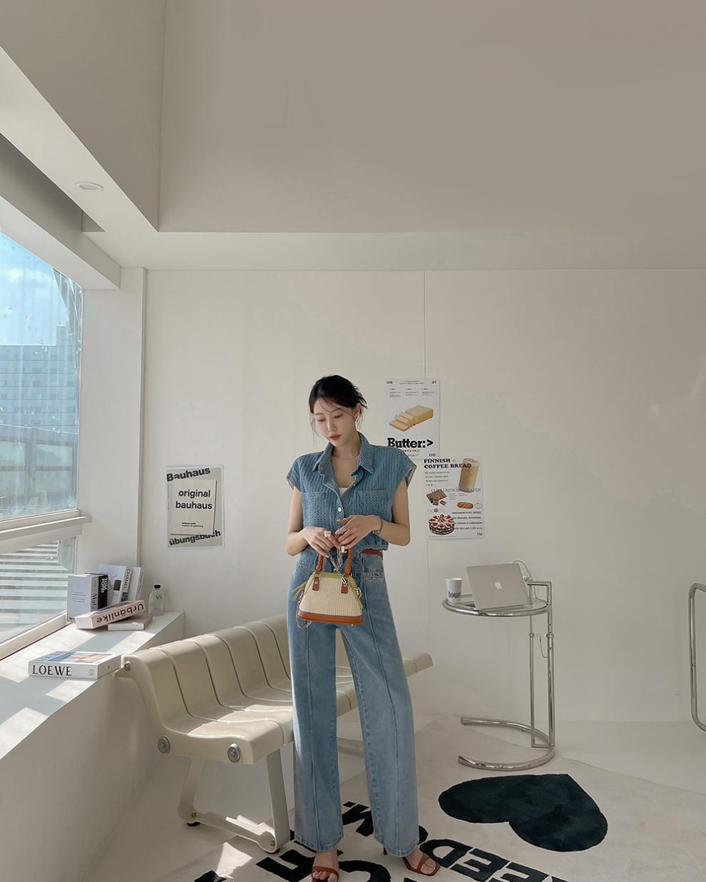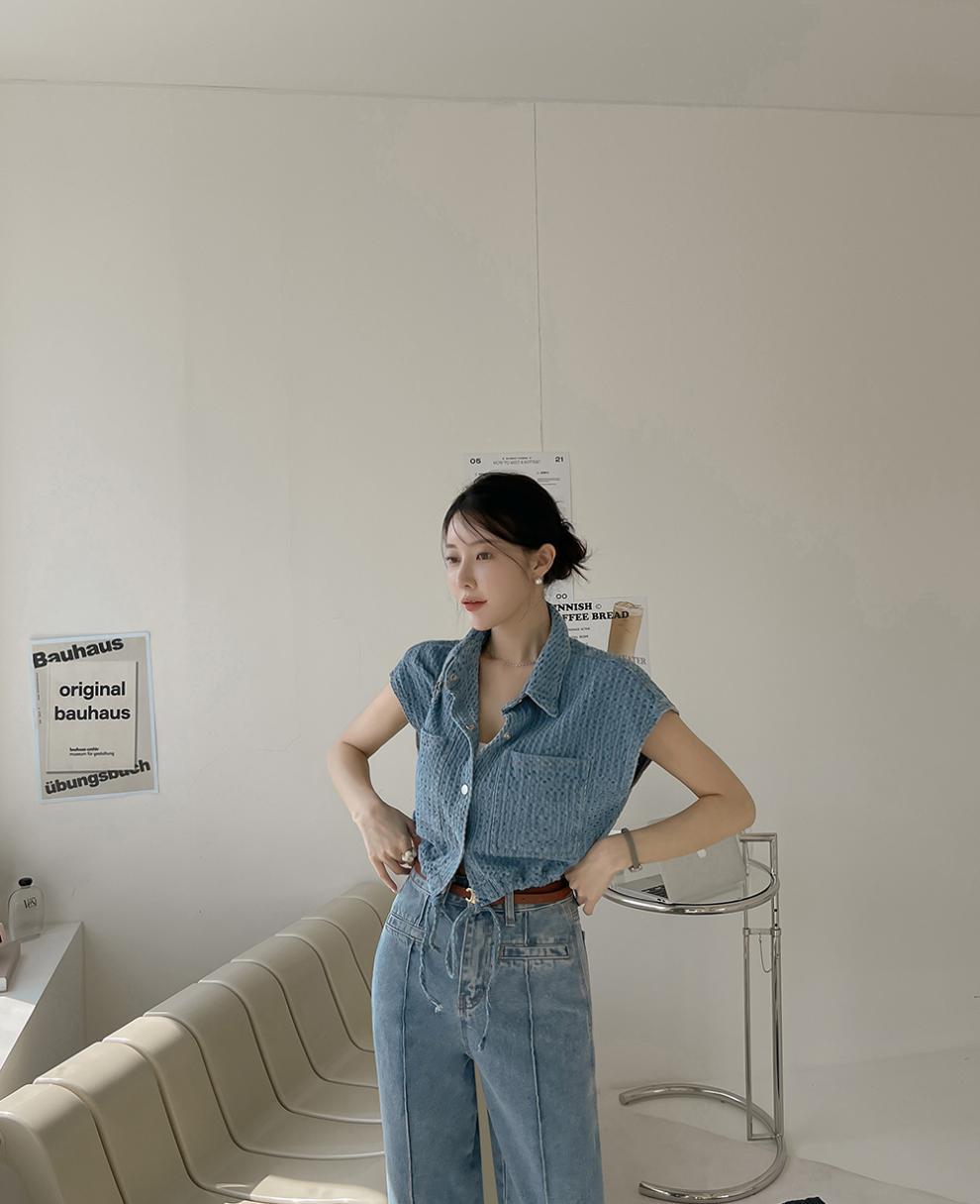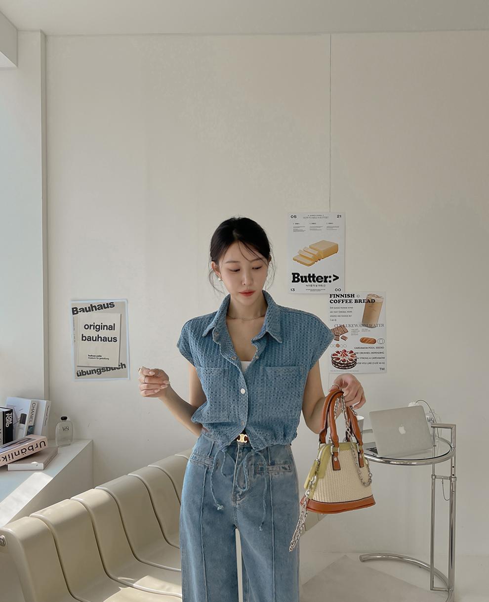 Chaleco vaquero sin mangas con diseño de bolsillo de un solo pecho y solapa retro de estilo francés de otoño coreano 2023 para mujer