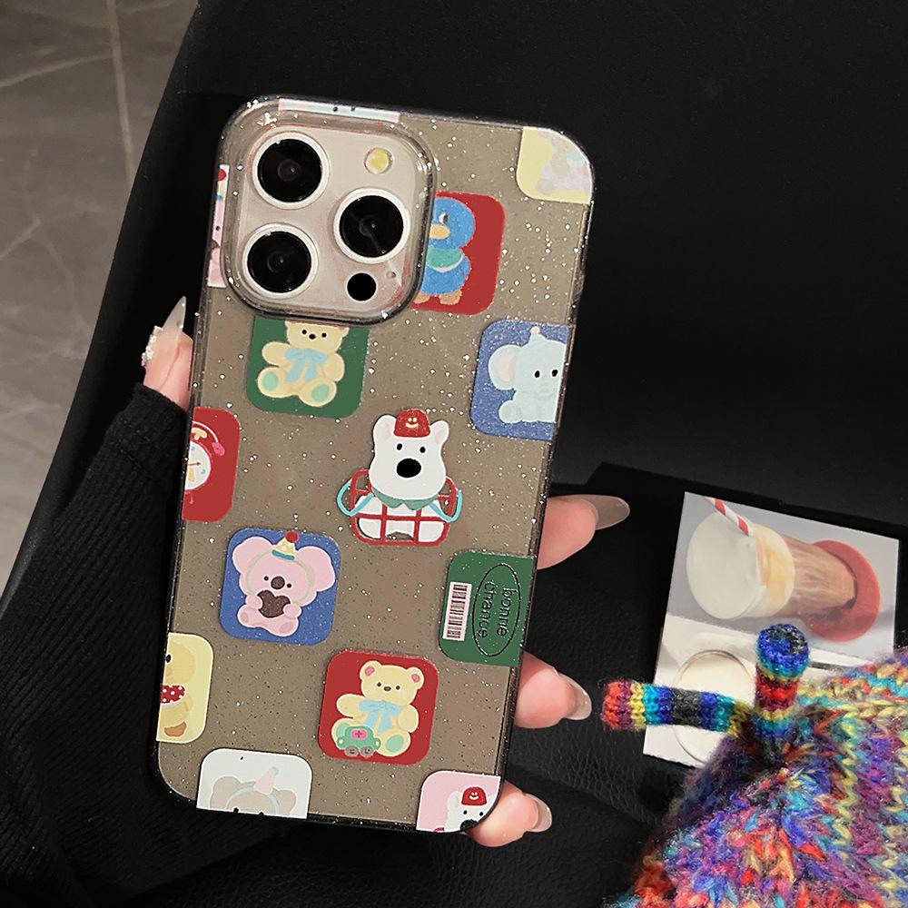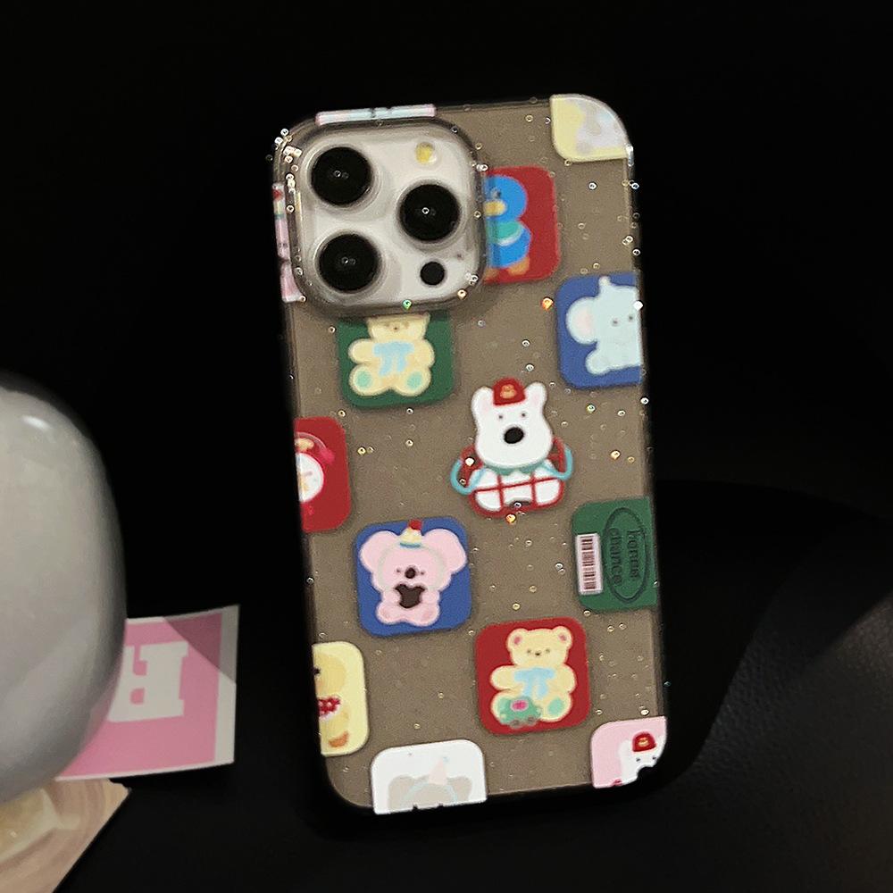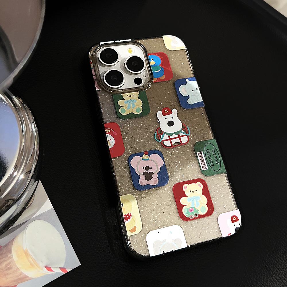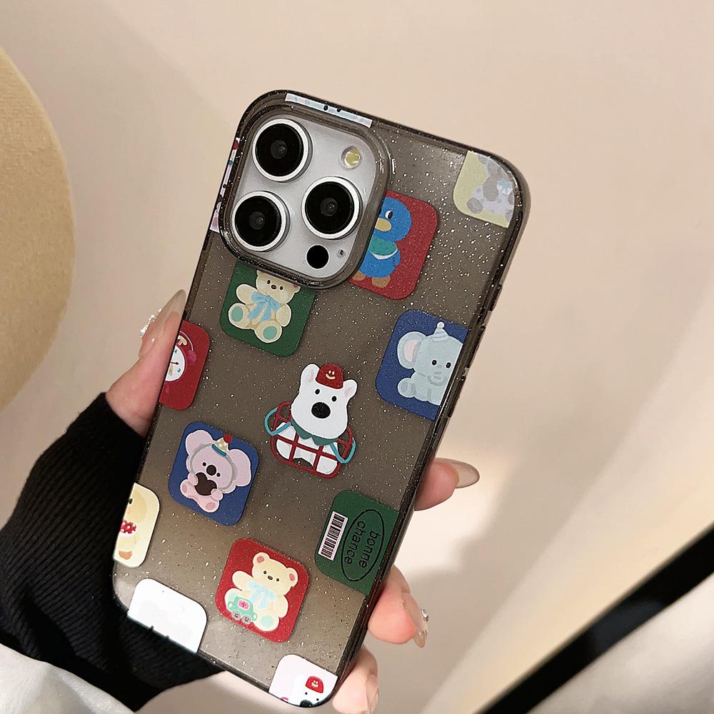 Funda para iPhone 15 con diseño de dibujos animados y bloques de color, con purpurina en polvo, para iPhone 14, Pro Max, color negro, resistente a caídas, funda blanda para iPhone 16, funda blanda para iPhone 13, funda blanda para iPhone 12.