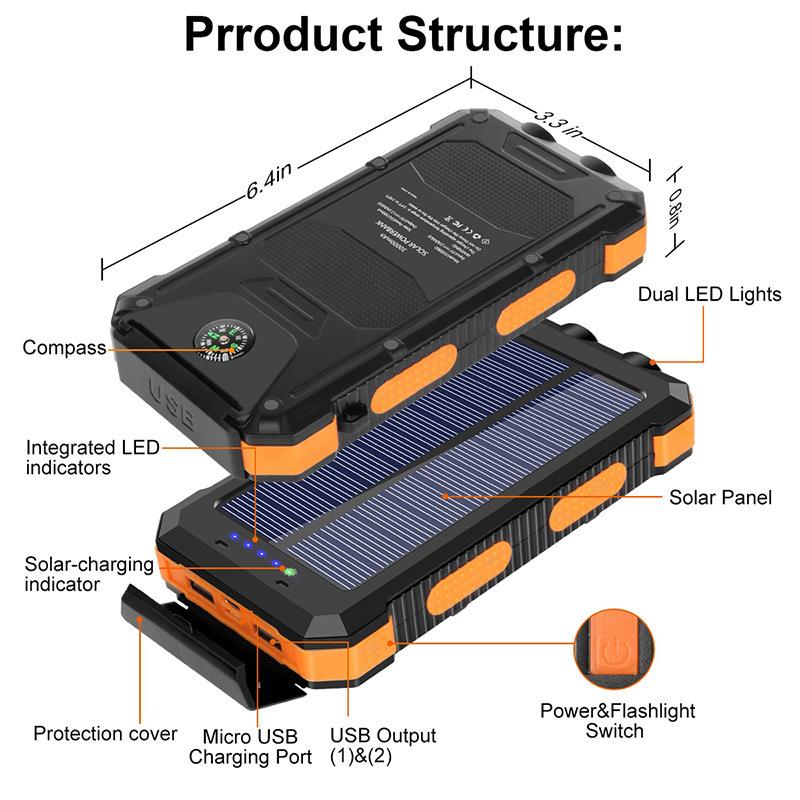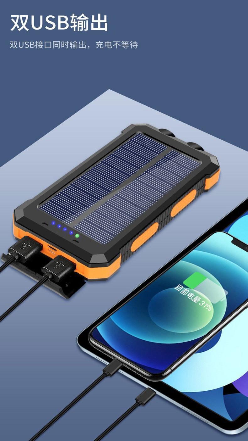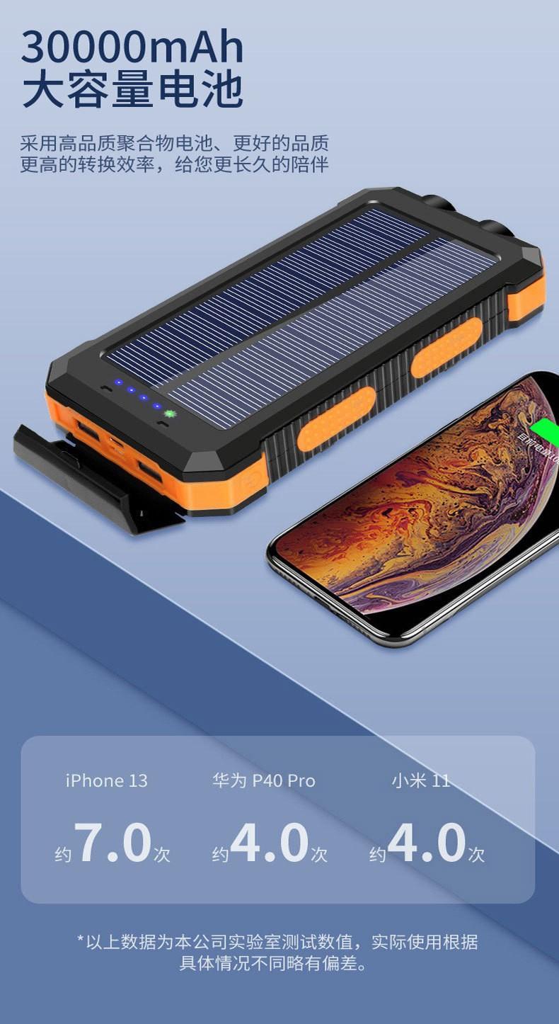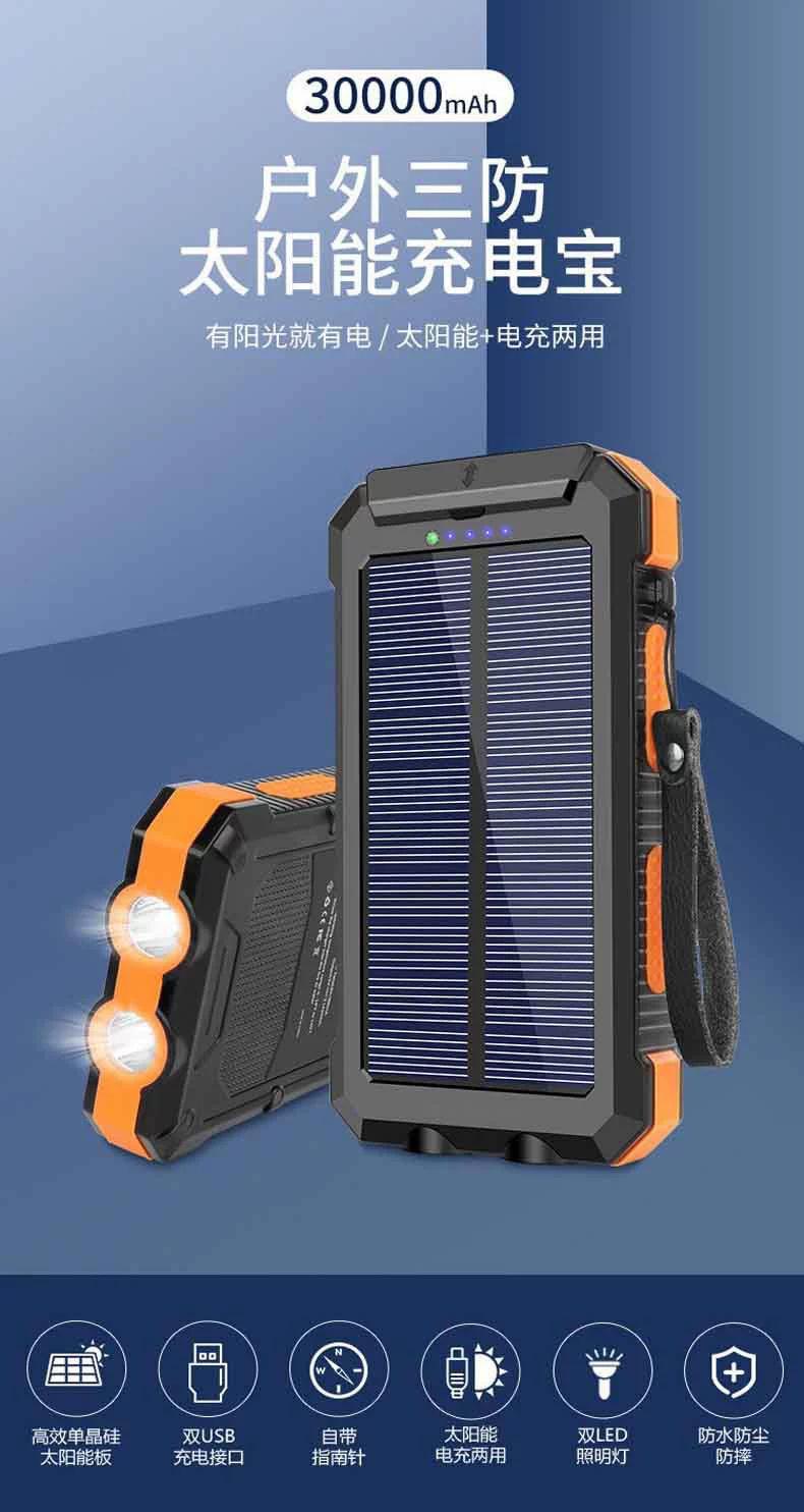 Cargador solar portátil para exteriores, duradero, de gran capacidad, 30000 mAh, resistente al agua, con linterna