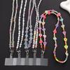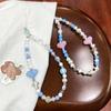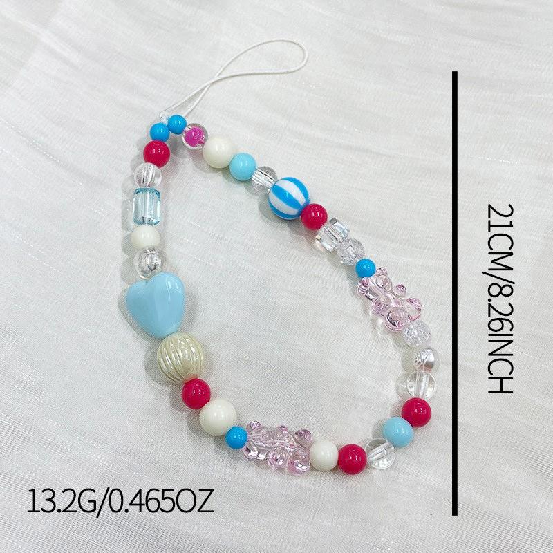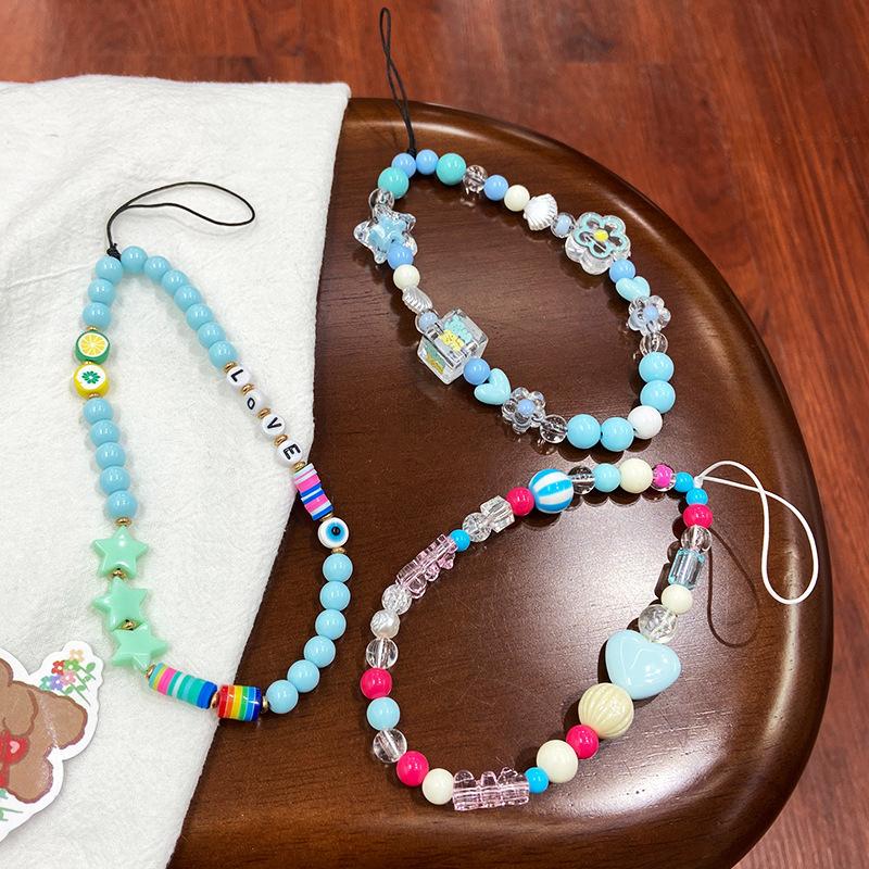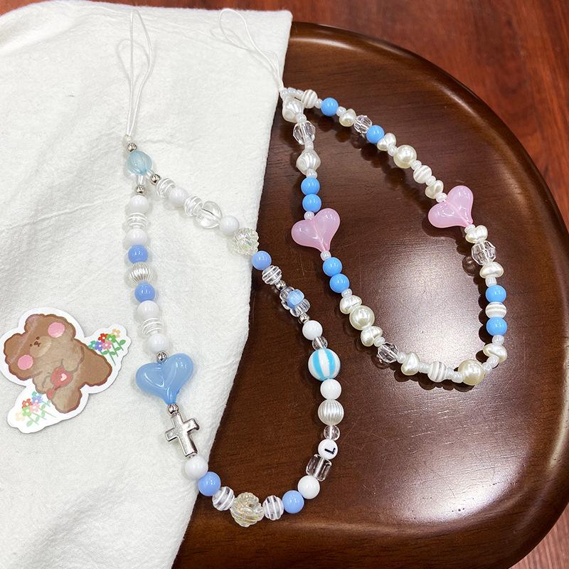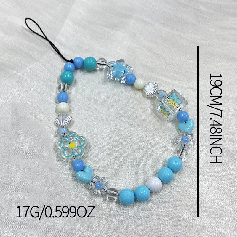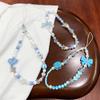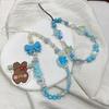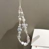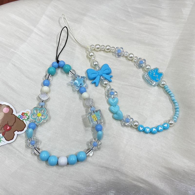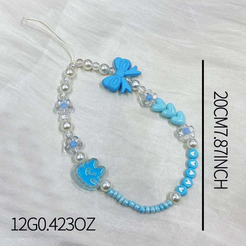 Cadena para teléfono móvil con lazo azul y blanco, hecha a mano, con cuentas, para colgar en la muñeca, corta, portátil, anticaída, creativa, para mujer