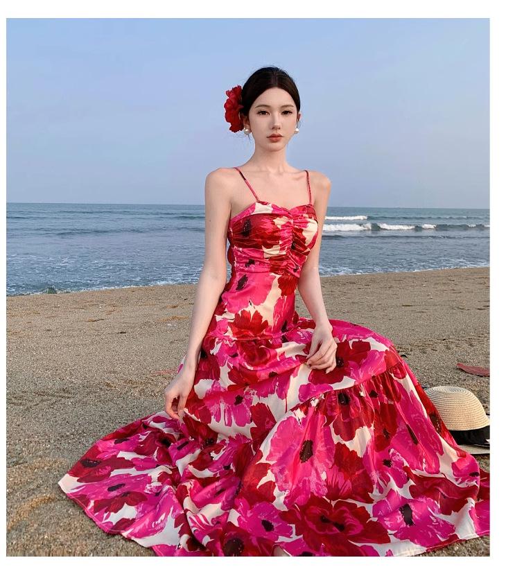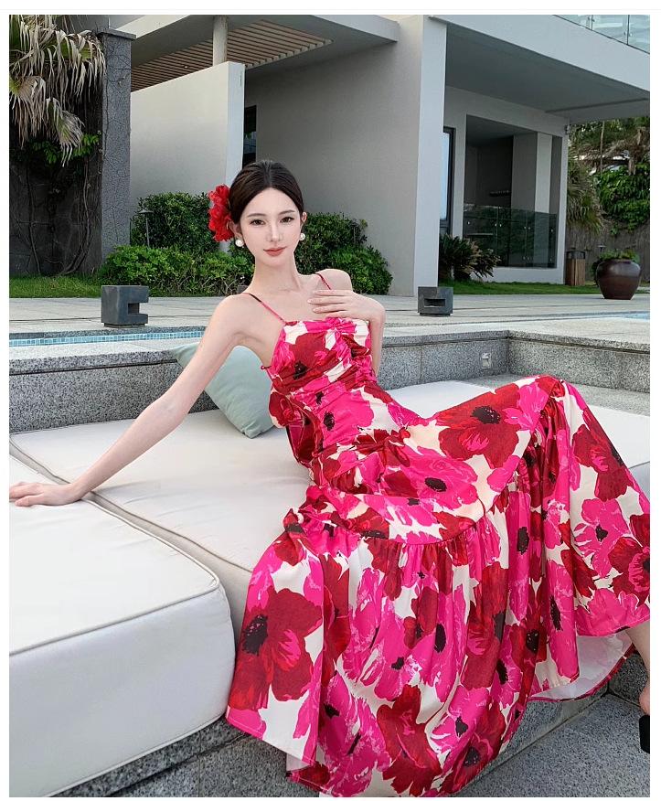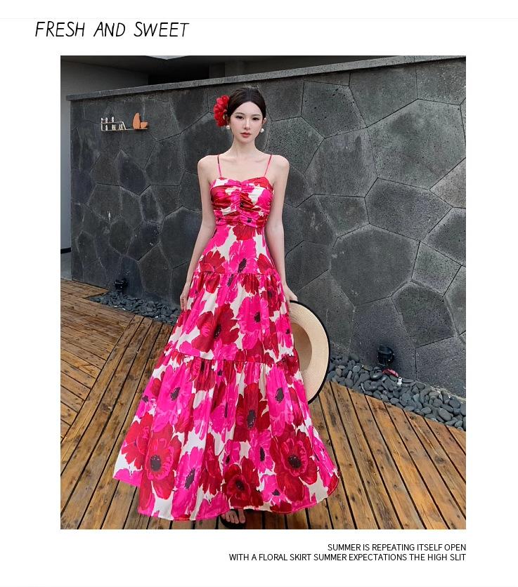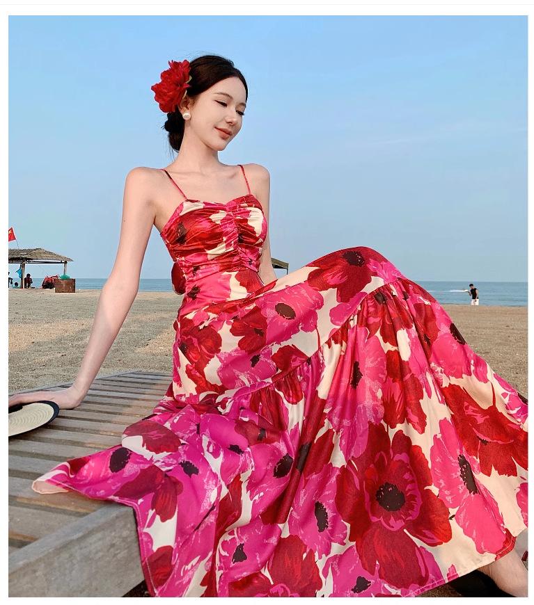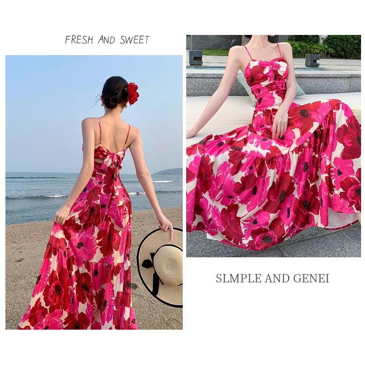 Vestido largo rosa con flores grandes y tirantes para mujer, vestido playero de verano de alta gama con vuelo grande, vestido playero ligero y hermoso para la playa.