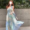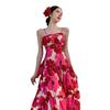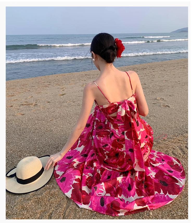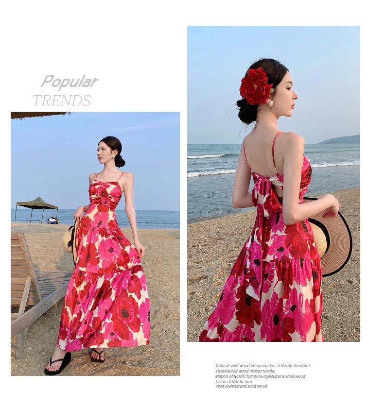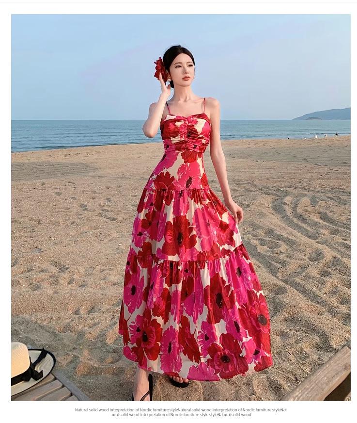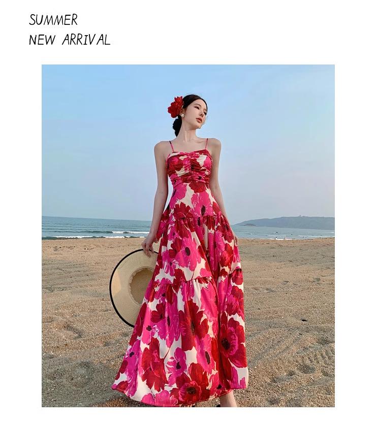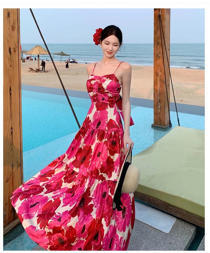 Vestido largo rosa con flores grandes y tirantes para mujer, vestido playero de verano de alta gama con vuelo grande, vestido playero ligero y hermoso para la playa.