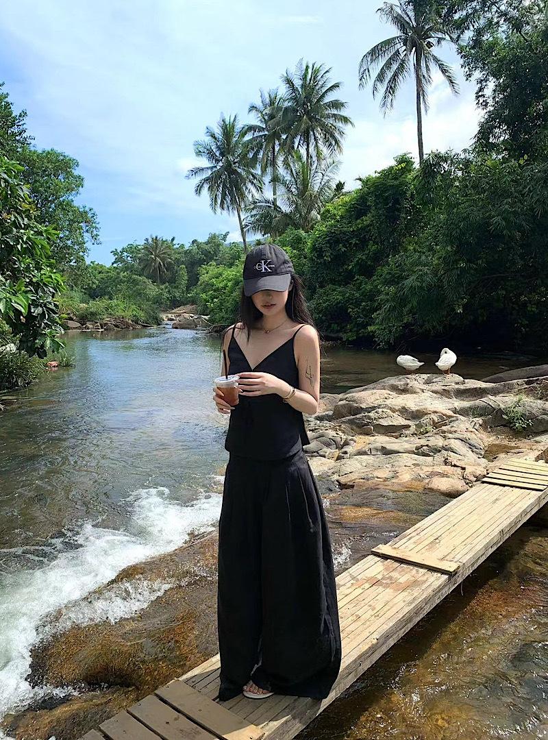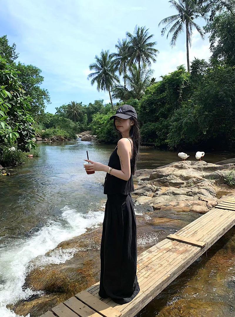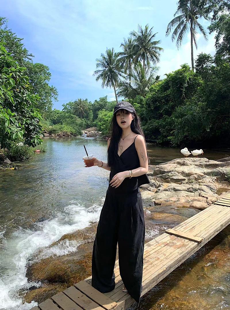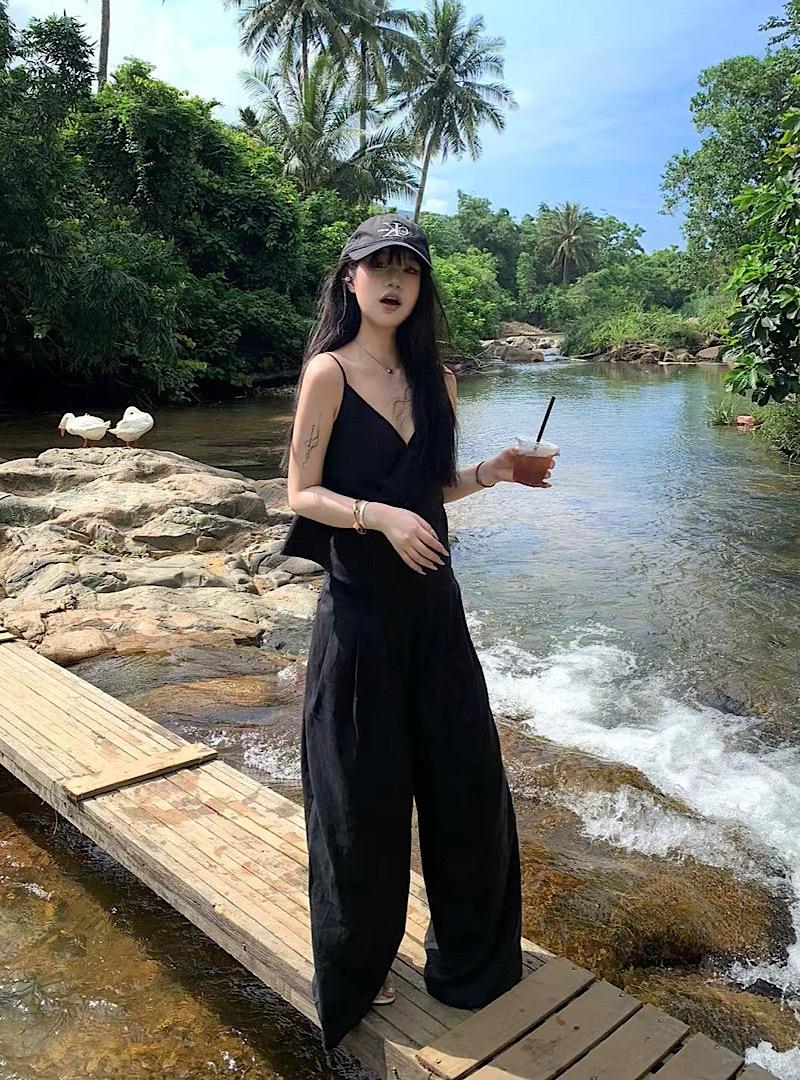 Camisola negra ajustada de Spice Girl, ropa exterior de lino, pantalones casuales de pierna ancha, traje de verano para mujer, nuevo traje de moda