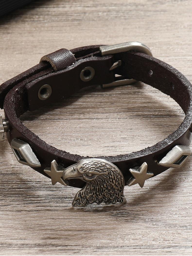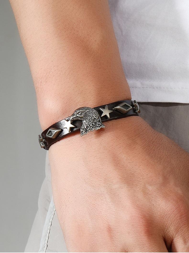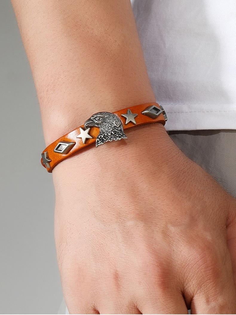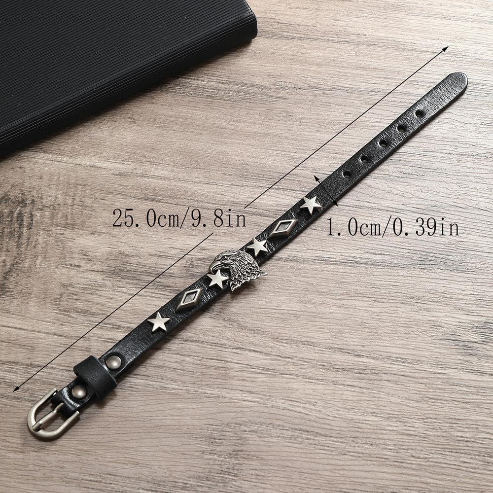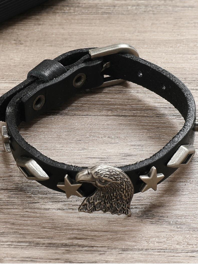 Pulsera de cuero con remaches geométricos de estrella de alta venta europea y americana, pulsera de cuero con cabeza de águila de aleación vintage, pulsera punk callejera