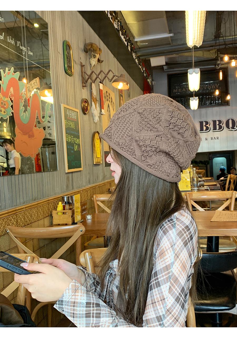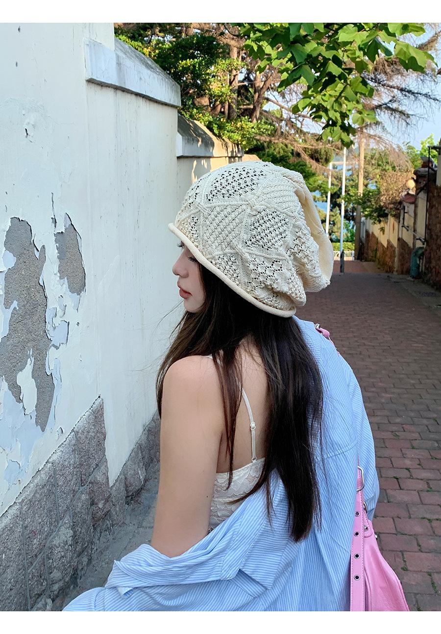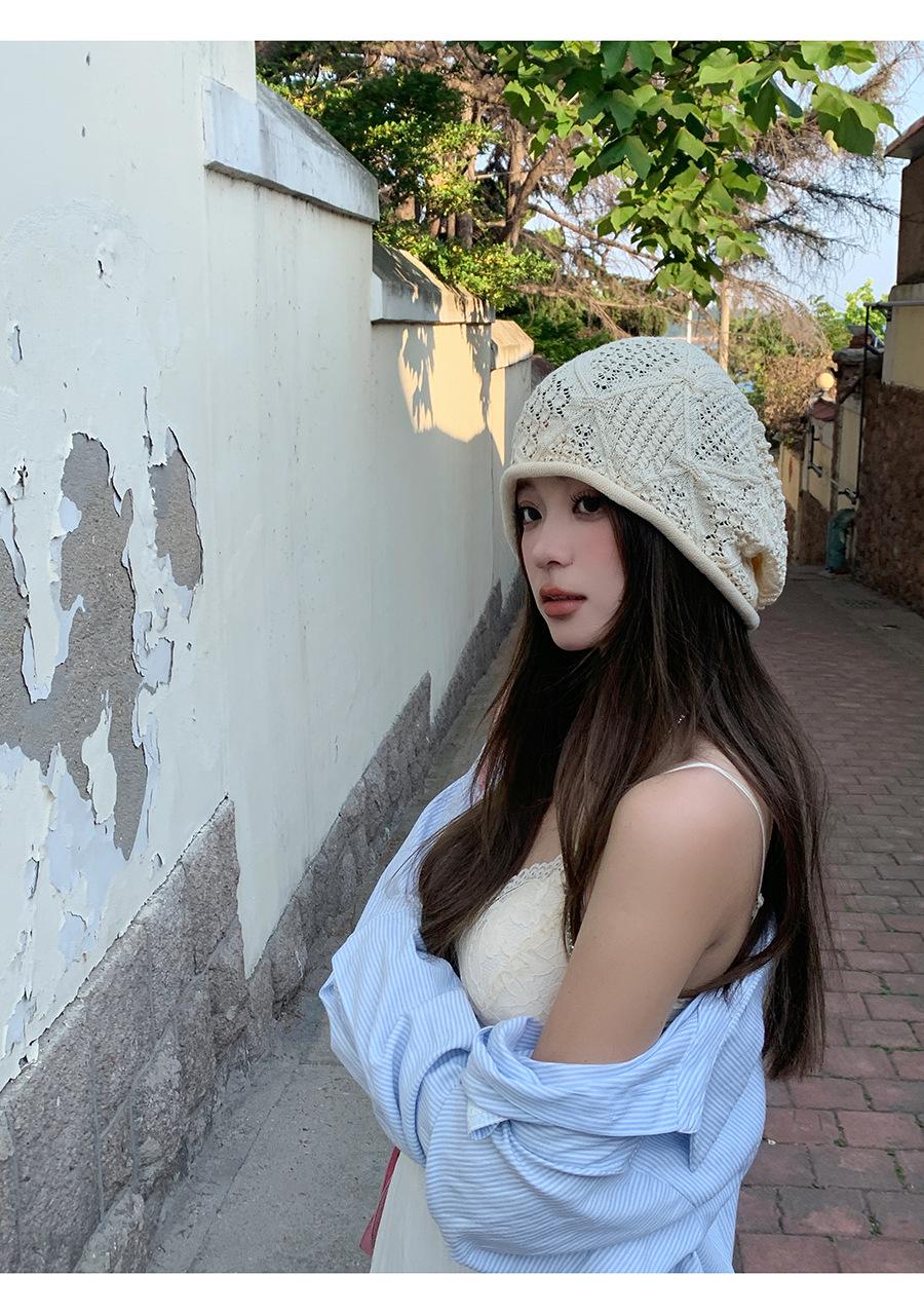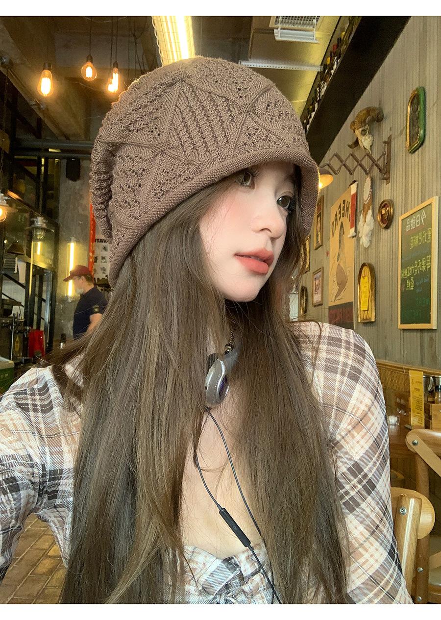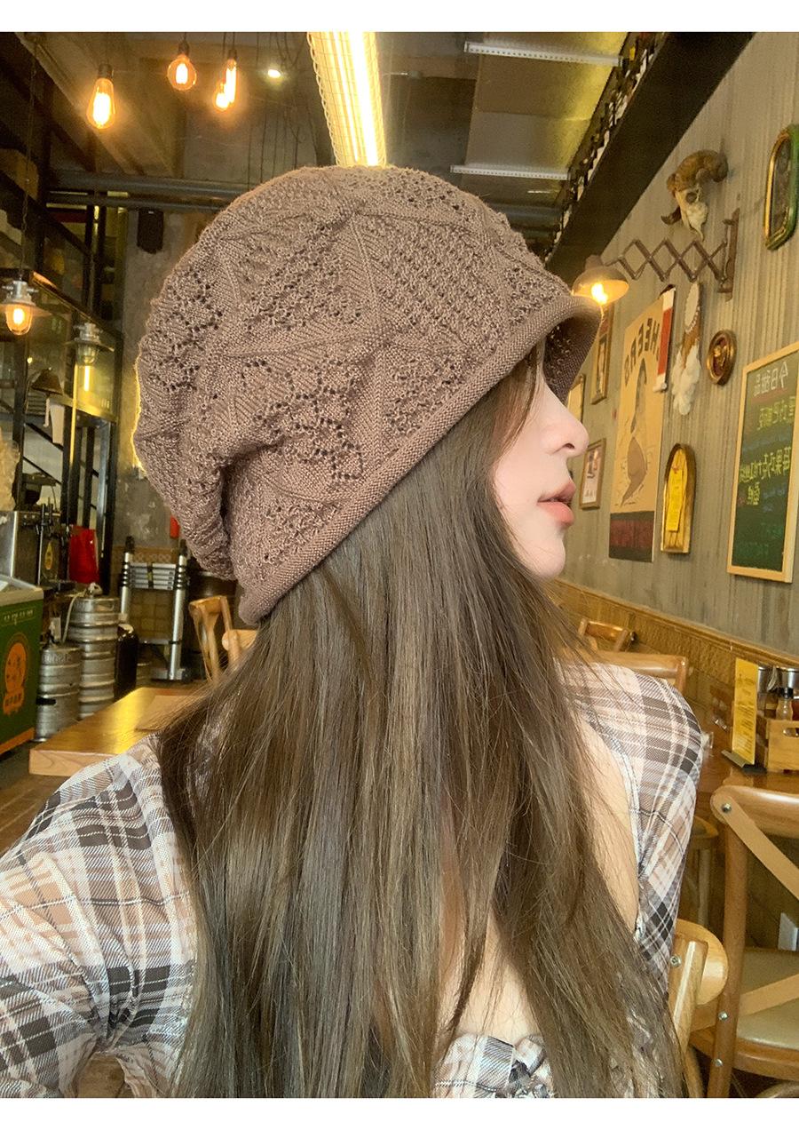 Sombrero Holgado de Crochet Hecho a Mano Japonés para Mujer Verano Fino Color Sólido Cabeza Grande que Muestra la Cara Pequeña Simple Baotou Sombrero para el Frío