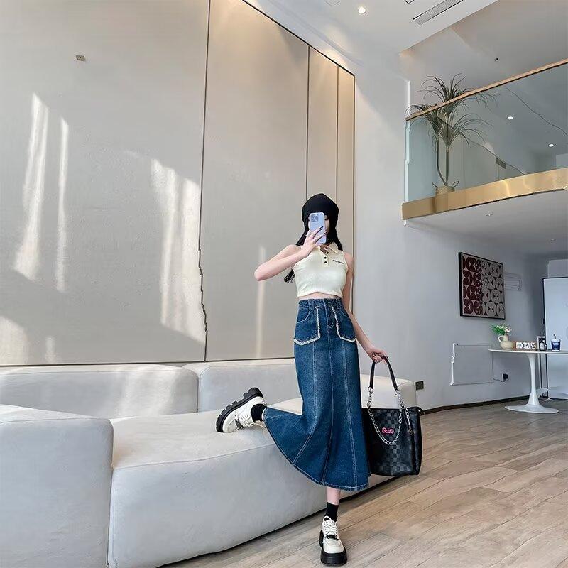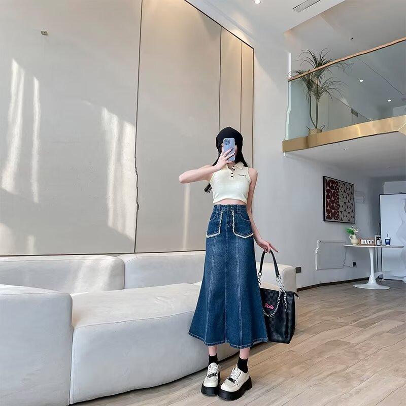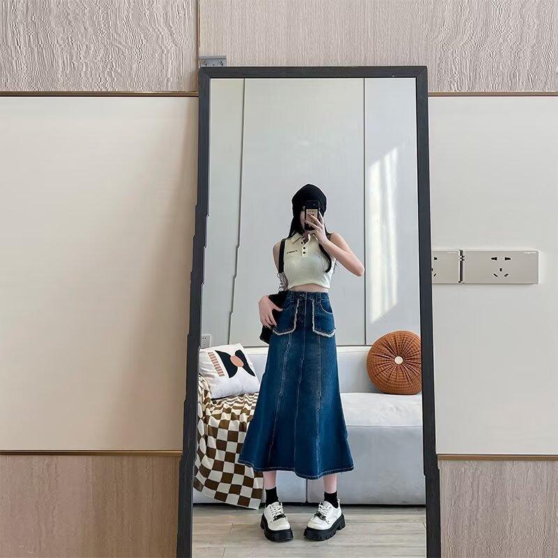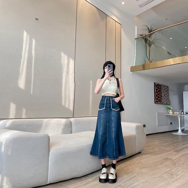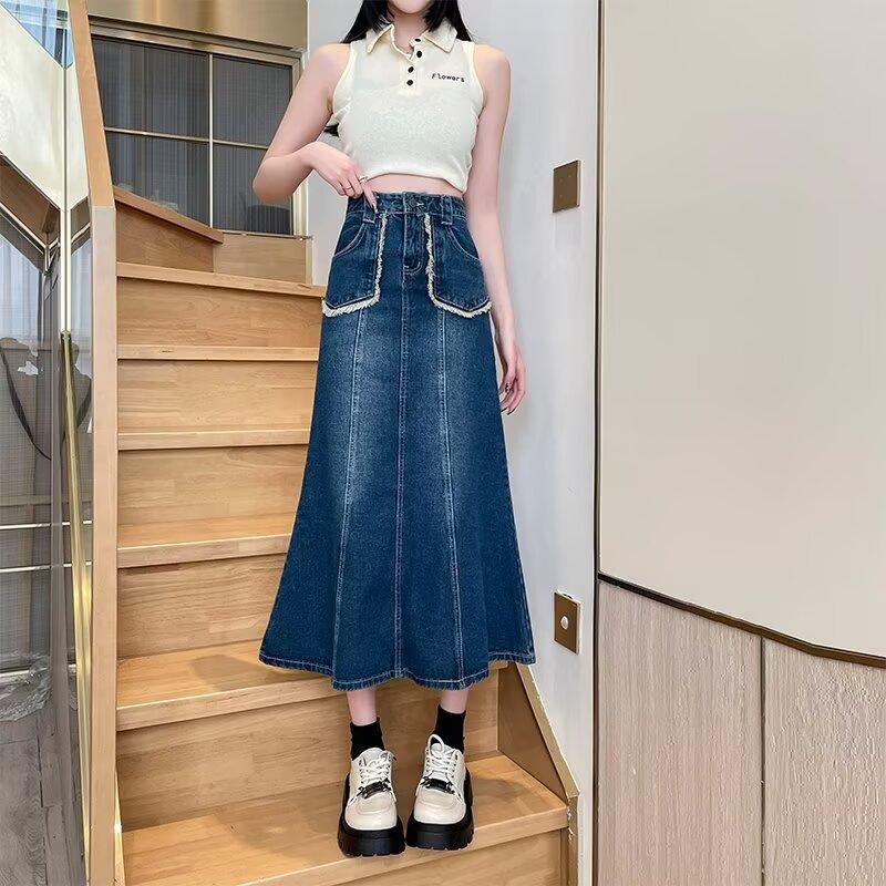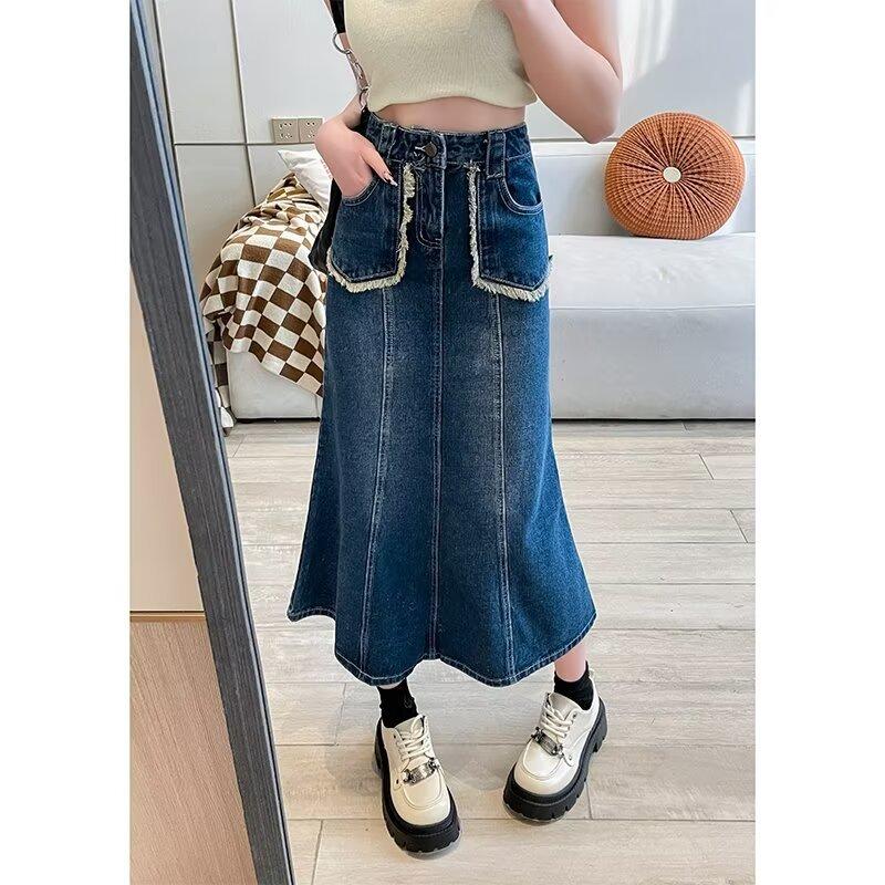 Falda larga de cintura alta con borde sin rematar, estilo retro, versátil y ajustada, de mezclilla versátil, primavera y verano 2024