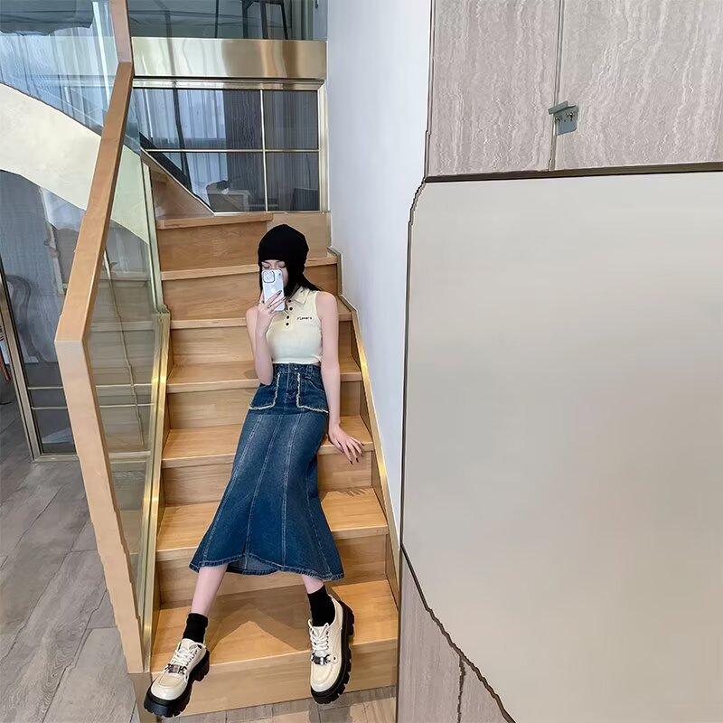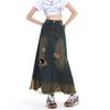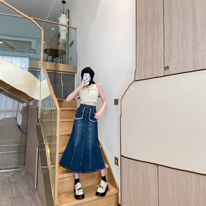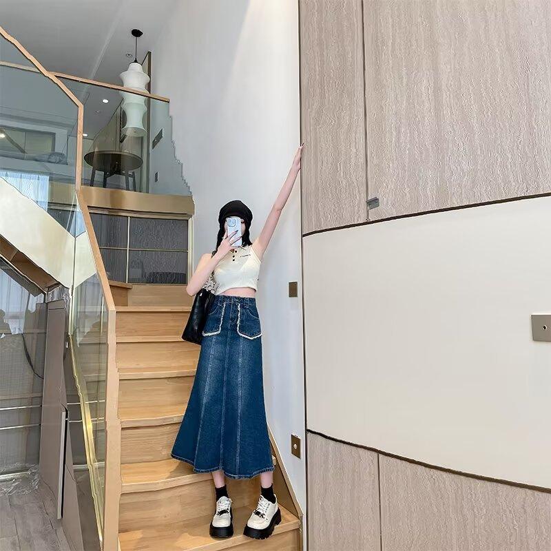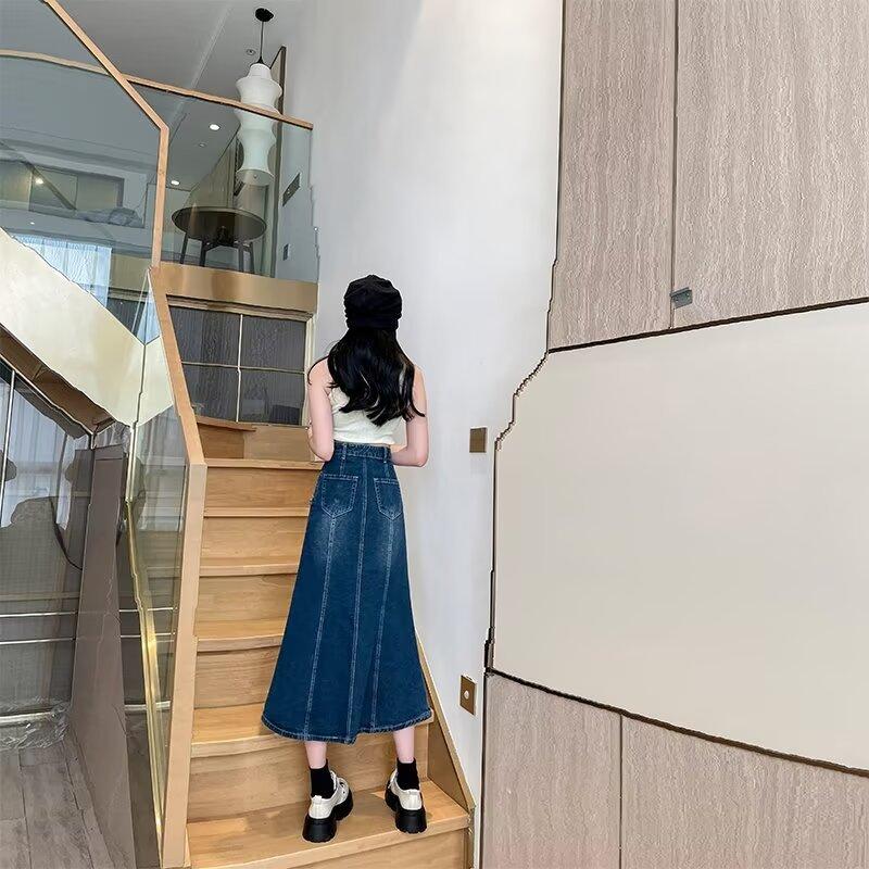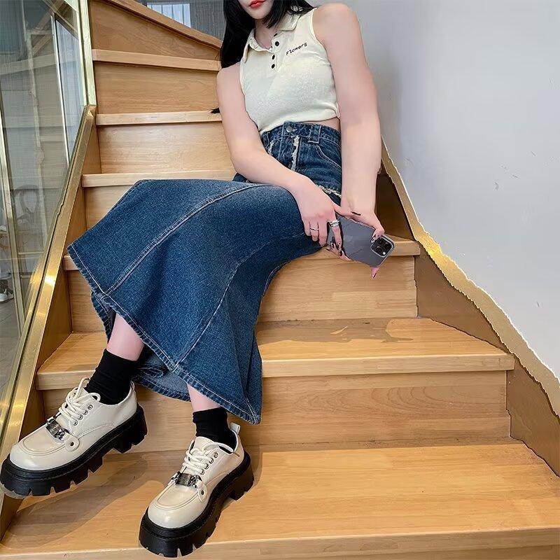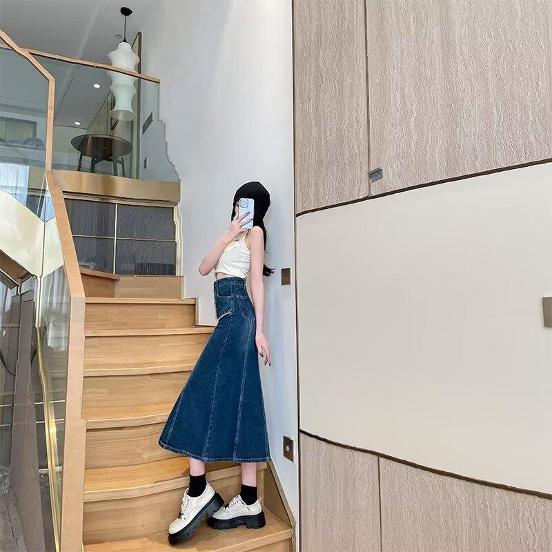 Falda larga de cintura alta con borde sin rematar, estilo retro, versátil y ajustada, de mezclilla versátil, primavera y verano 2024