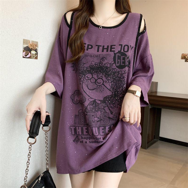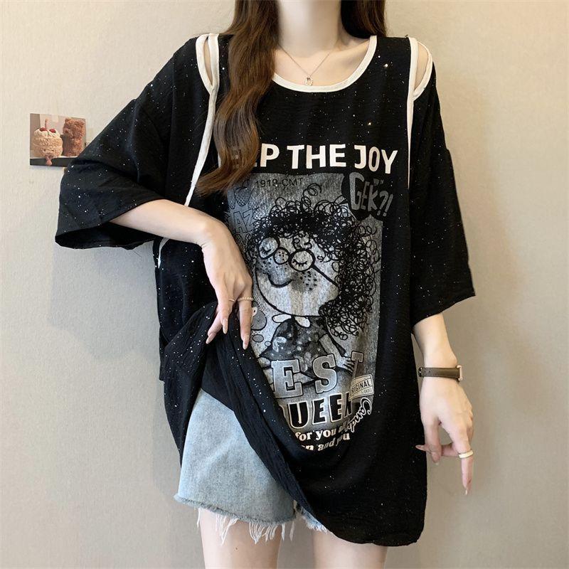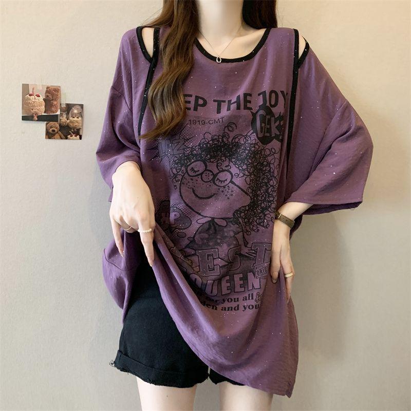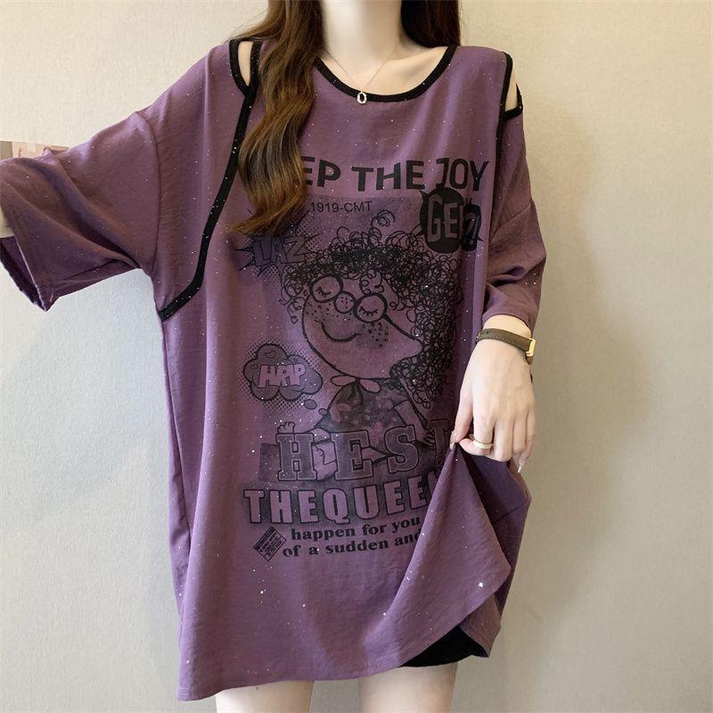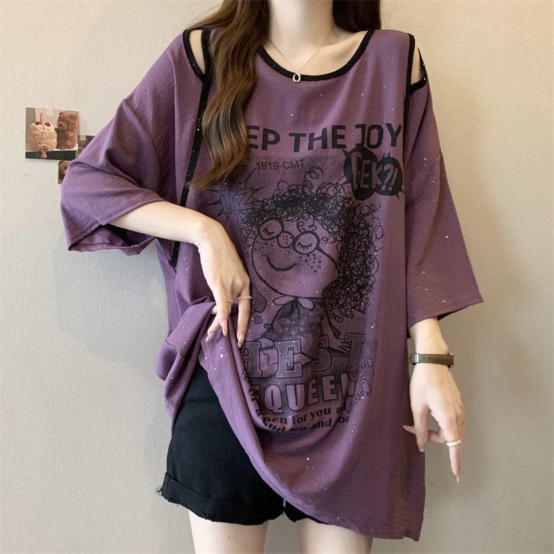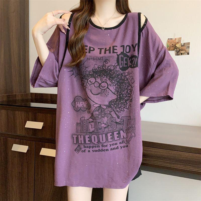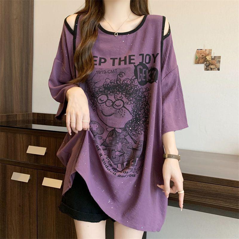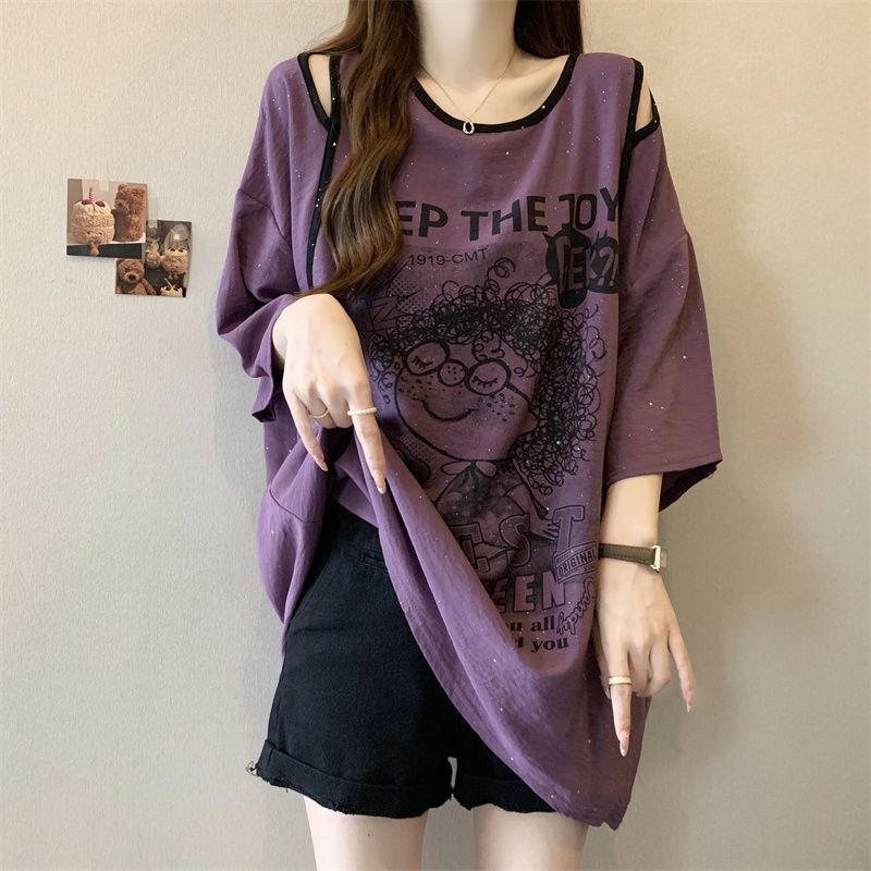 Camiseta de manga corta con hombros descubiertos para mujer, diseño holgado y adelgazante, estilo elegante y brillante, talla grande, para verano