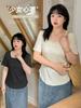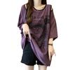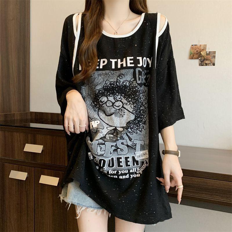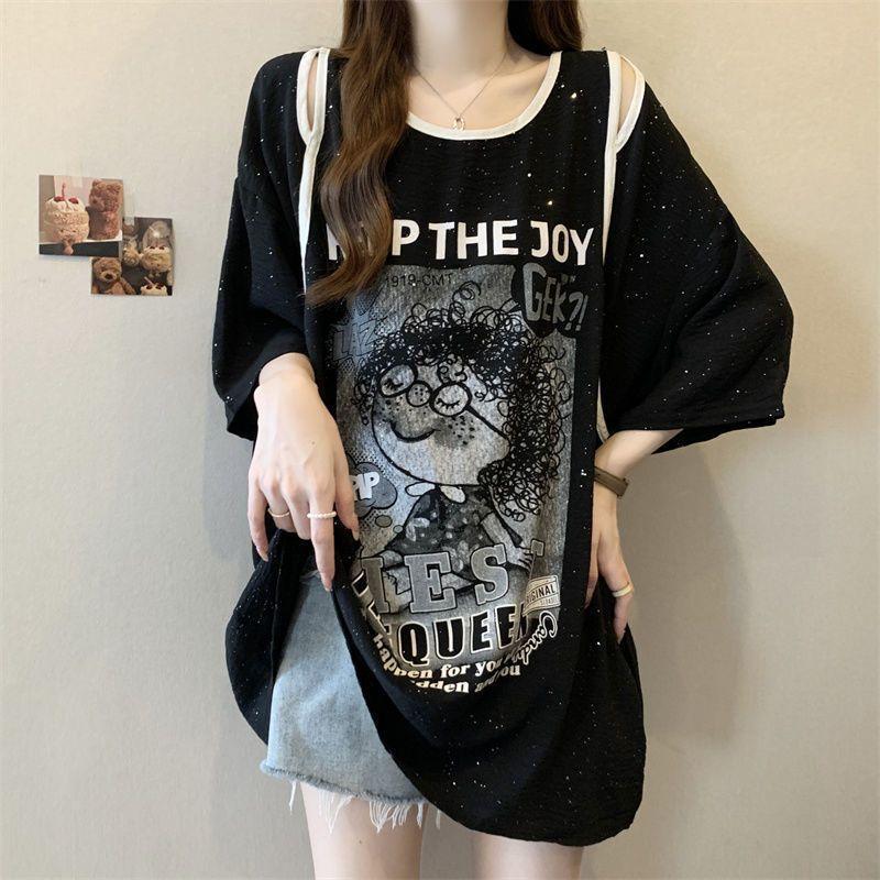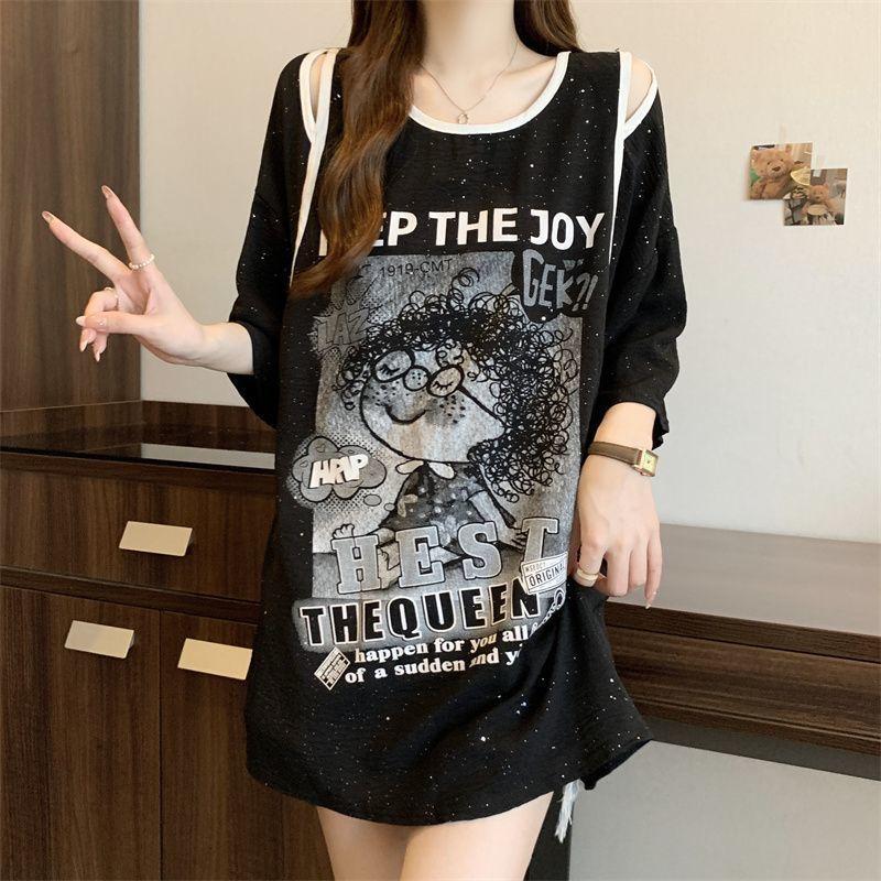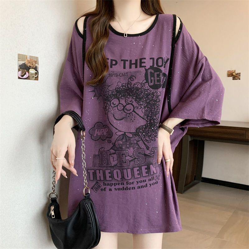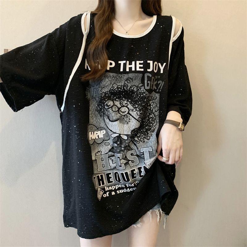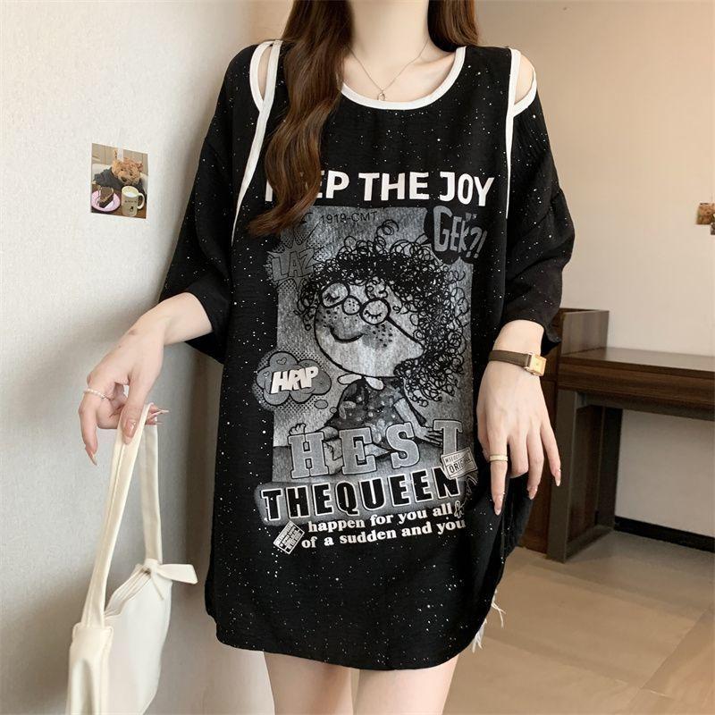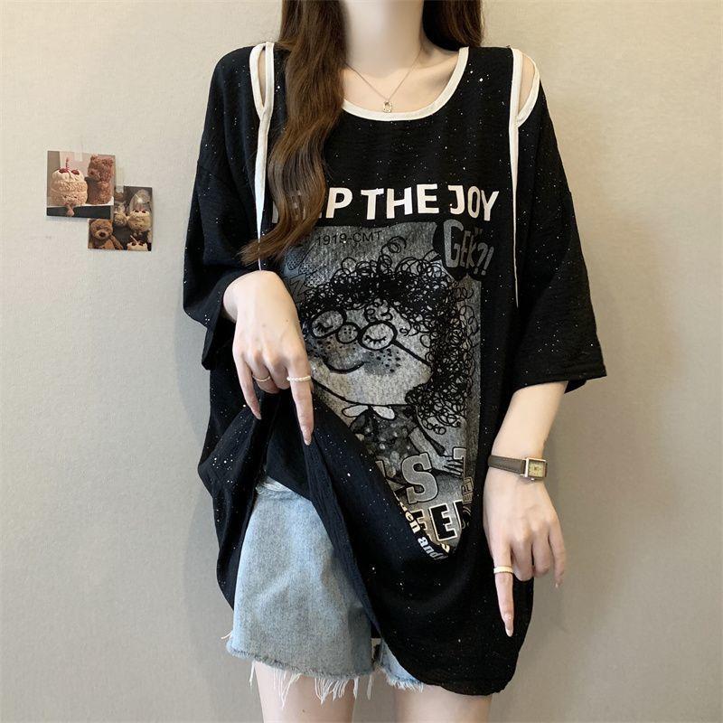Camiseta de manga corta con hombros descubiertos para mujer, diseño holgado y adelgazante, estilo elegante y brillante, talla grande, para verano
