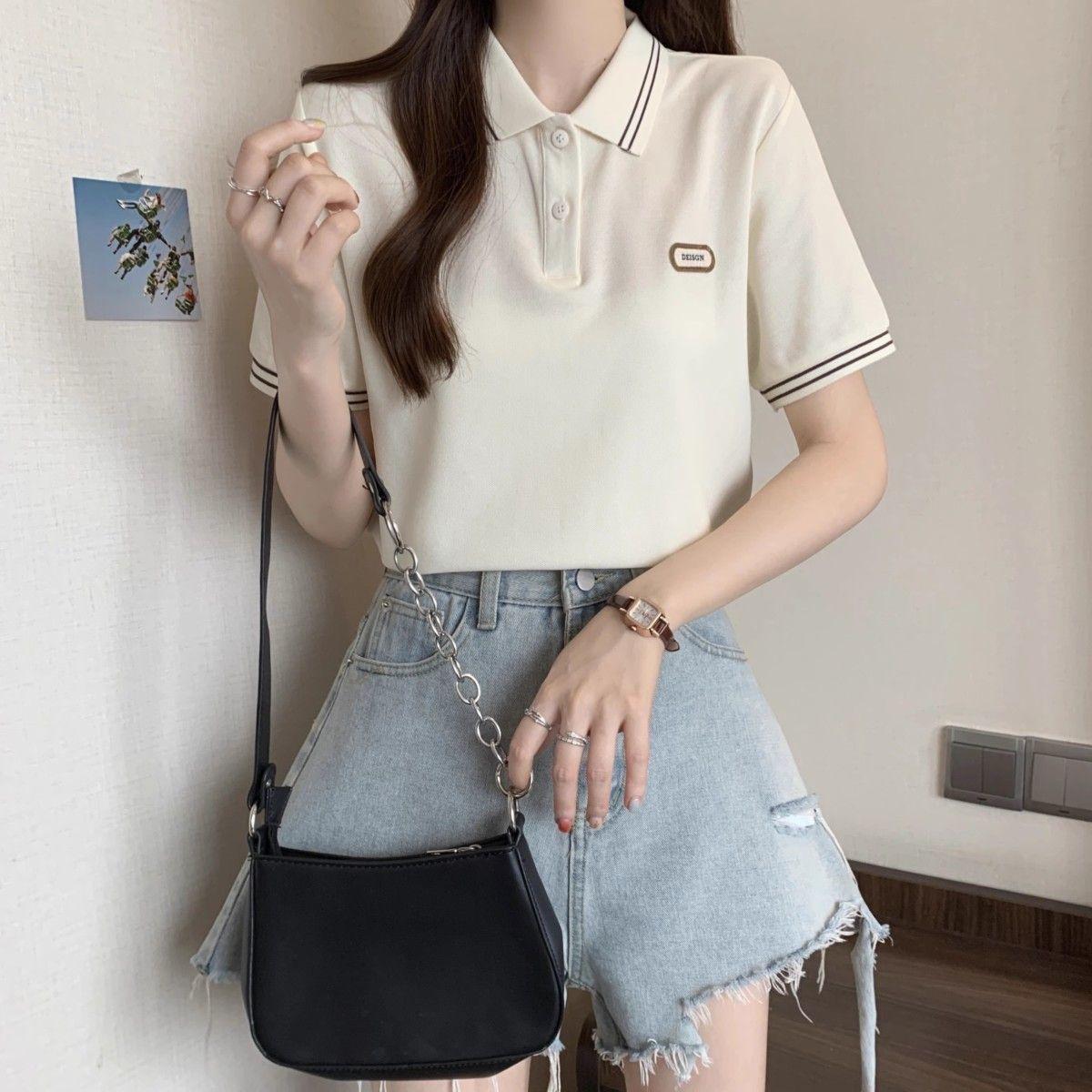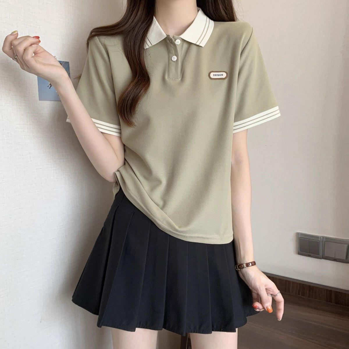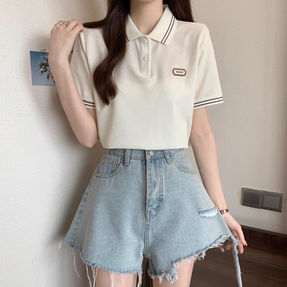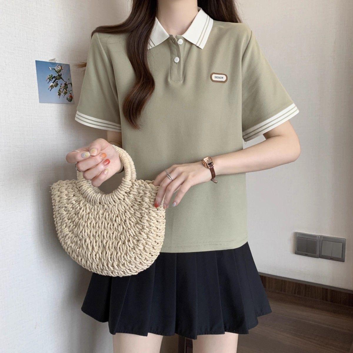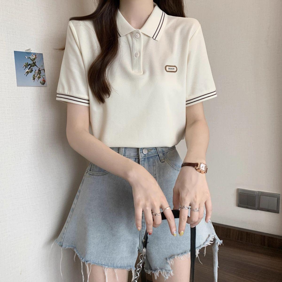 Camiseta holgada de manga corta de verano para mujer de talla grande, estilo universitario, con cuello polo y hombros descubiertos, para chica gordita