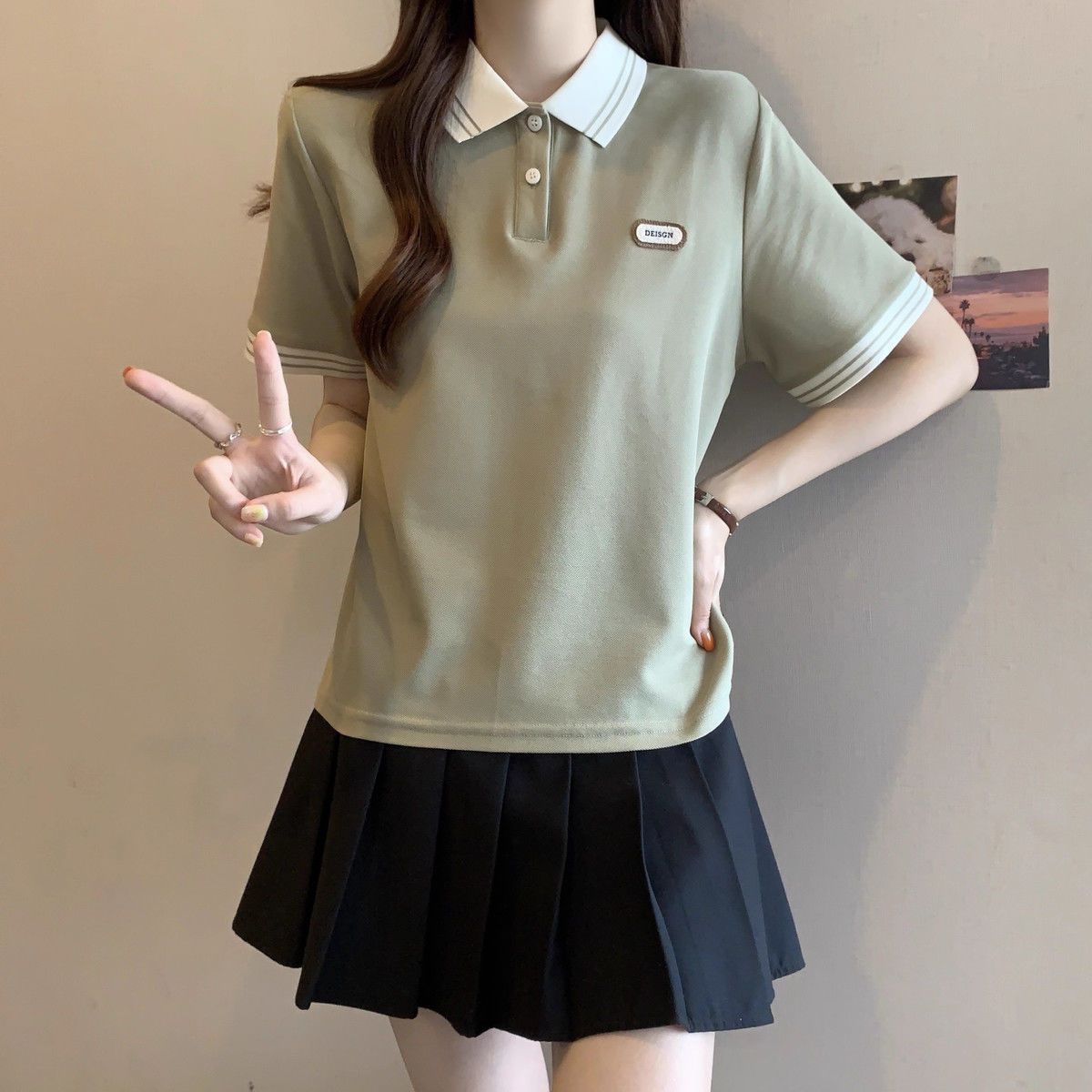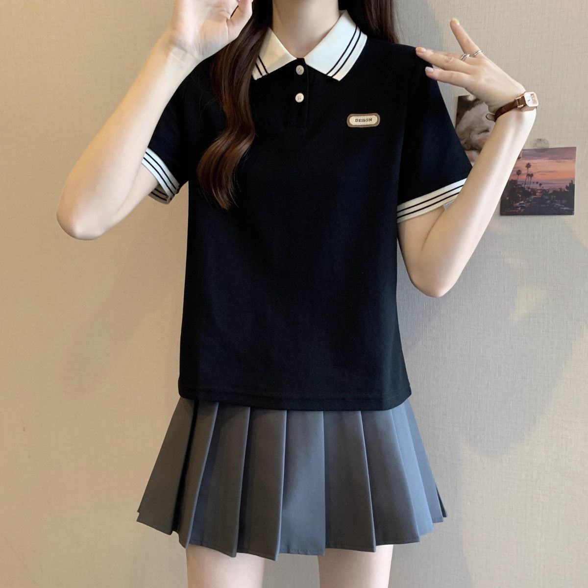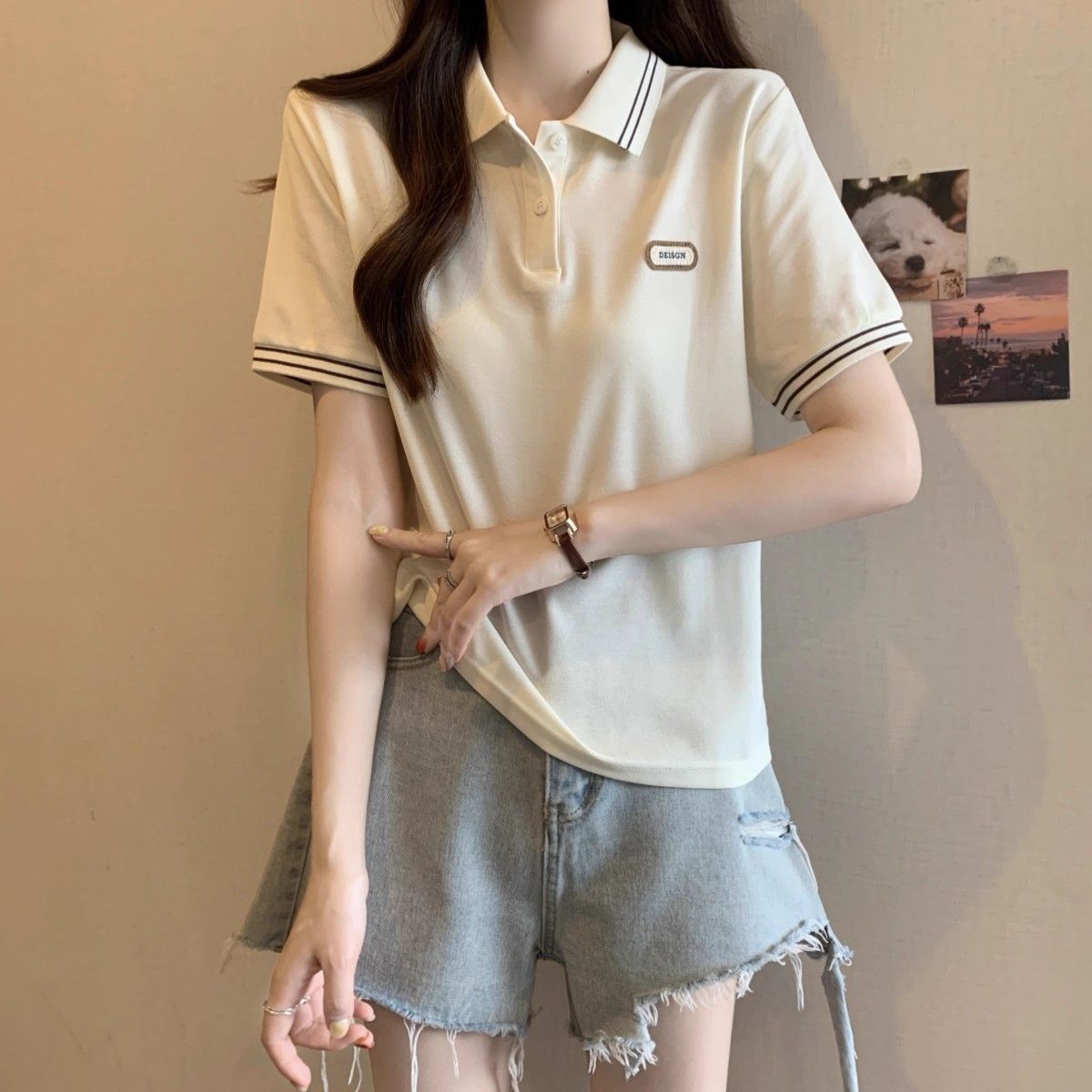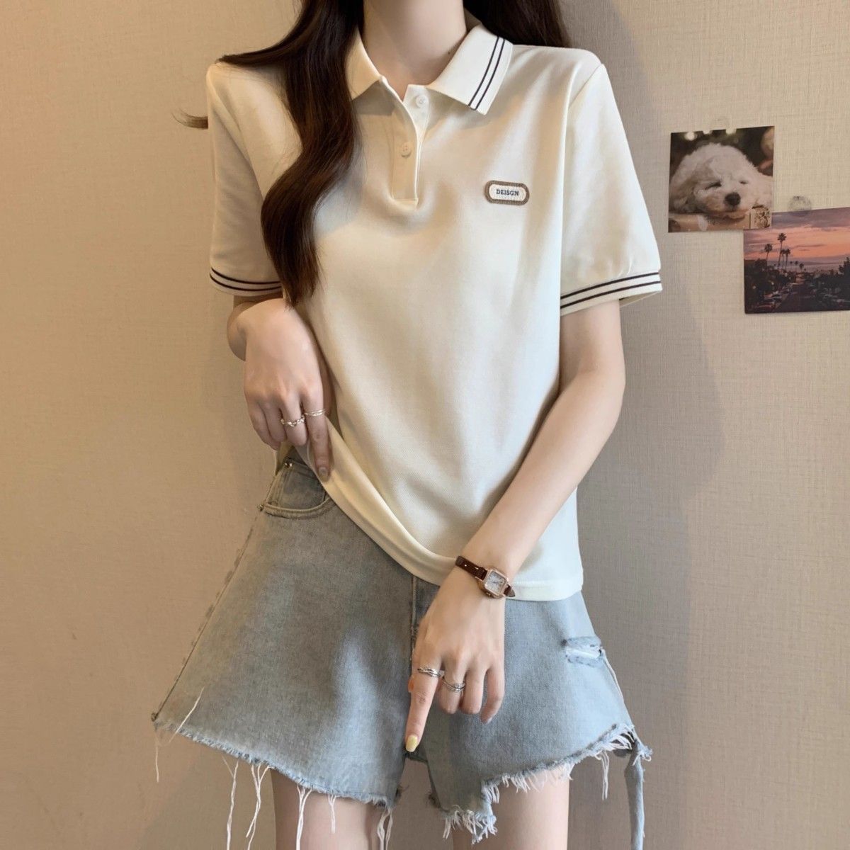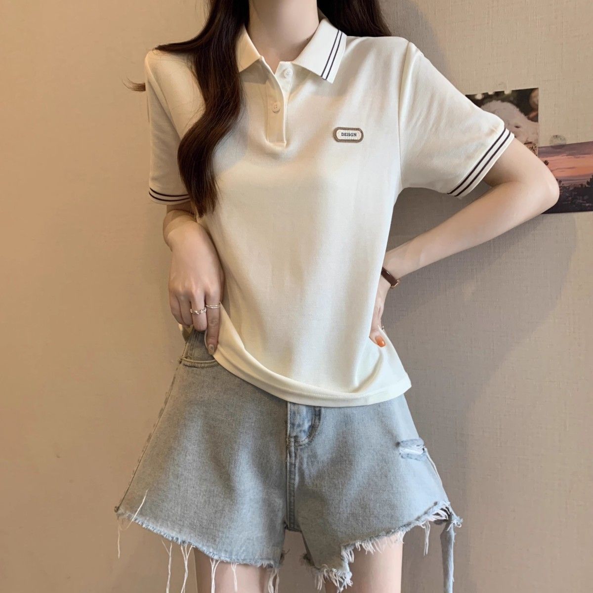 Camiseta holgada de manga corta de verano para mujer de talla grande, estilo universitario, con cuello polo y hombros descubiertos, para chica gordita