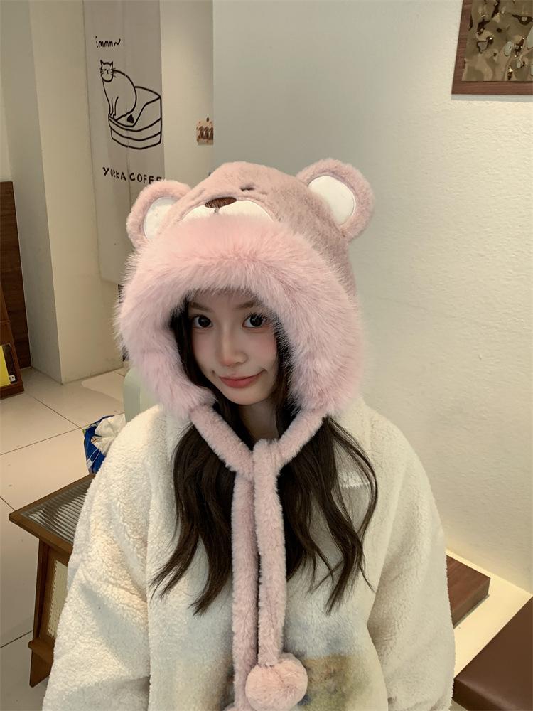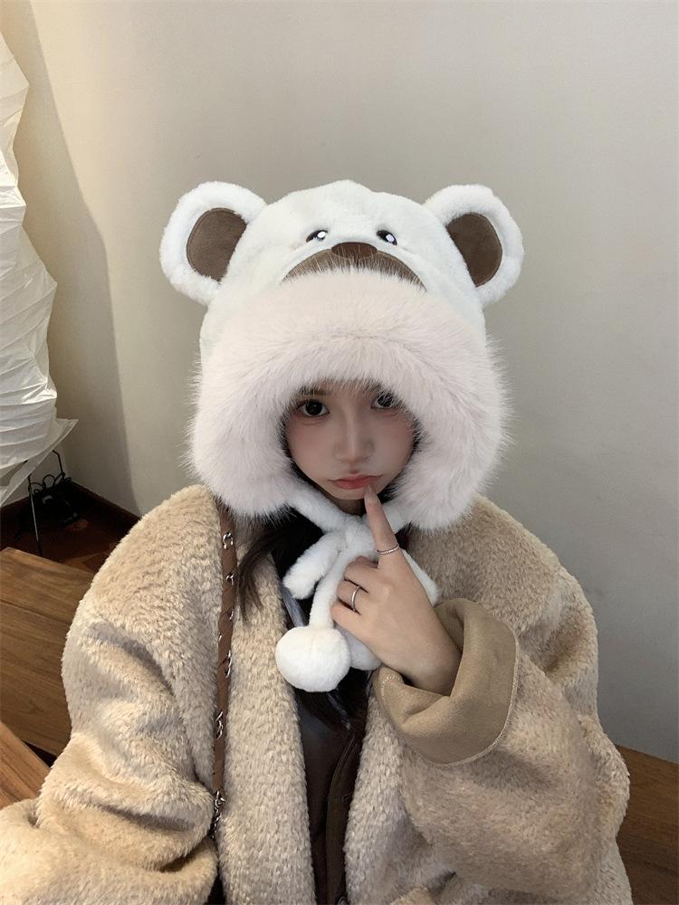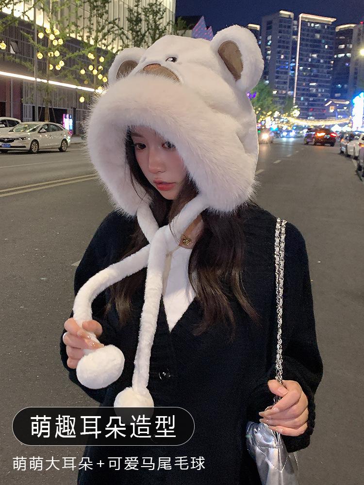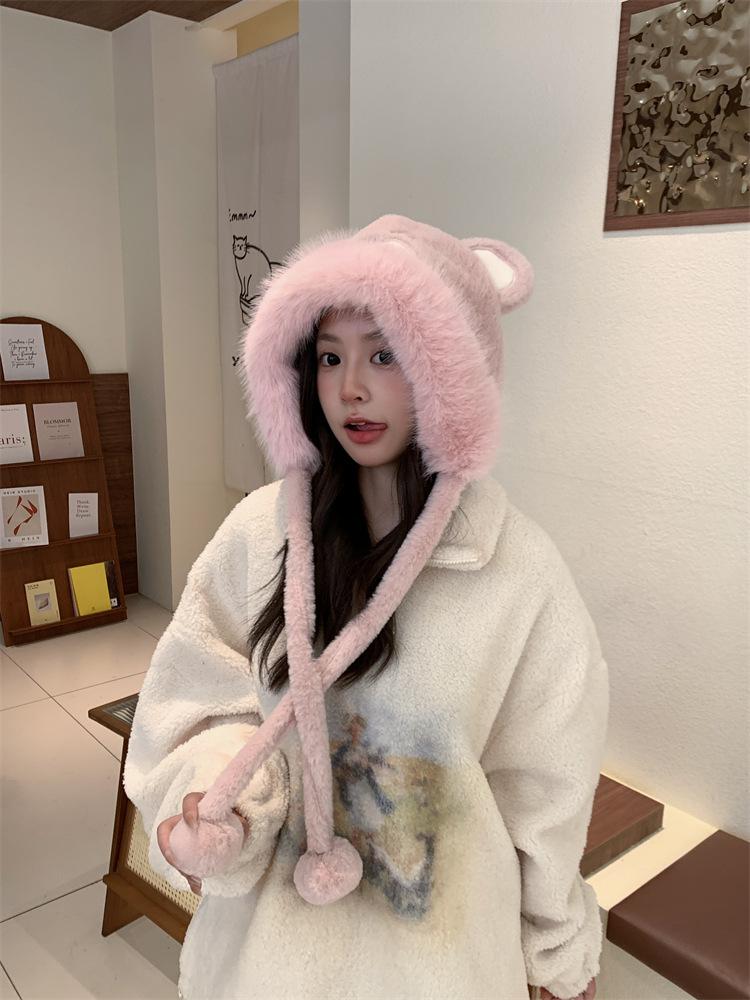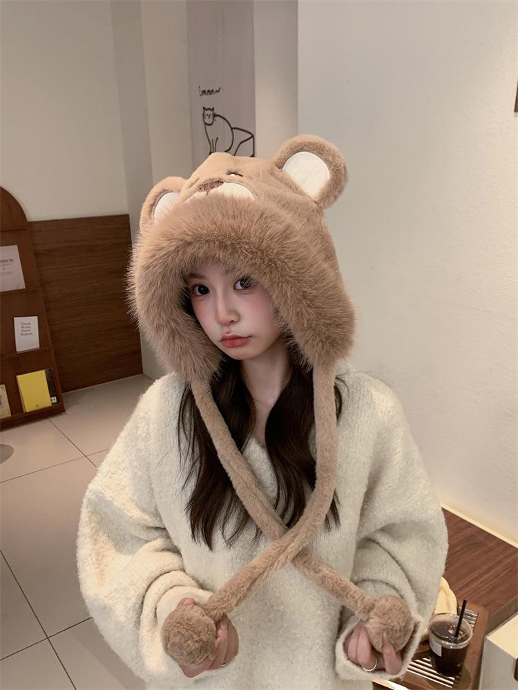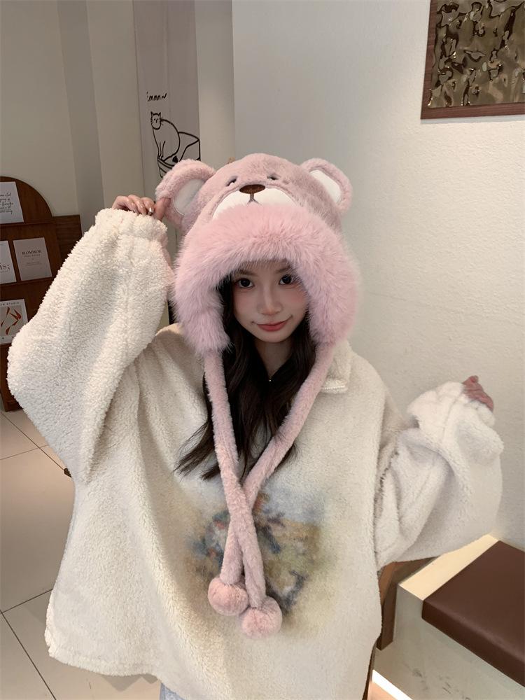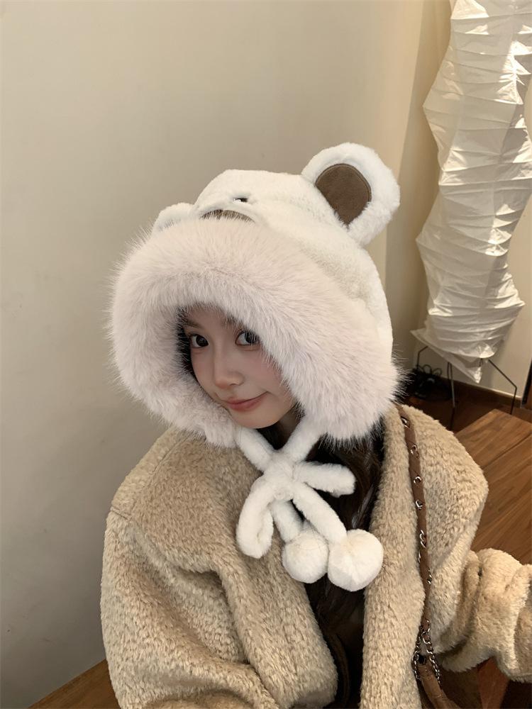 2024 Nuevo estilo coreano lindo gorro Lei Feng para mujer, otoño e invierno, gorro esponjoso con orejas de oso, gorro grueso para montar a caballo, resistente al frío y con protección para las orejas.