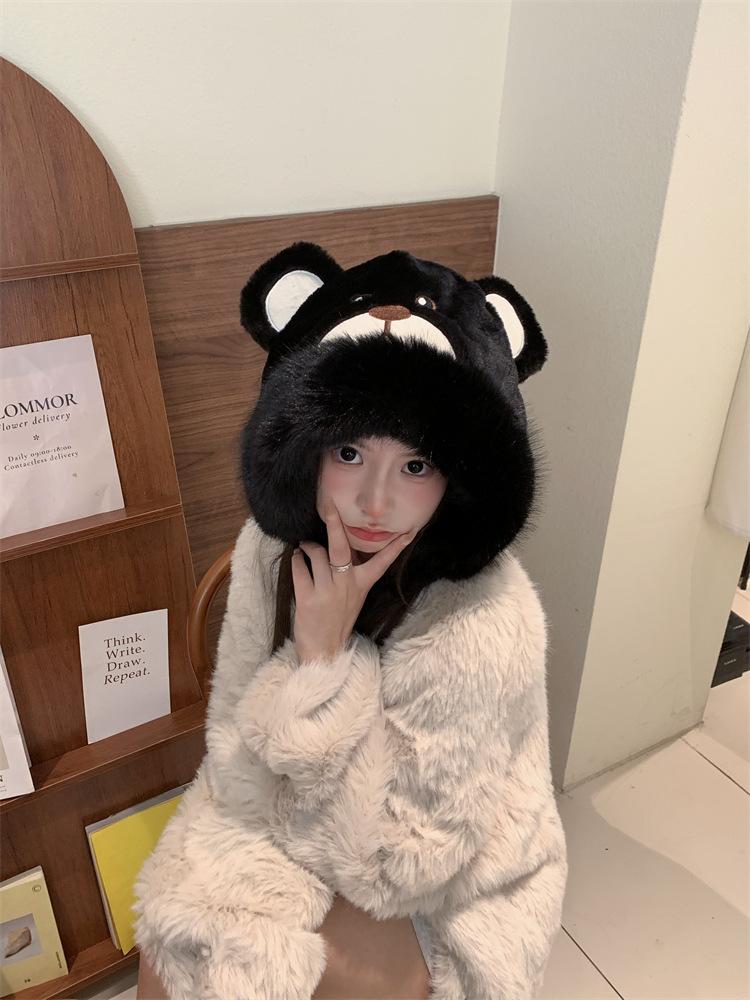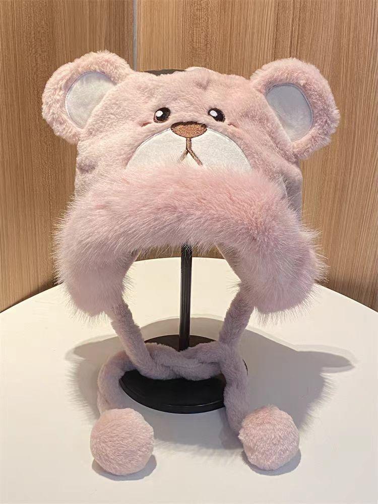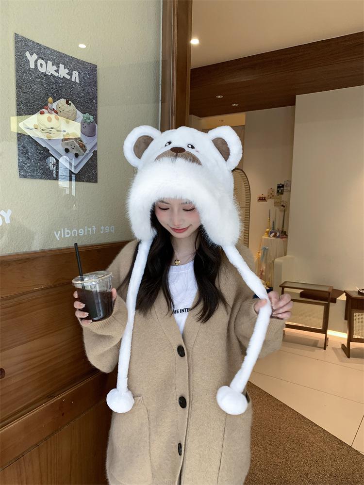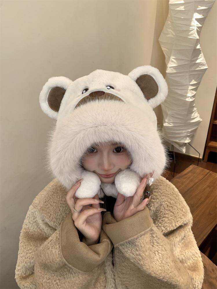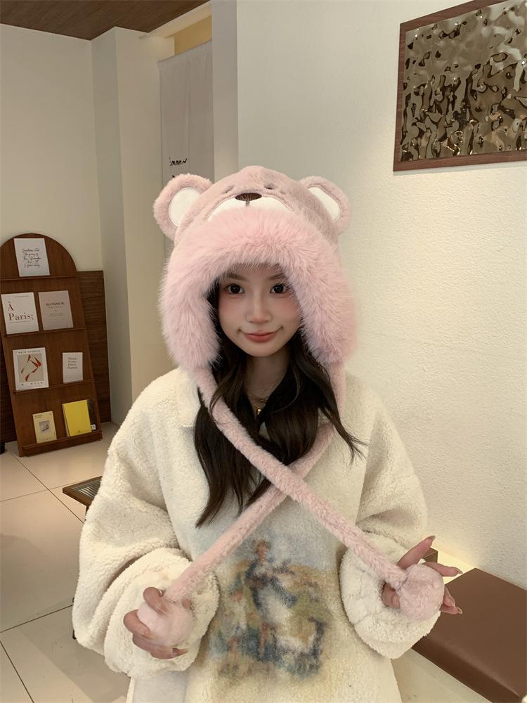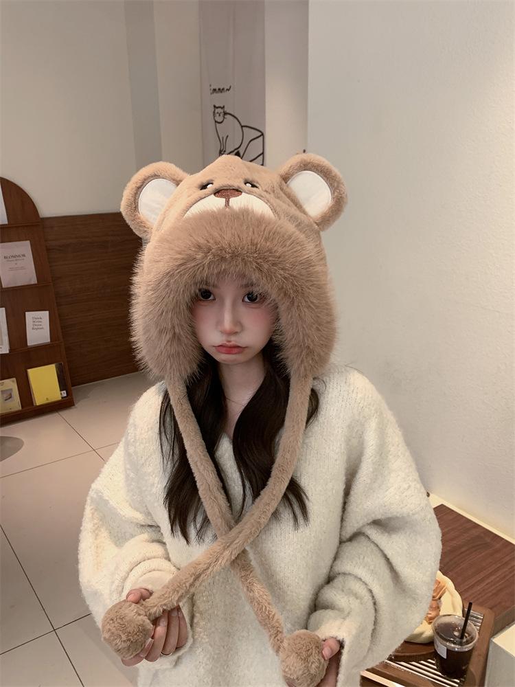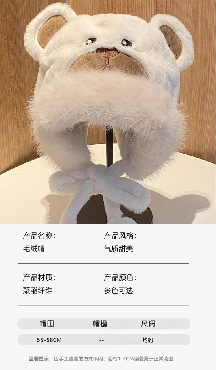2024 Nuevo estilo coreano lindo gorro Lei Feng para mujer, otoño e invierno, gorro esponjoso con orejas de oso, gorro grueso para montar a caballo, resistente al frío y con protección para las orejas.