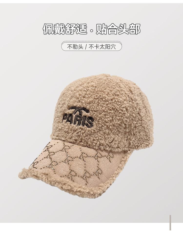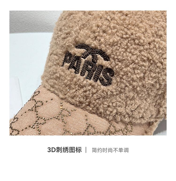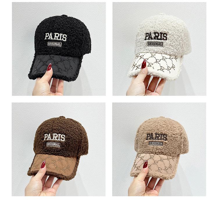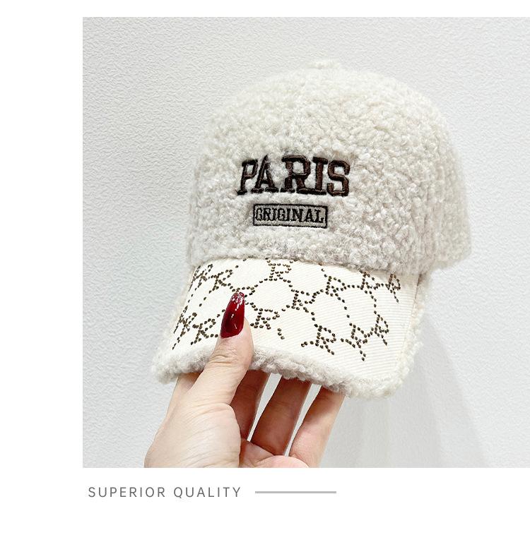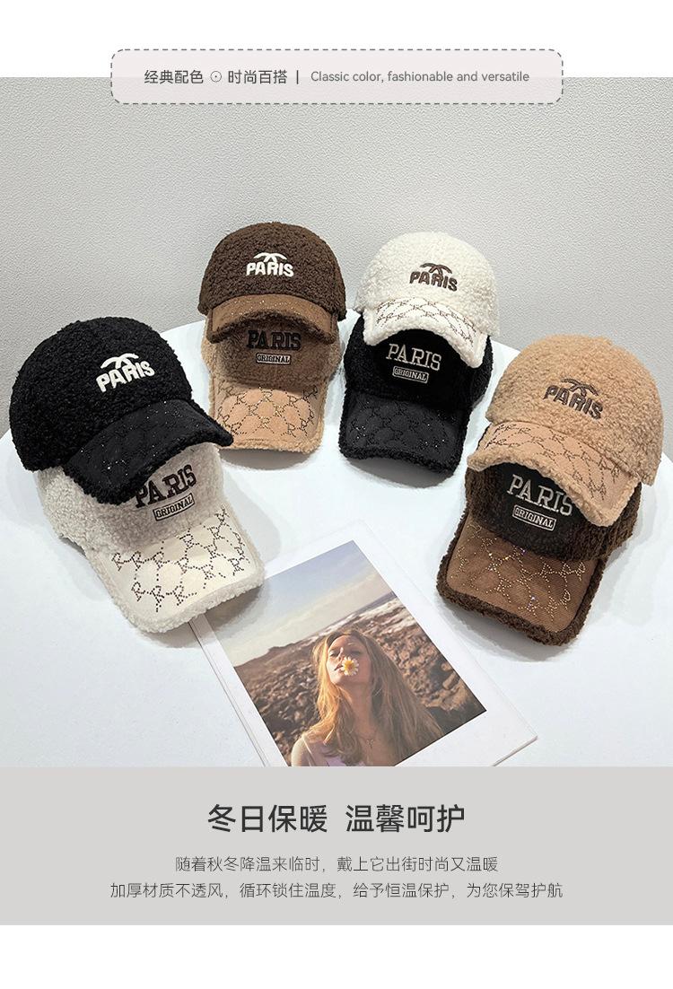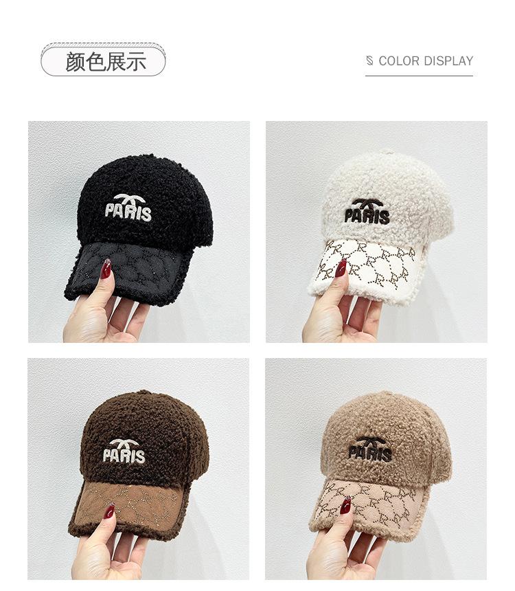 Gorra de Béisbol con Letras Bordadas de Moda Coreana para Mujer Invierno Cálida Combinable Muestra el Rostro Pequeños Diamantes de Imitación Gorra de Lana de Cordero