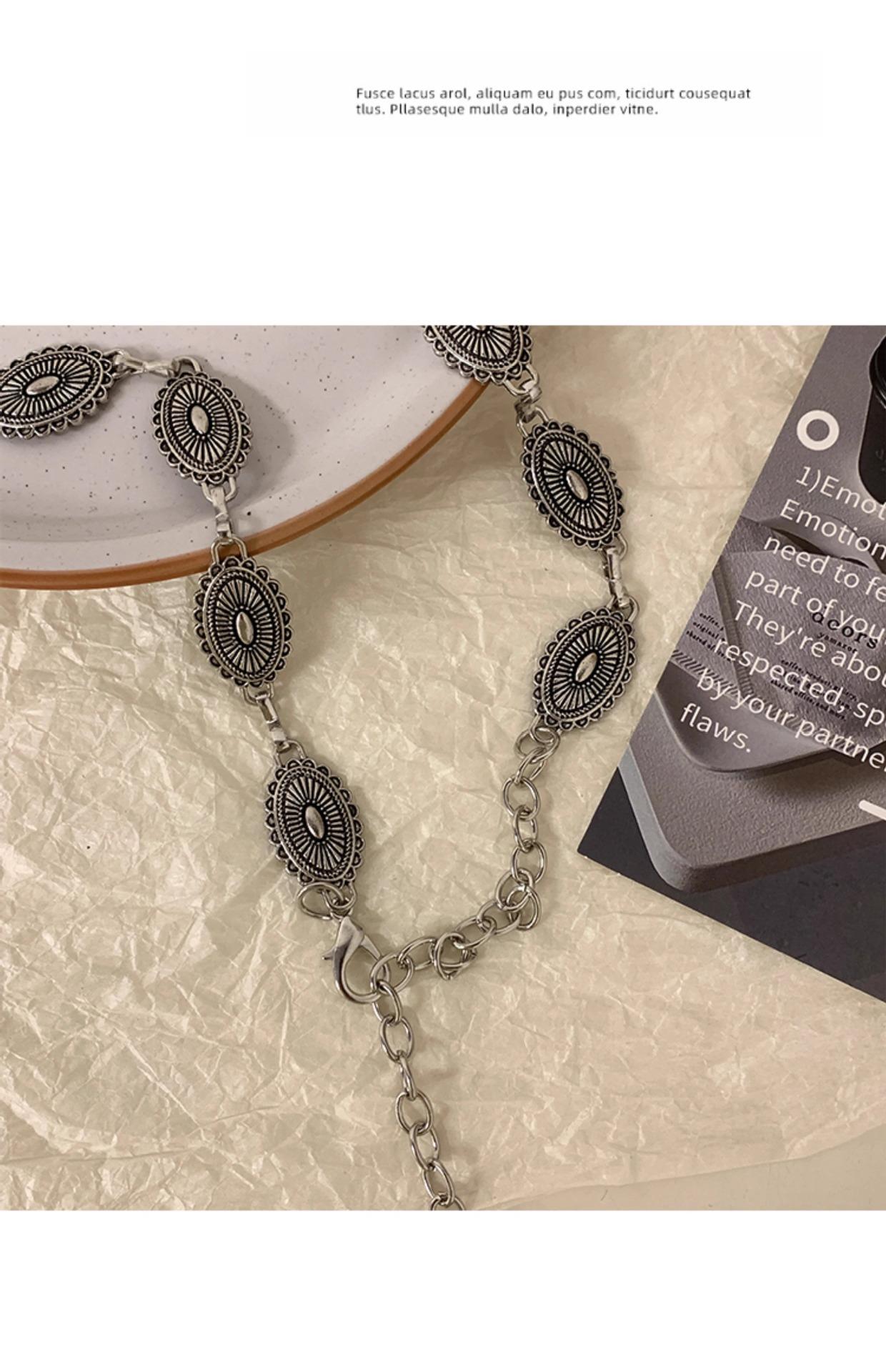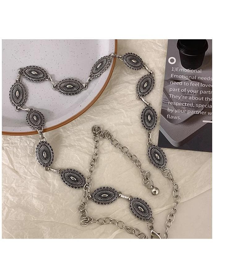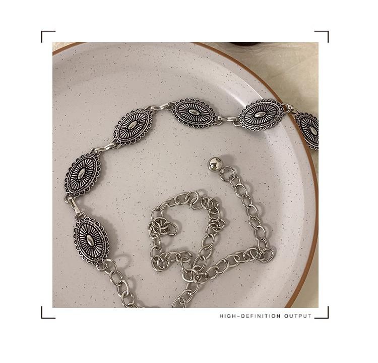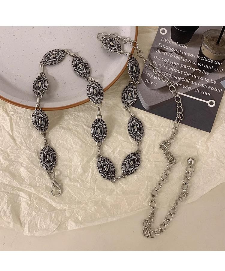 Cinturón de cintura de metal plateado con diseño de nicho para mujer, estilo étnico retro, a juego.
