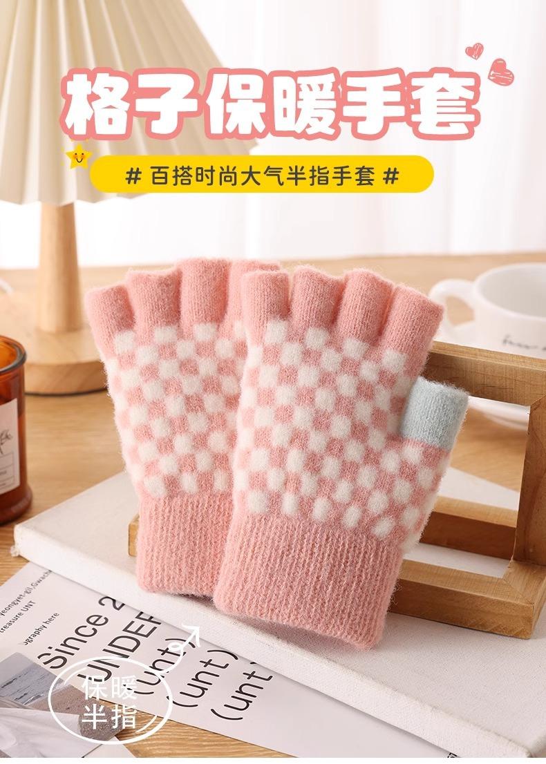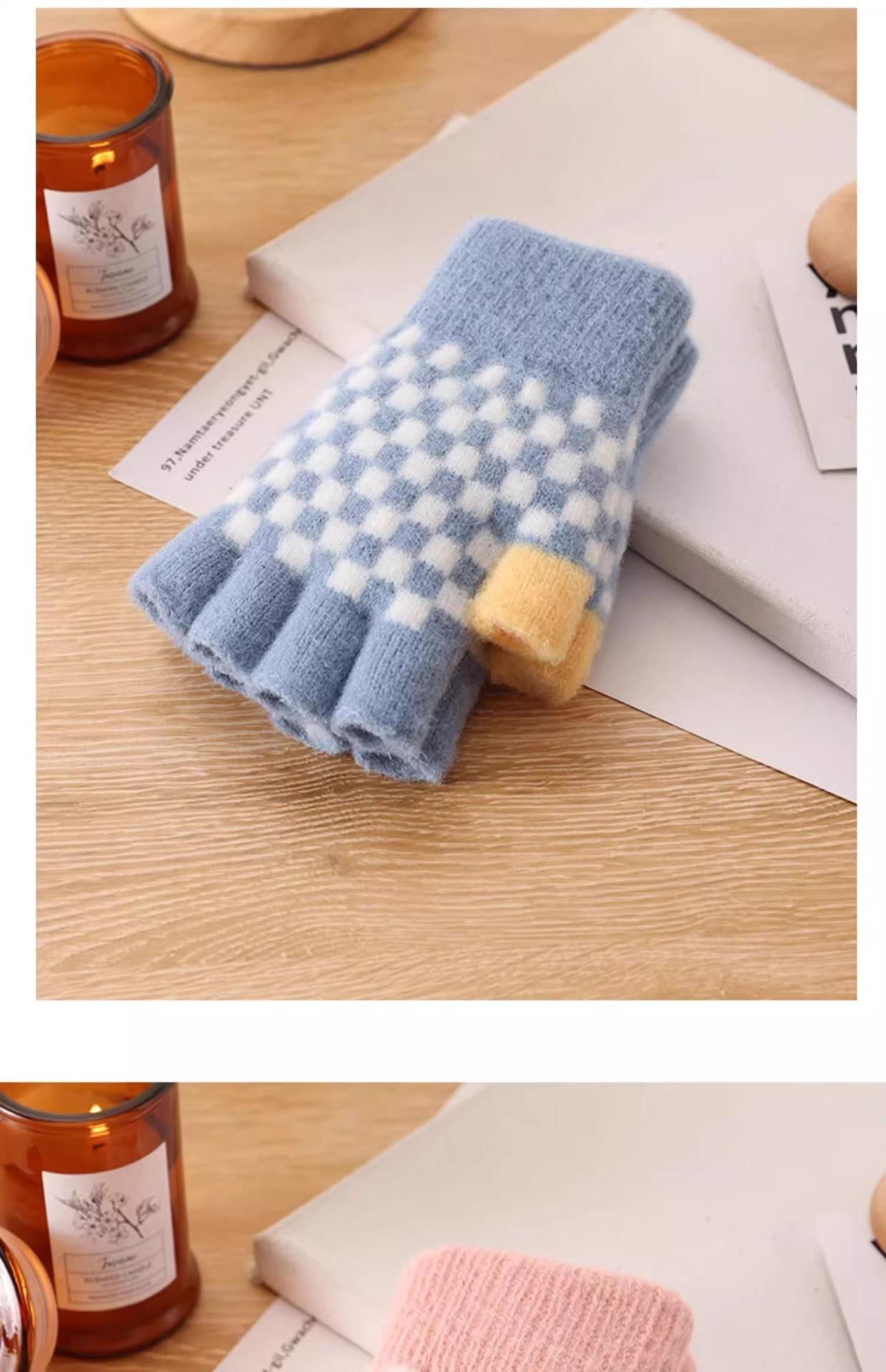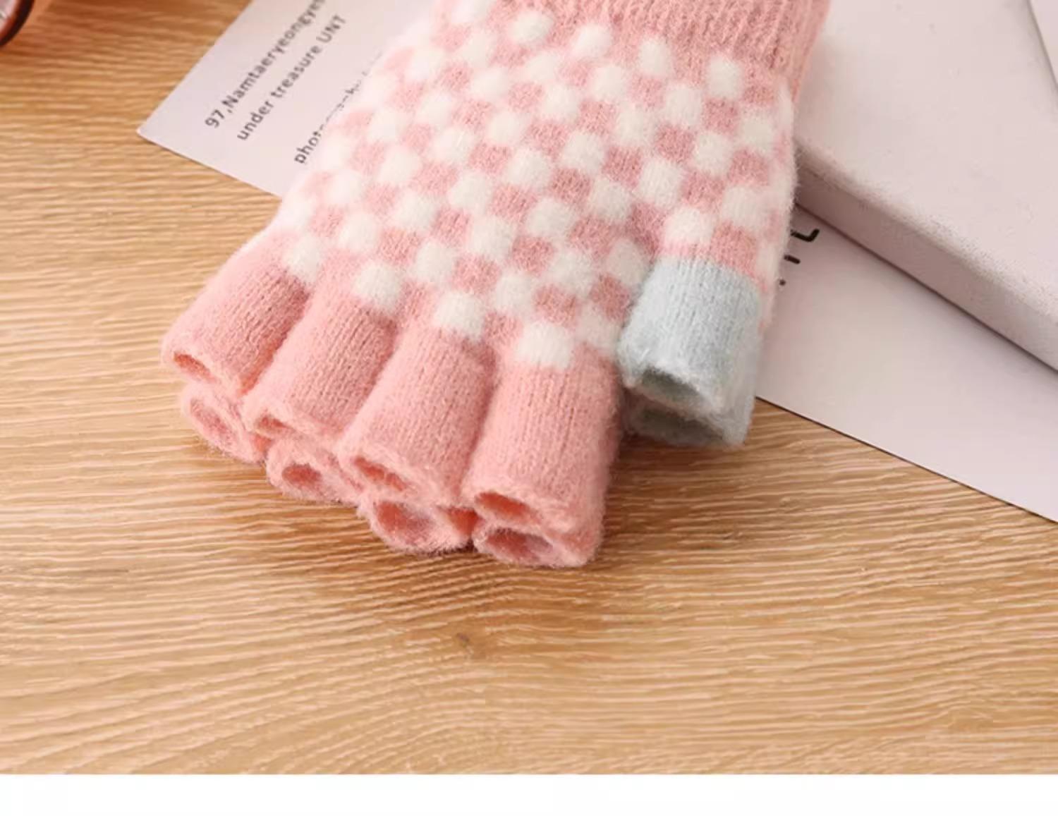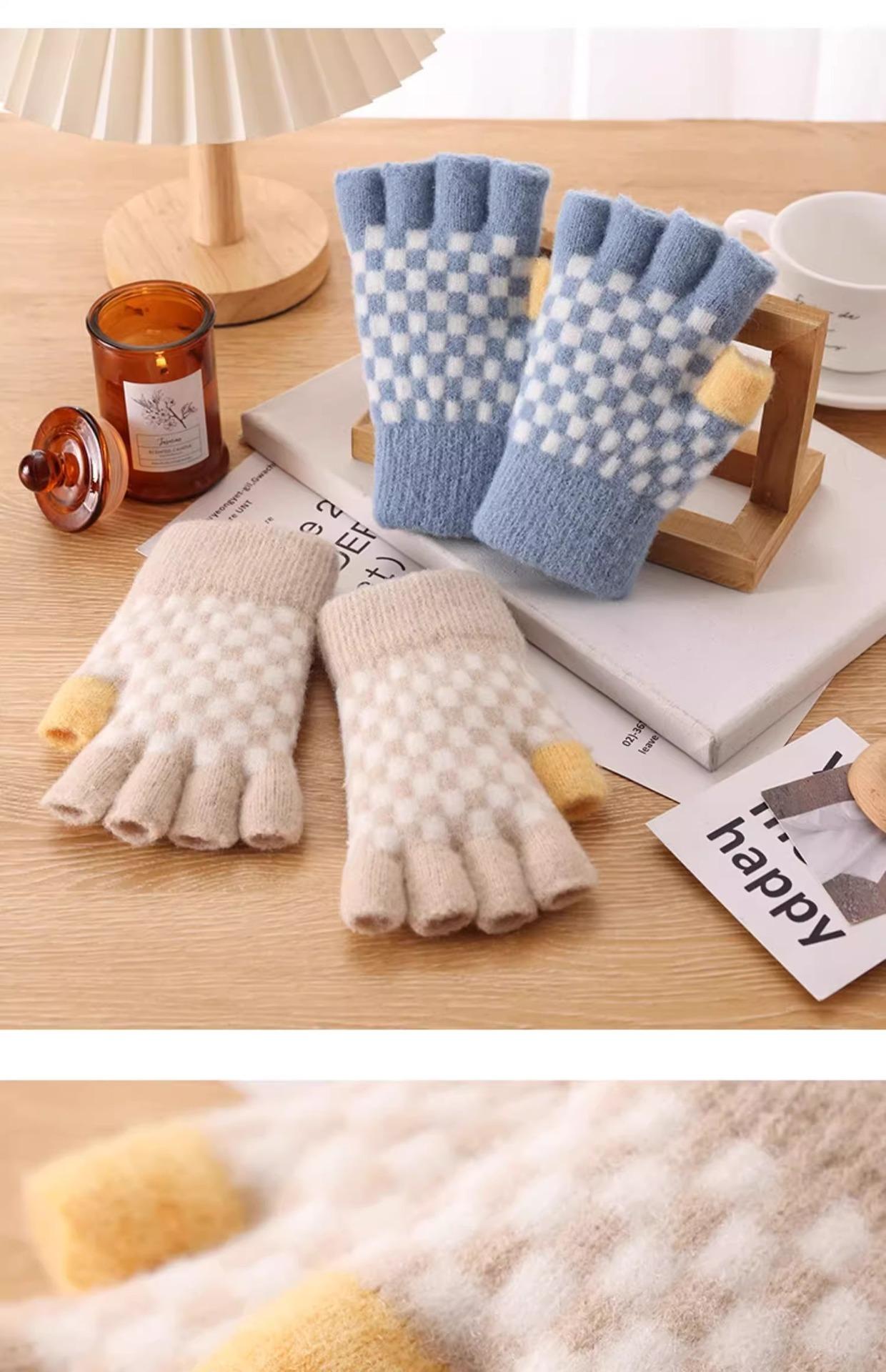 Guantes de punto de medio dedo para mujer, de invierno, gruesos, cálidos, bonitos, a cuadros, con dedos extra, para pantalla táctil, para ciclismo de invierno, resistentes al frío.