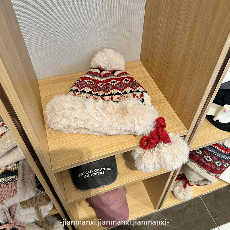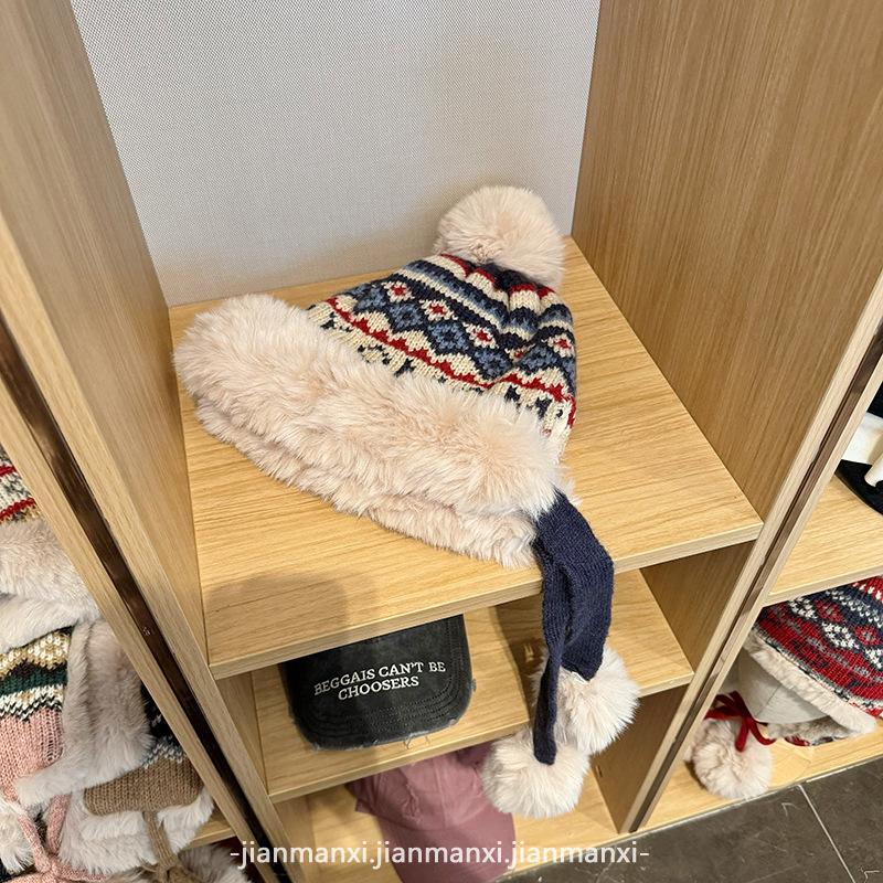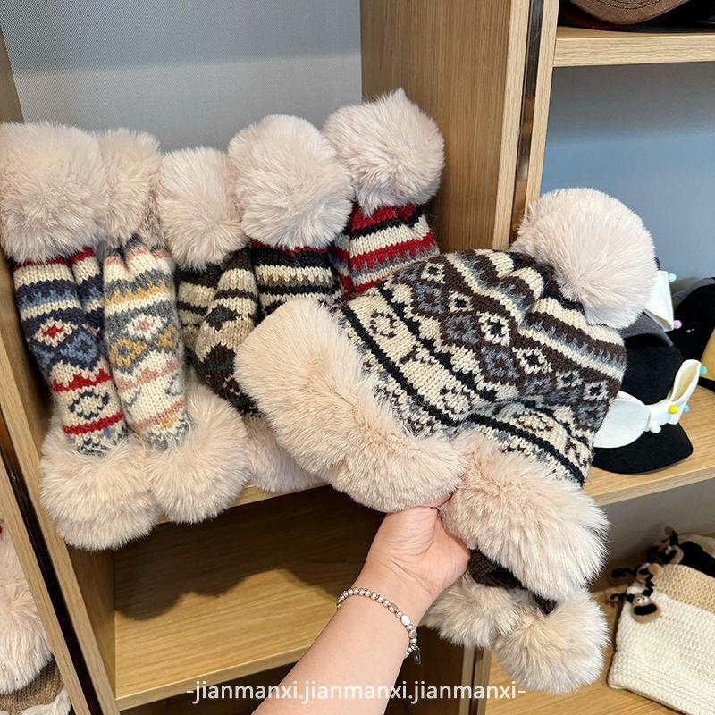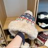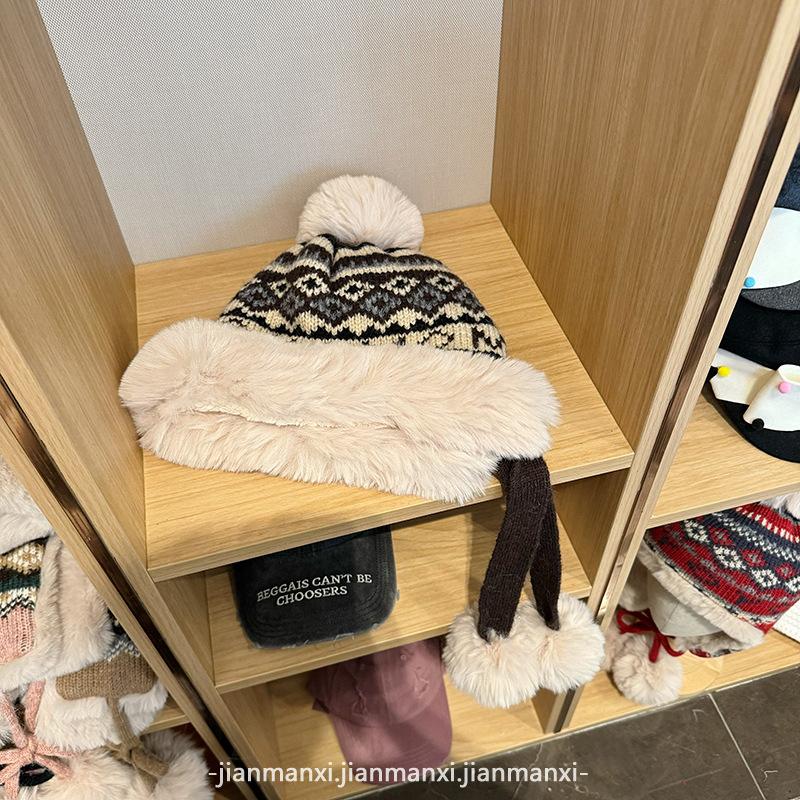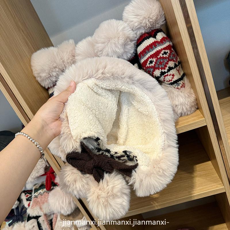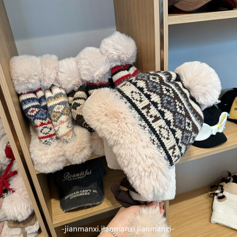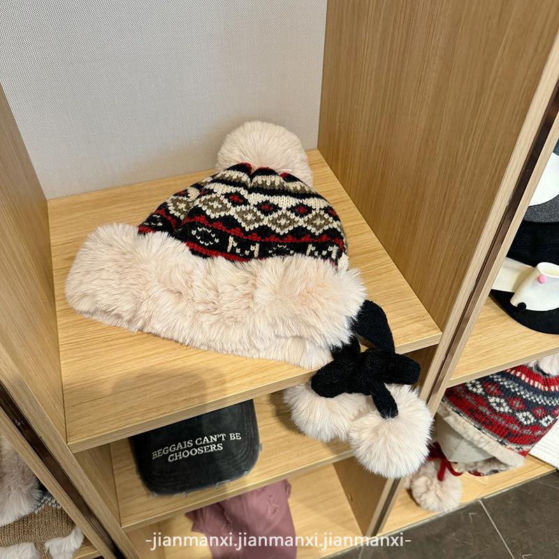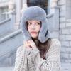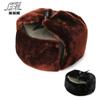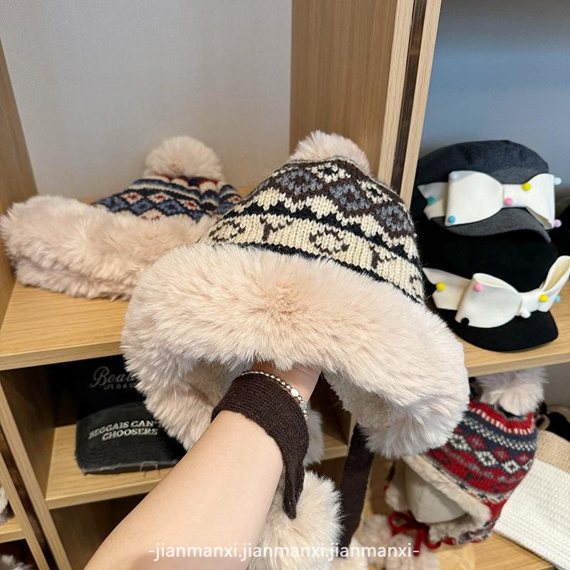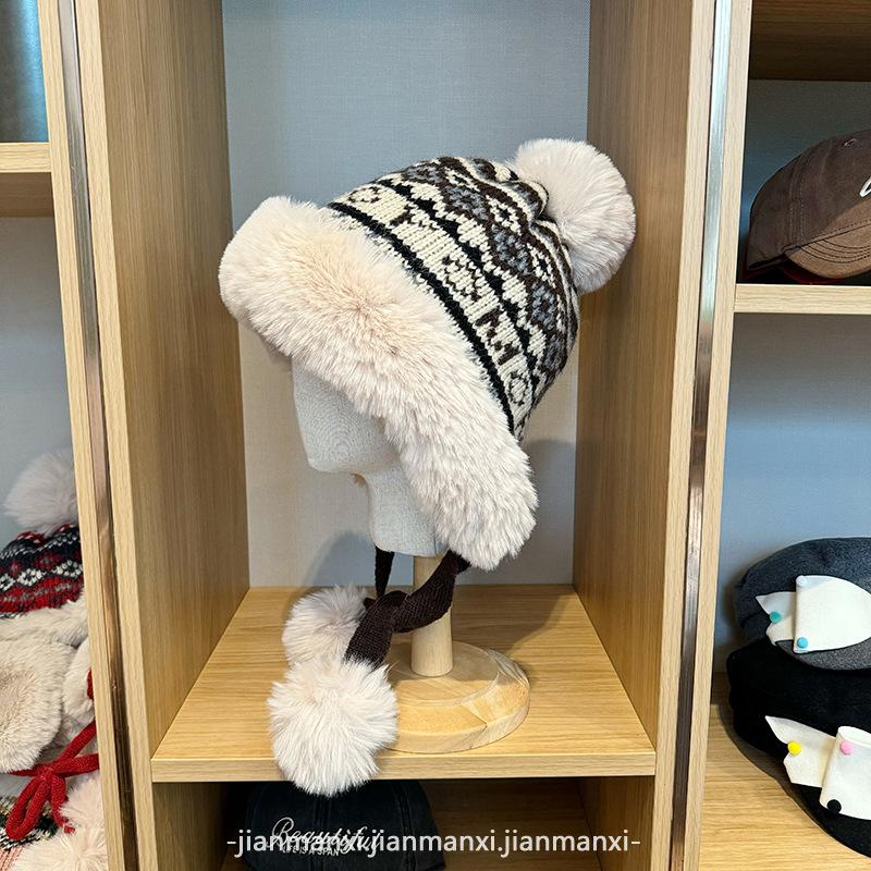 Otoño e Invierno Nuevo Gorro Lei Feng con forro polar para mujer Estilo étnico Cálido Protección para las orejas Gorro con pompón de piel Montar a prueba de frío Gorro grueso para protección de las orejas