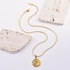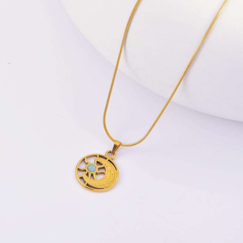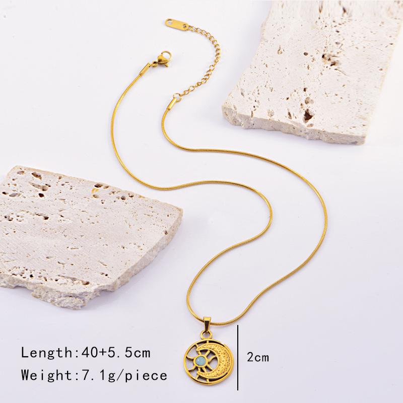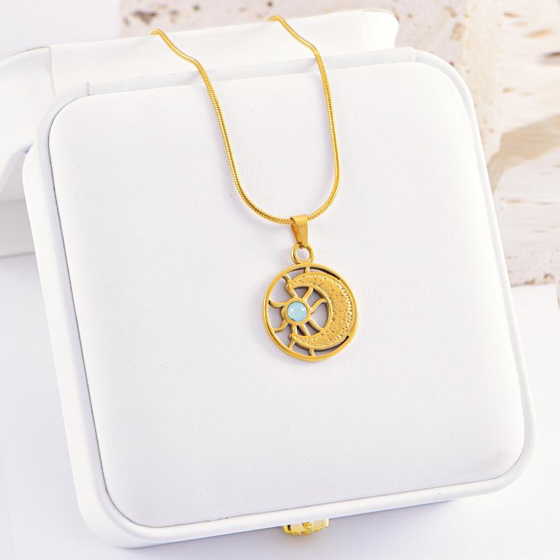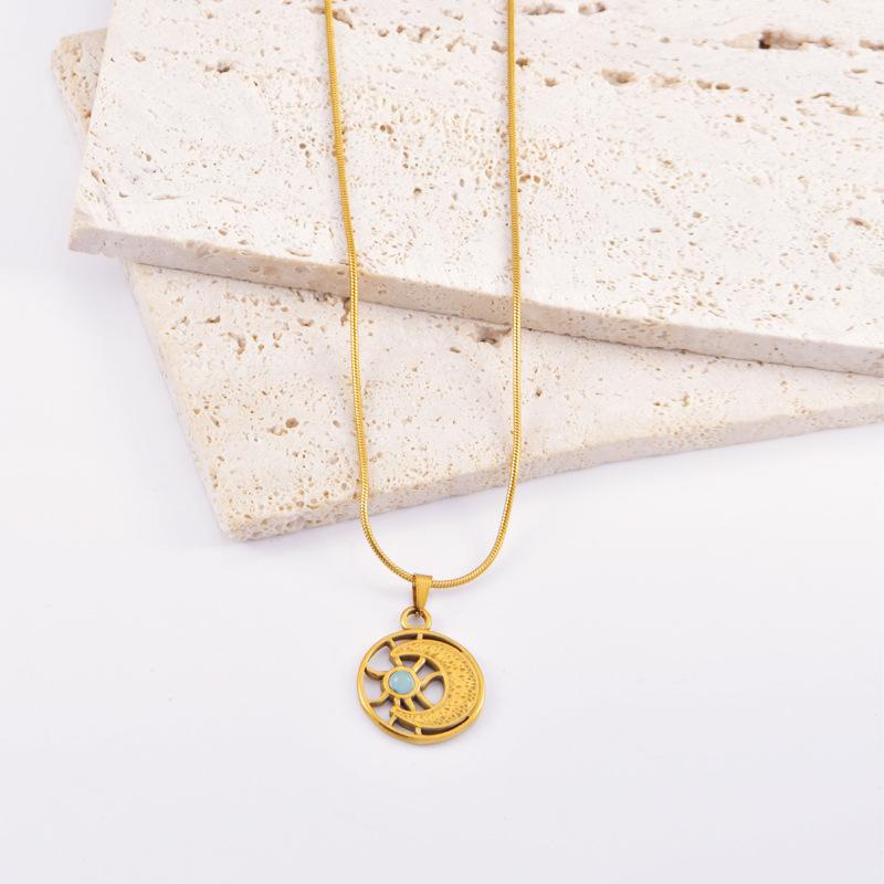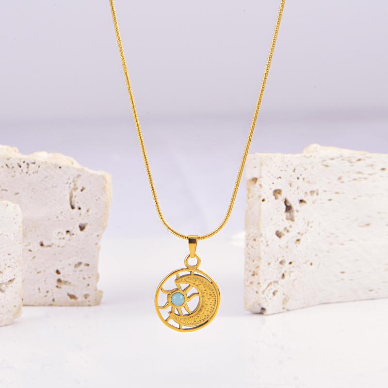 Anillo retro francés con colgante de sol y luna para mujer, cadena de clavícula de acero inoxidable con incrustaciones de piedra de ojo de gato, collar redondo con serpiente