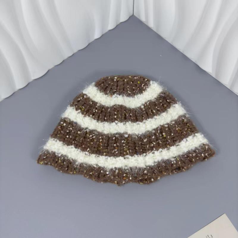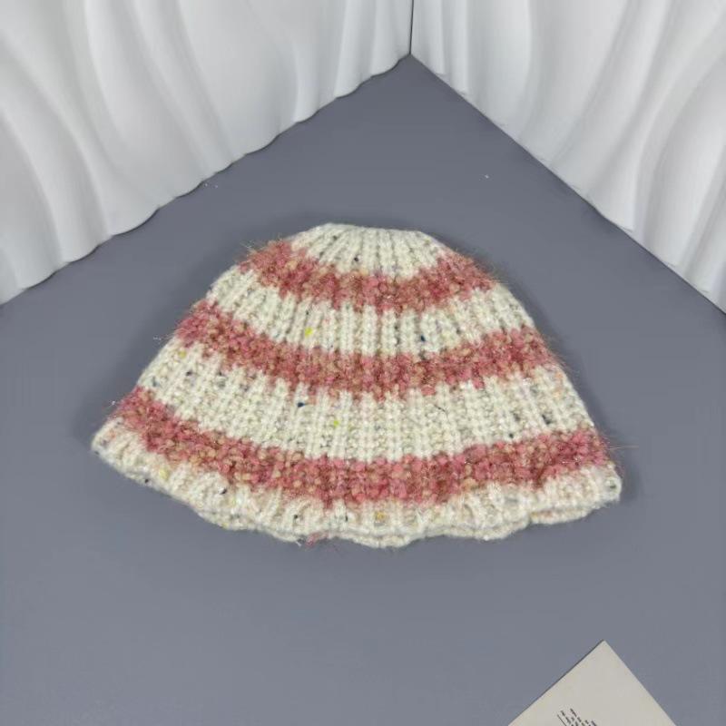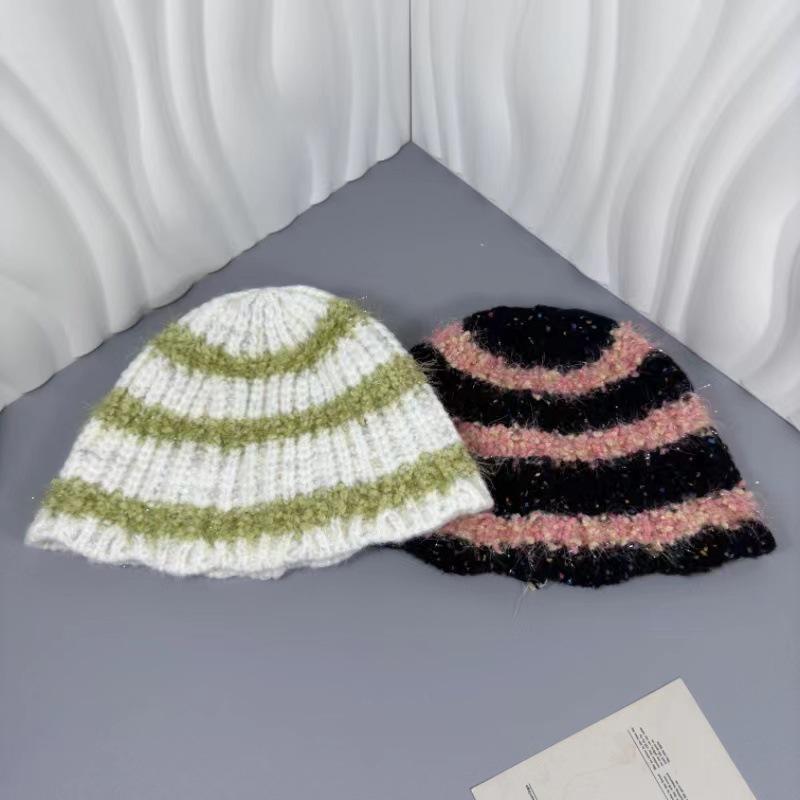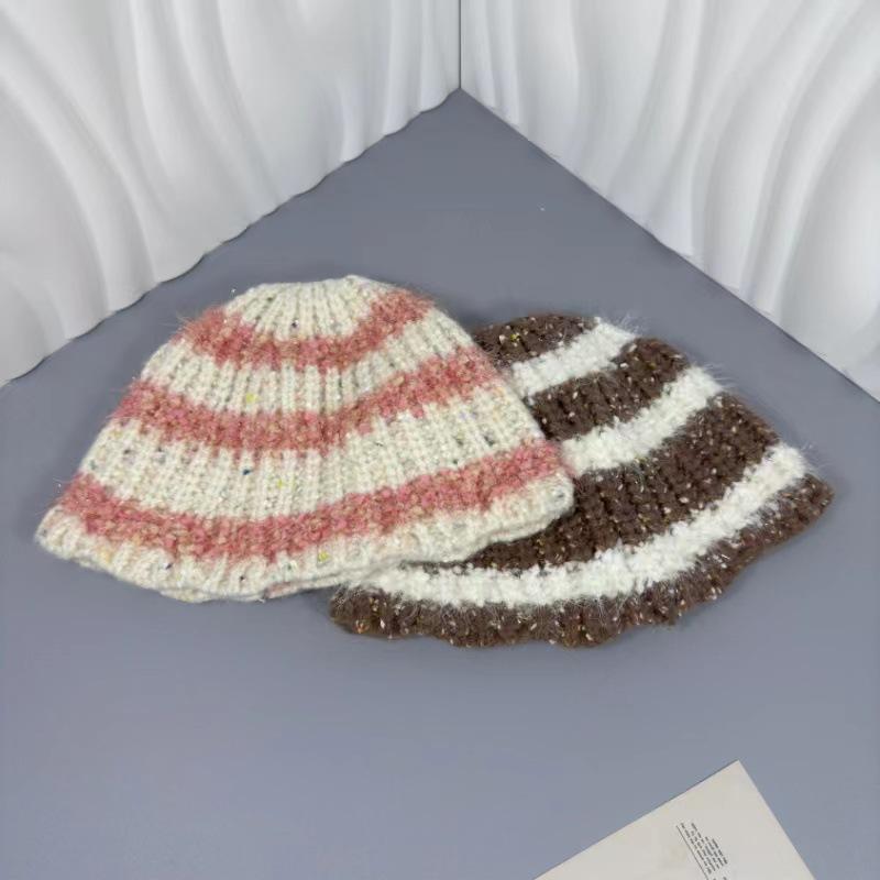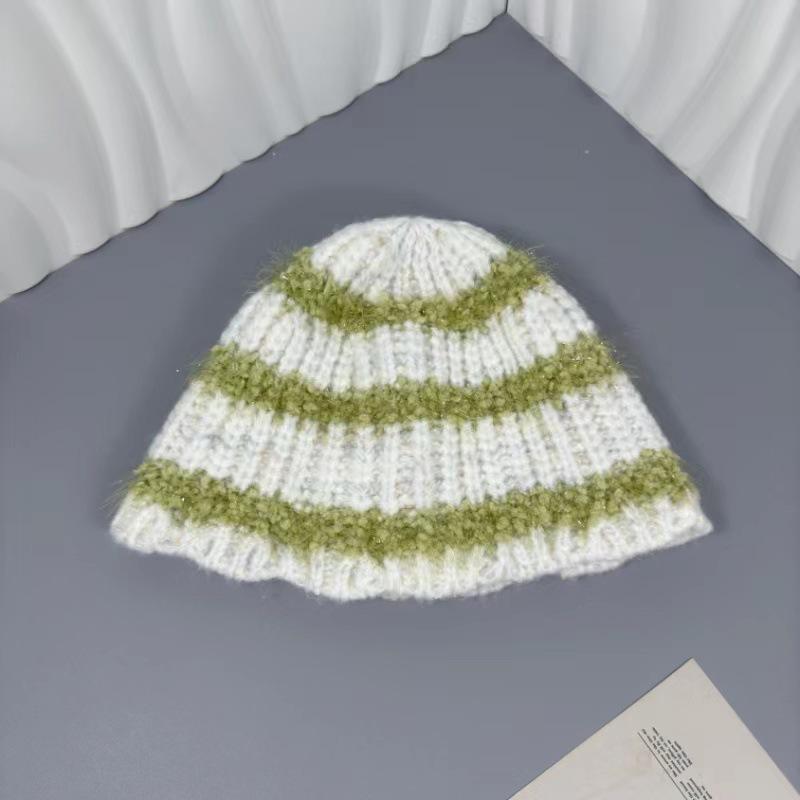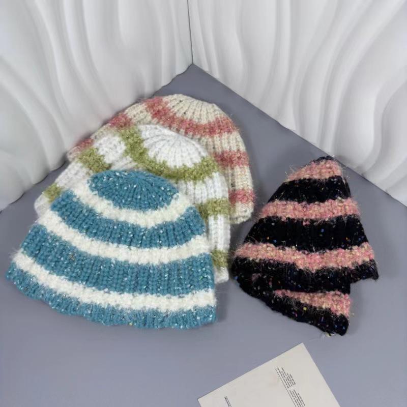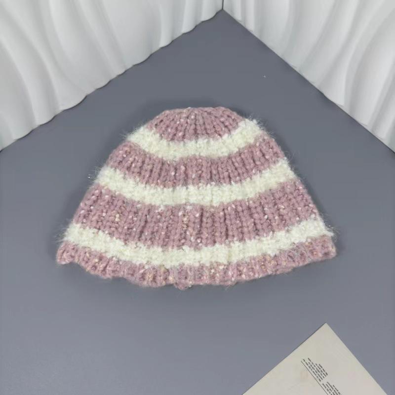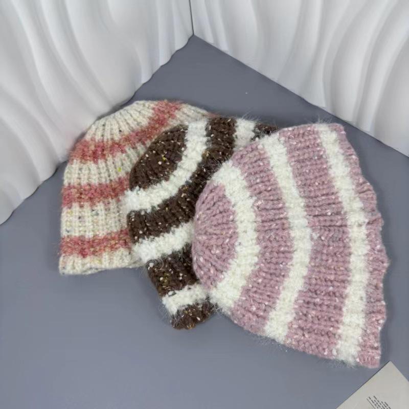 Nuevo gorro de pescador a rayas para mujer, de otoño e invierno, cálido, con protección para las orejas, tejido de felpa, estilo coreano, de lana combinable.