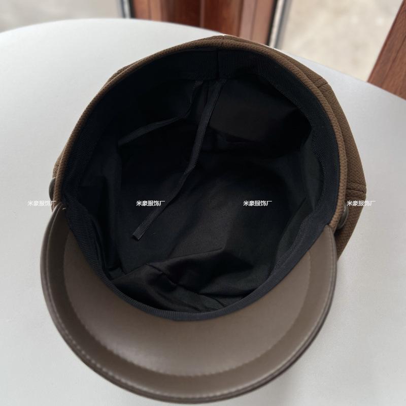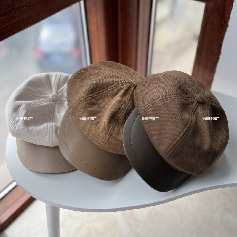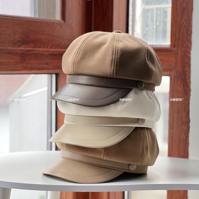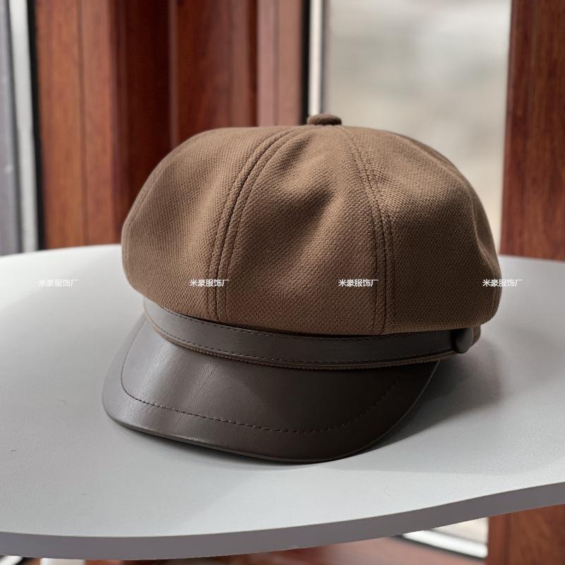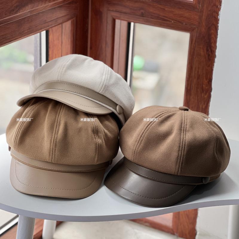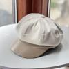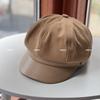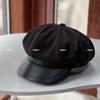 Sombrero de vendedor de periódicos de cuero con costuras artísticas de lana estilo británico vintage, sombrero octogonal pequeño a la moda, boina lisa de todo fósforo.