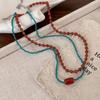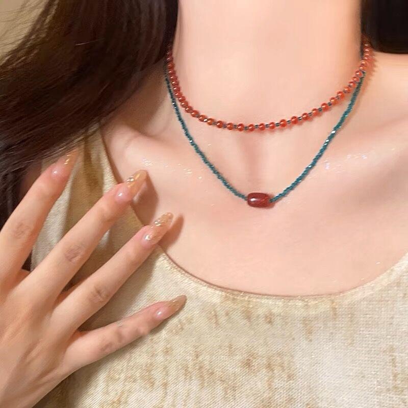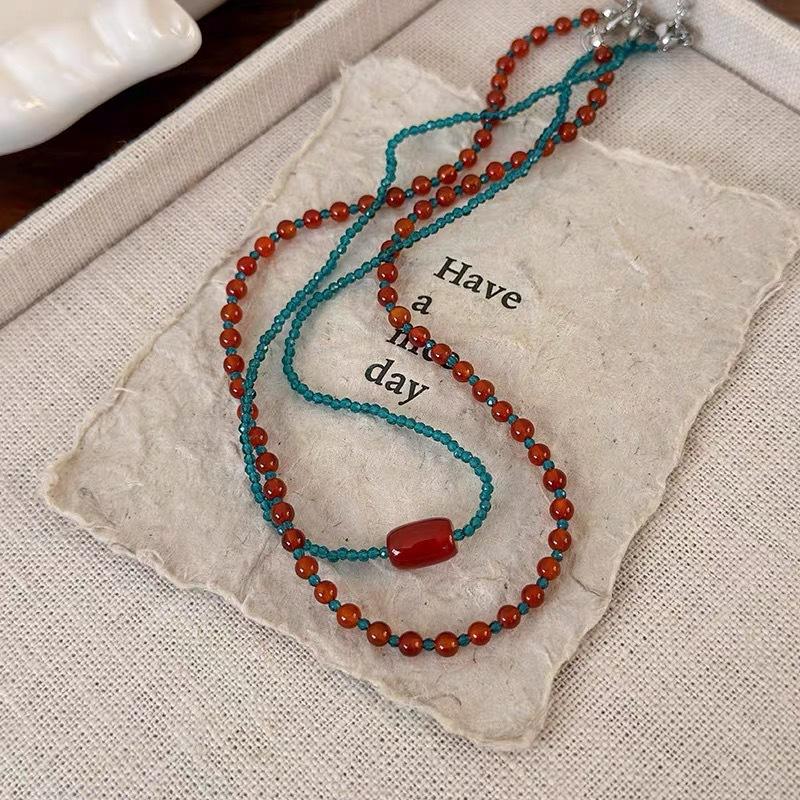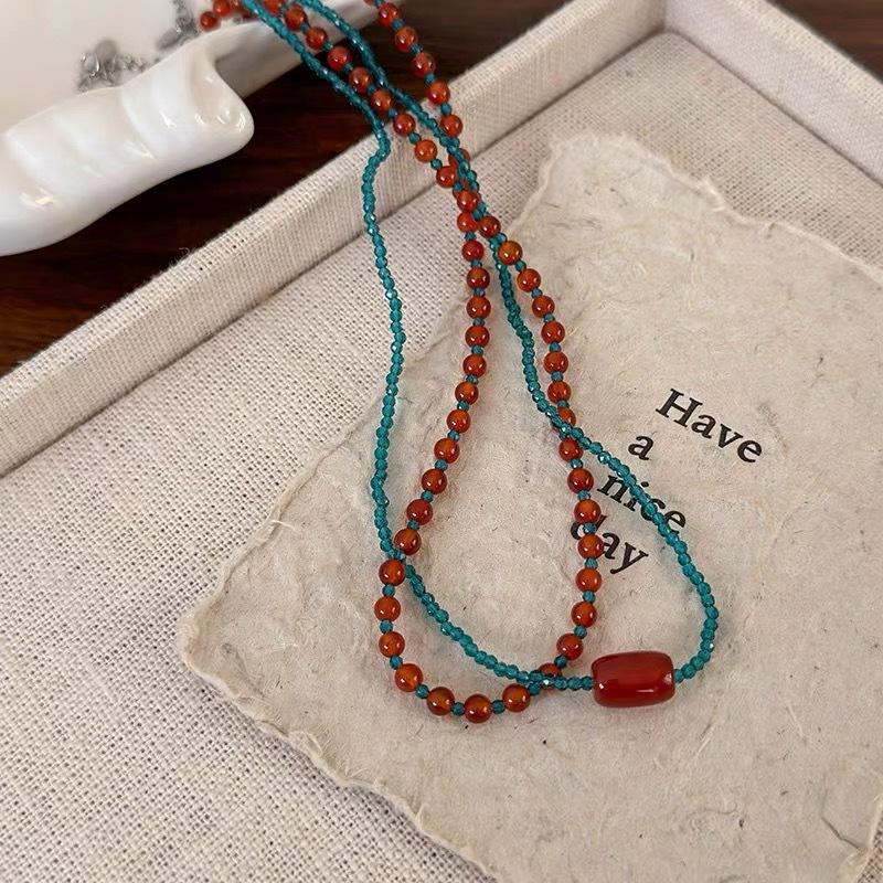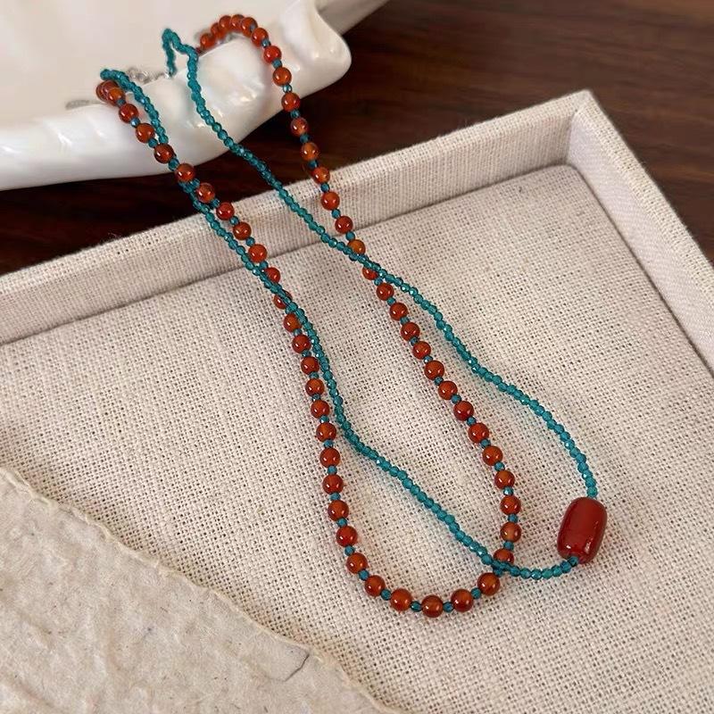 Collar vintage con cuentas de cristal en contraste rojo y azul, pulsera de estilo nacional, elegante collar con cadena para clavícula para mujer.