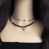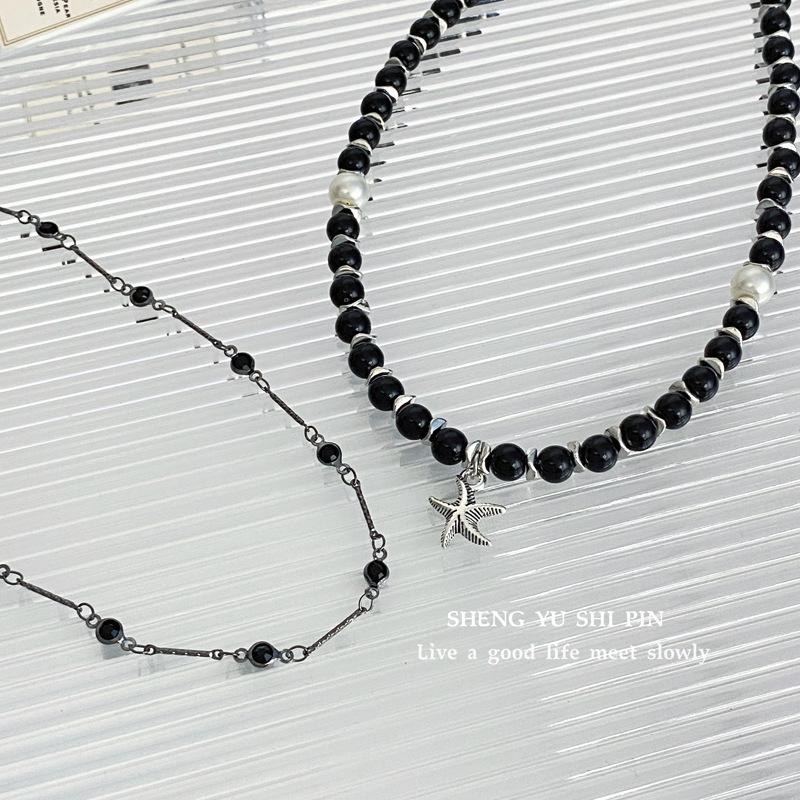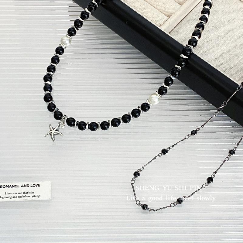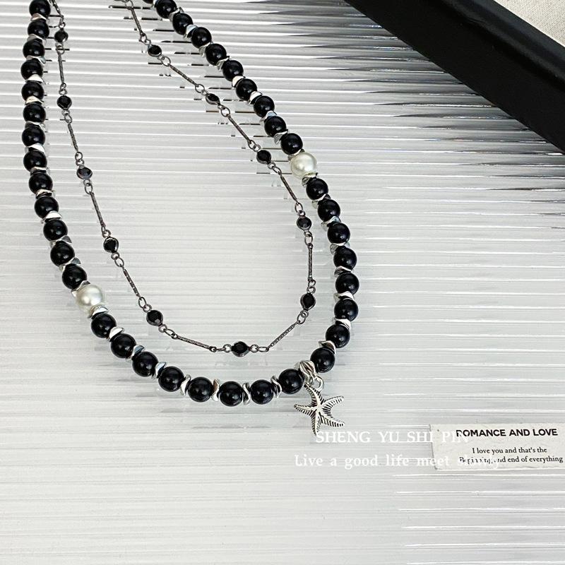 Collar negro estilo punk transfronterizo europeo y americano con colgante de estrella de mar apilada y cadena de clavícula de doble capa con cuentas, collar de moda para viajeros.