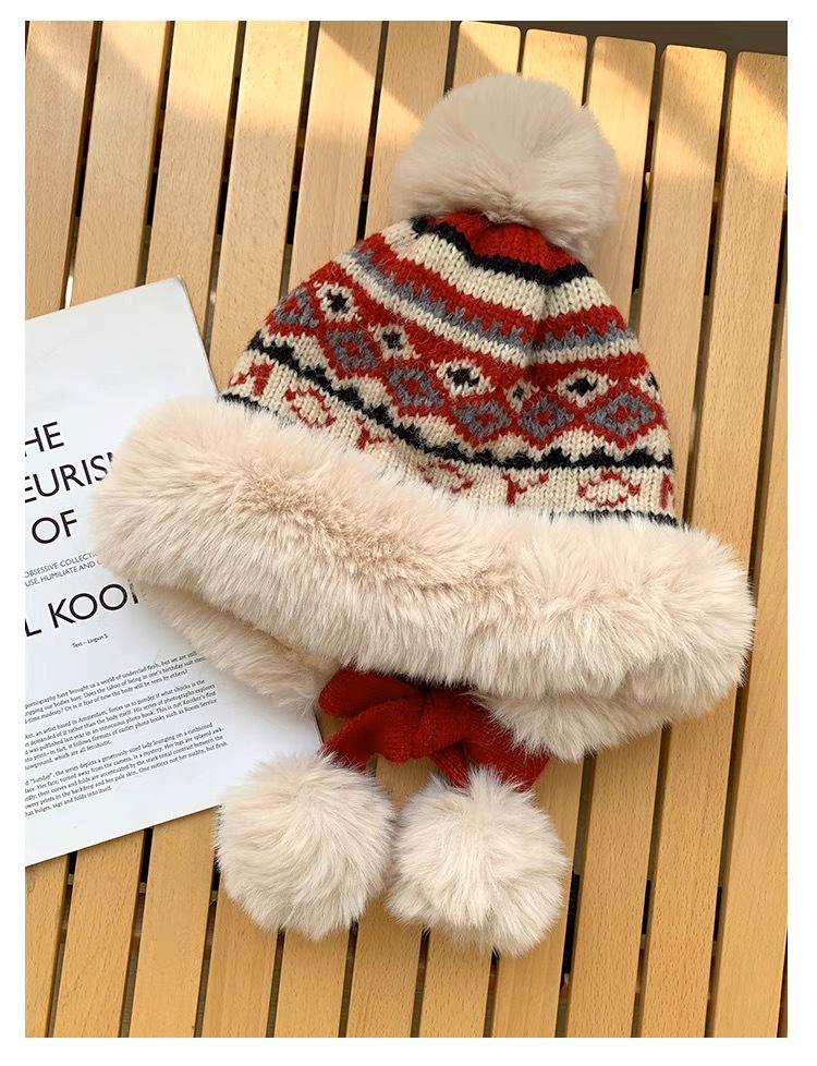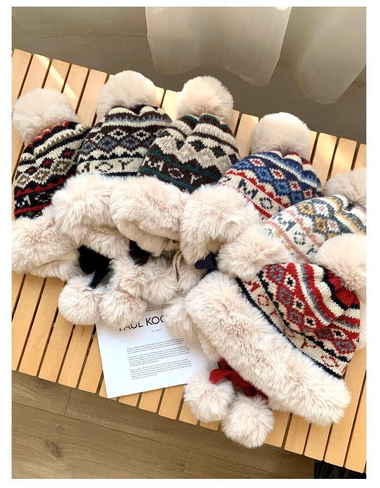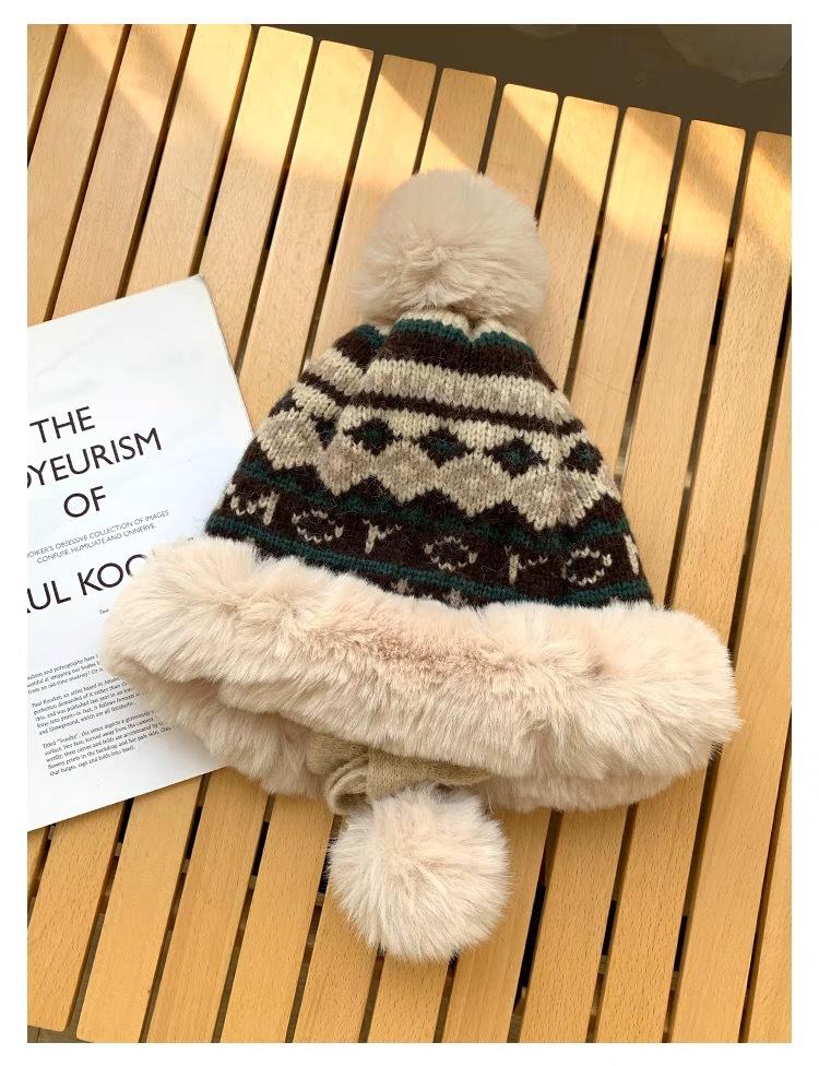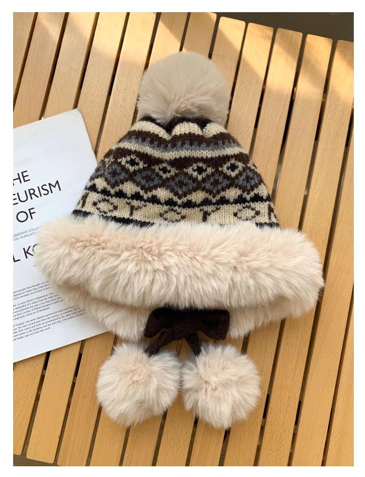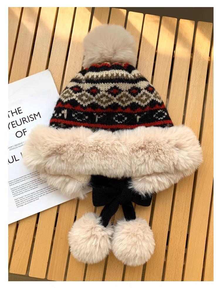 Gorro de punto de felpa estilo étnico retro para mujer, cálido, grueso, resistente al frío, de lana con orejas dulces, para otoño e invierno, Lei Feng